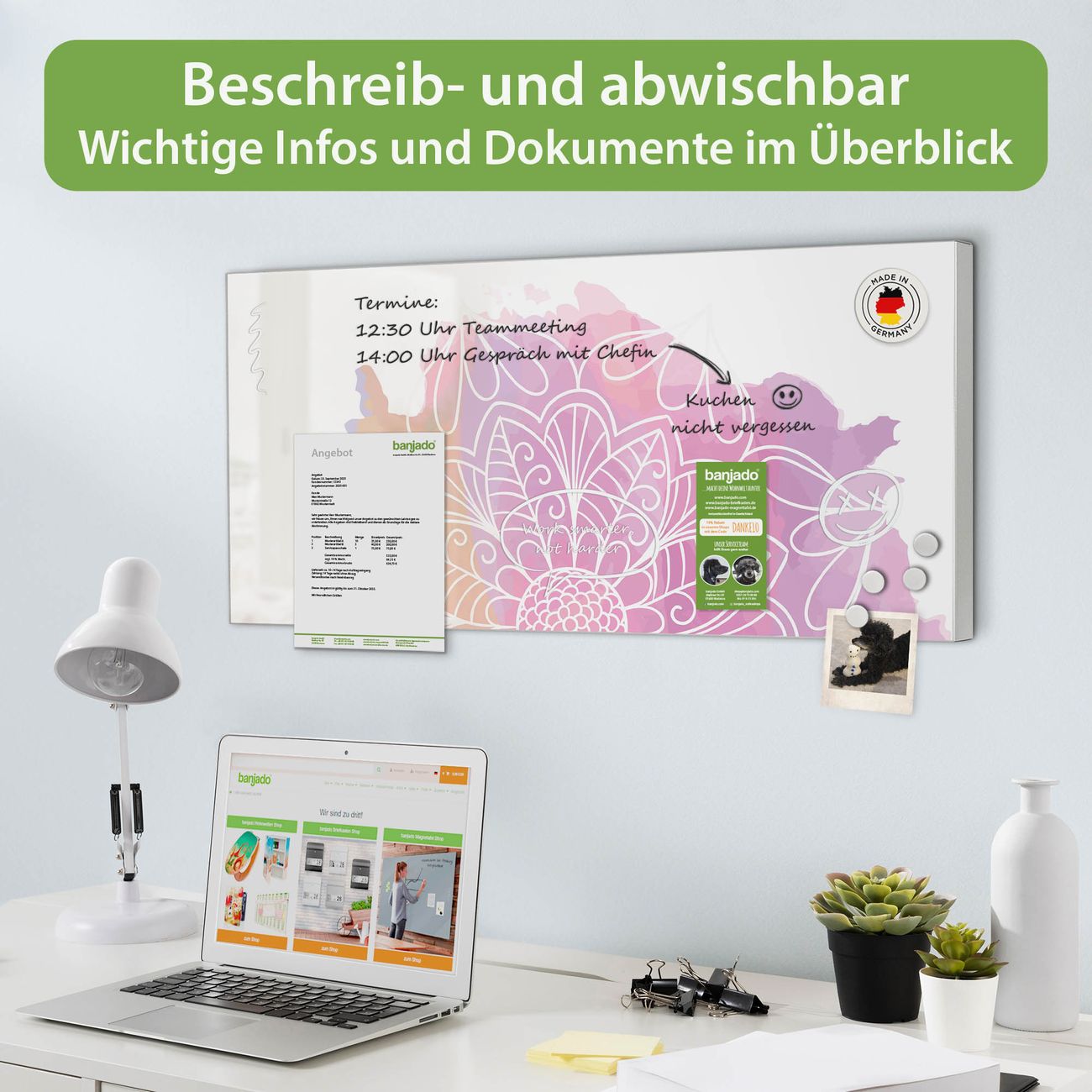 FUNKTION: Die banjado Magnettafel 78x37 cm im Design Motiv Buntes Mandala vereint Funktionalität und modernes Wohndesign auf stilvolle Weise. Diese hochwertige Magnetwand aus Metall hilft Ihnen dabei, Notizen, Fotos, Termine, Einkaufslisten oder Rezepte übersichtlich zu organisieren. Als praktisches Memoboard sorgt sie für Struktur im Alltag und setzt gleichzeitig einen dekorativen Akzent an Ihrer Wand. DESIGN: Die Metalltafel besteht aus robustem, lackiertem Stahl und ist mit allen handelsüblichen Magneten nutzbar. Besonders praktisch ist die beschreibbare Oberfläche. Sie können die Magnettafel ganz einfach mit Kreidestiften beschriften und die Inhalte bei Bedarf mit einem feuchten Tuch wieder entfernen. So eignet sich das Memoboard ideal für Wochenpläne, Menüpläne, To Do Listen oder kreative Botschaften. DETAILS: Mit ihrem großzügigen Querformat von 78x37 cm bietet die Magnettafel ausreichend Platz für Ihre Organisation. Das Motiv Motiv Buntes Mandala bringt eine warme, natürliche Optik in Küche, Flur, Büro oder Homeoffice und wirkt auch ohne Magnete oder Beschriftung wie ein modernes Wandbild. NUTZEN: Auf der Rückseite befinden sich vorgefertigte Löcher für eine schnelle und unkomplizierte Wandmontage. Jede banjado Magnettafel wird in Deutschland gefertigt und steht für Qualität, Langlebigkeit und liebevolle Verarbeitung. Dieses beschreibbare Memoboard ist die perfekte Kombination aus Metalltafel, Designobjekt und praktischer Magnetwand für Ihren Alltag. BANJADO: Wir sind ein kleines Team aus dem Herzen von Sachsen. Wir fertigen alle Artikel von Hand für Sie an, Sie erhalten keine preiswerte Importware. Auf Wunsch können Sie auch Ihr eigenes Foto auf die Magnettafel aufbringen, schreiben Sie uns an. Herzlichst, Ihr banjado-Team