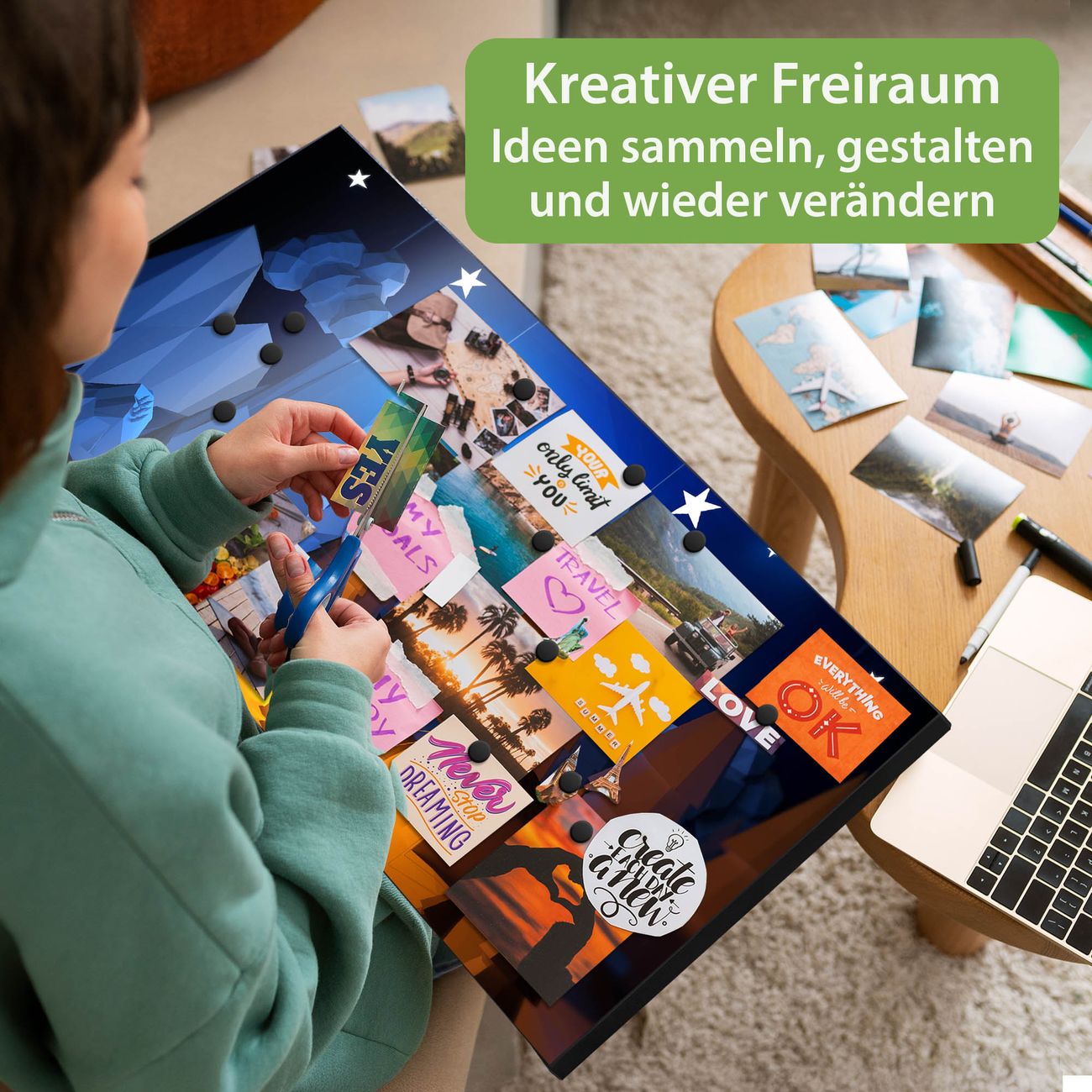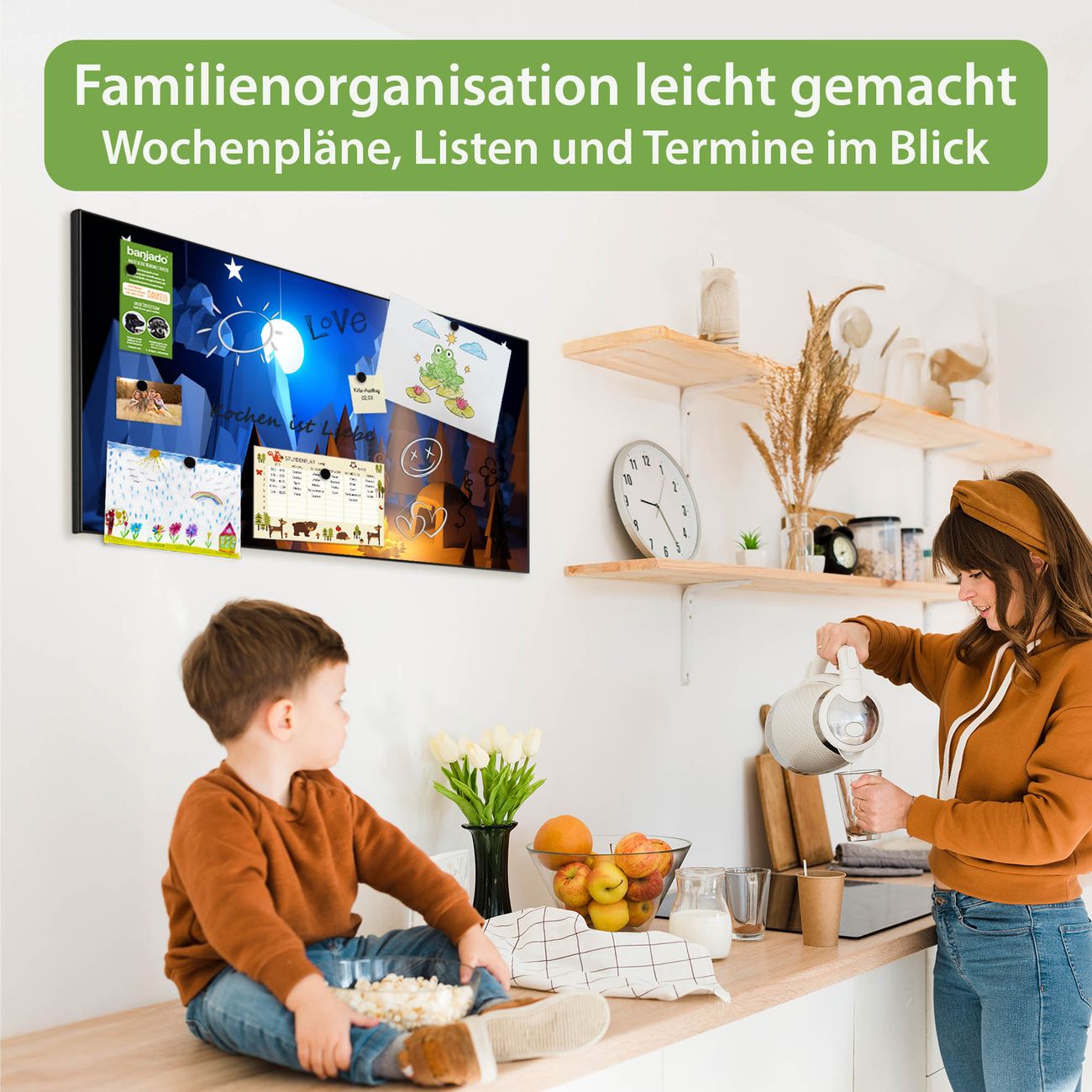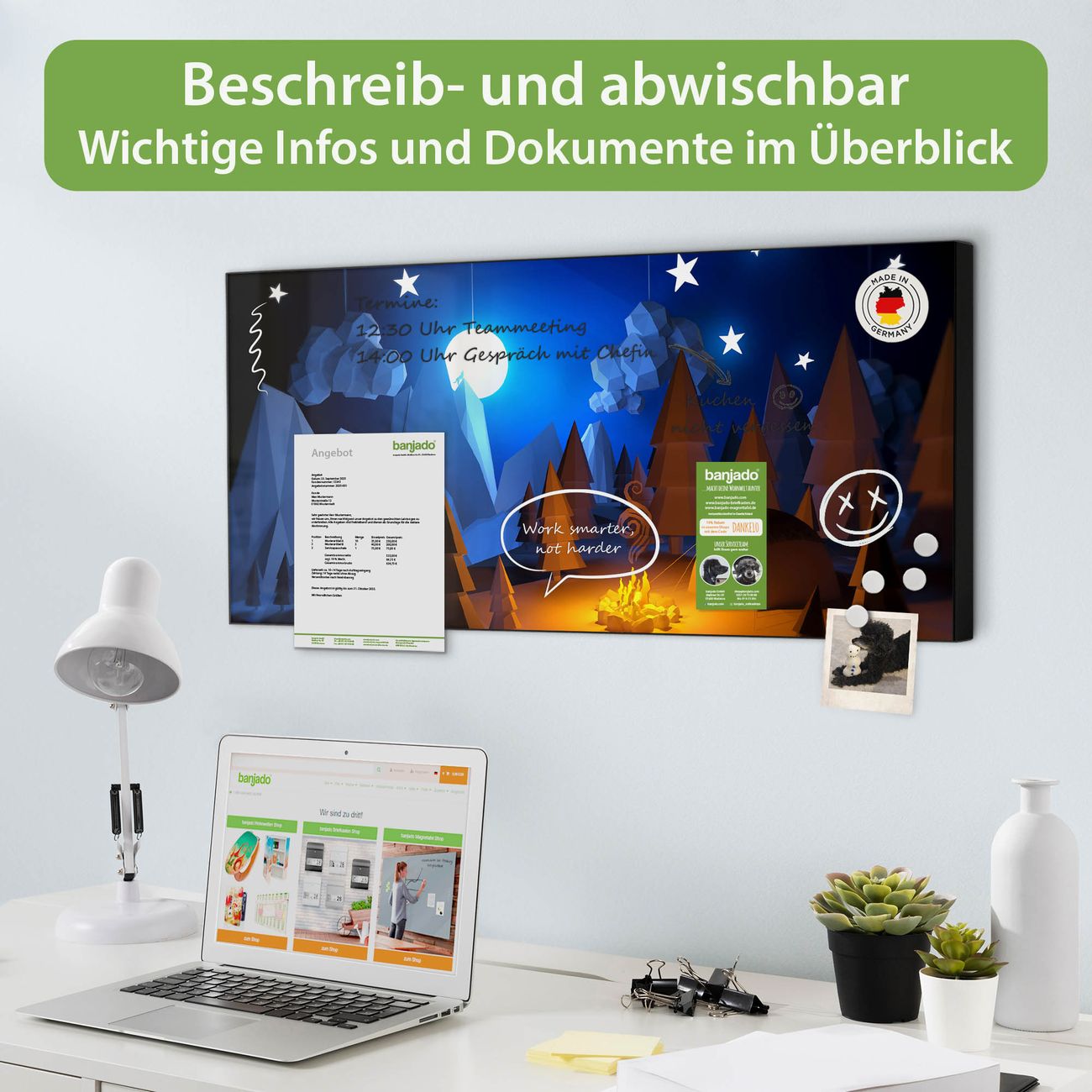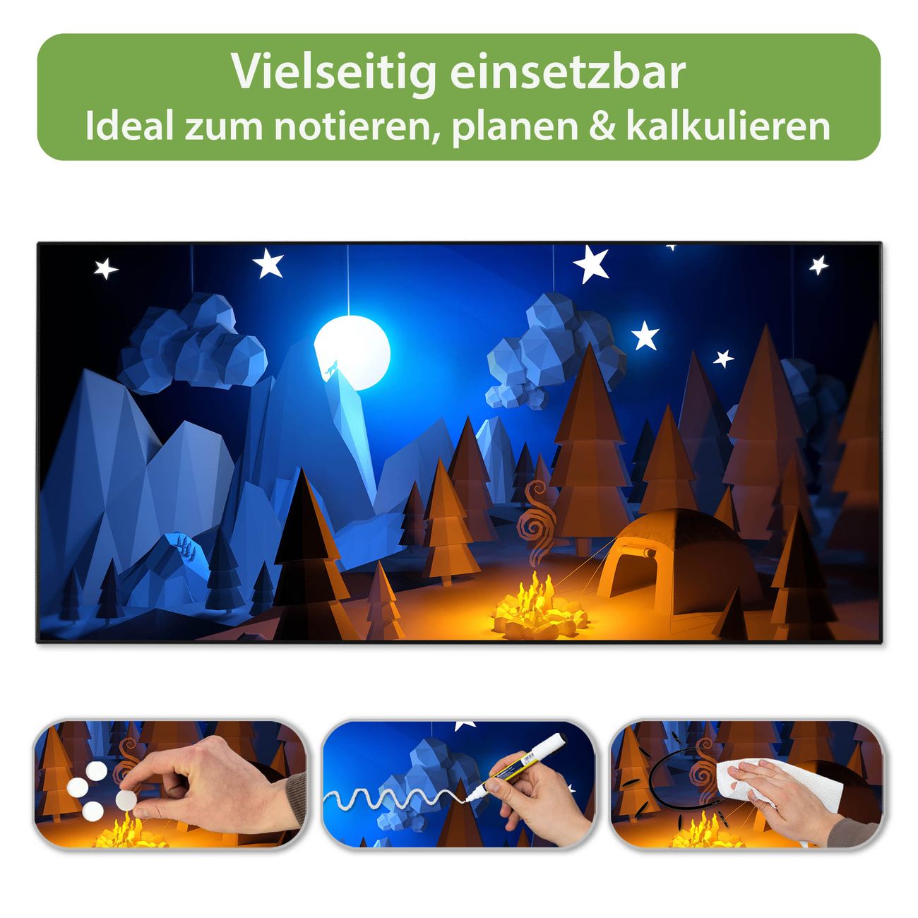 FUNKTION: Die banjado Magnettafel 78x37 cm im Design Motiv Camping 2 vereint Funktionalität und modernes Wohndesign auf stilvolle Weise. Diese hochwertige Magnetwand aus Metall hilft Ihnen dabei, Notizen, Fotos, Termine, Einkaufslisten oder Rezepte übersichtlich zu organisieren. Als praktisches Memoboard sorgt sie für Struktur im Alltag und setzt gleichzeitig einen dekorativen Akzent an Ihrer Wand. DESIGN: Die Metalltafel besteht aus robustem, lackiertem Stahl und ist mit allen handelsüblichen Magneten nutzbar. Besonders praktisch ist die beschreibbare Oberfläche. Sie können die Magnettafel ganz einfach mit Kreidestiften beschriften und die Inhalte bei Bedarf mit einem feuchten Tuch wieder entfernen. So eignet sich das Memoboard ideal für Wochenpläne, Menüpläne, To Do Listen oder kreative Botschaften. DETAILS: Mit ihrem großzügigen Querformat von 78x37 cm bietet die Magnettafel ausreichend Platz für Ihre Organisation. Das Motiv Motiv Camping 2 bringt eine warme, natürliche Optik in Küche, Flur, Büro oder Homeoffice und wirkt auch ohne Magnete oder Beschriftung wie ein modernes Wandbild. NUTZEN: Auf der Rückseite befinden sich vorgefertigte Löcher für eine schnelle und unkomplizierte Wandmontage. Jede banjado Magnettafel wird in Deutschland gefertigt und steht für Qualität, Langlebigkeit und liebevolle Verarbeitung. Dieses beschreibbare Memoboard ist die perfekte Kombination aus Metalltafel, Designobjekt und praktischer Magnetwand für Ihren Alltag. BANJADO: Wir sind ein kleines Team aus dem Herzen von Sachsen. Wir fertigen alle Artikel von Hand für Sie an, Sie erhalten keine preiswerte Importware. Auf Wunsch können Sie auch Ihr eigenes Foto auf die Magnettafel aufbringen, schreiben Sie uns an. Herzlichst, Ihr banjado-Team