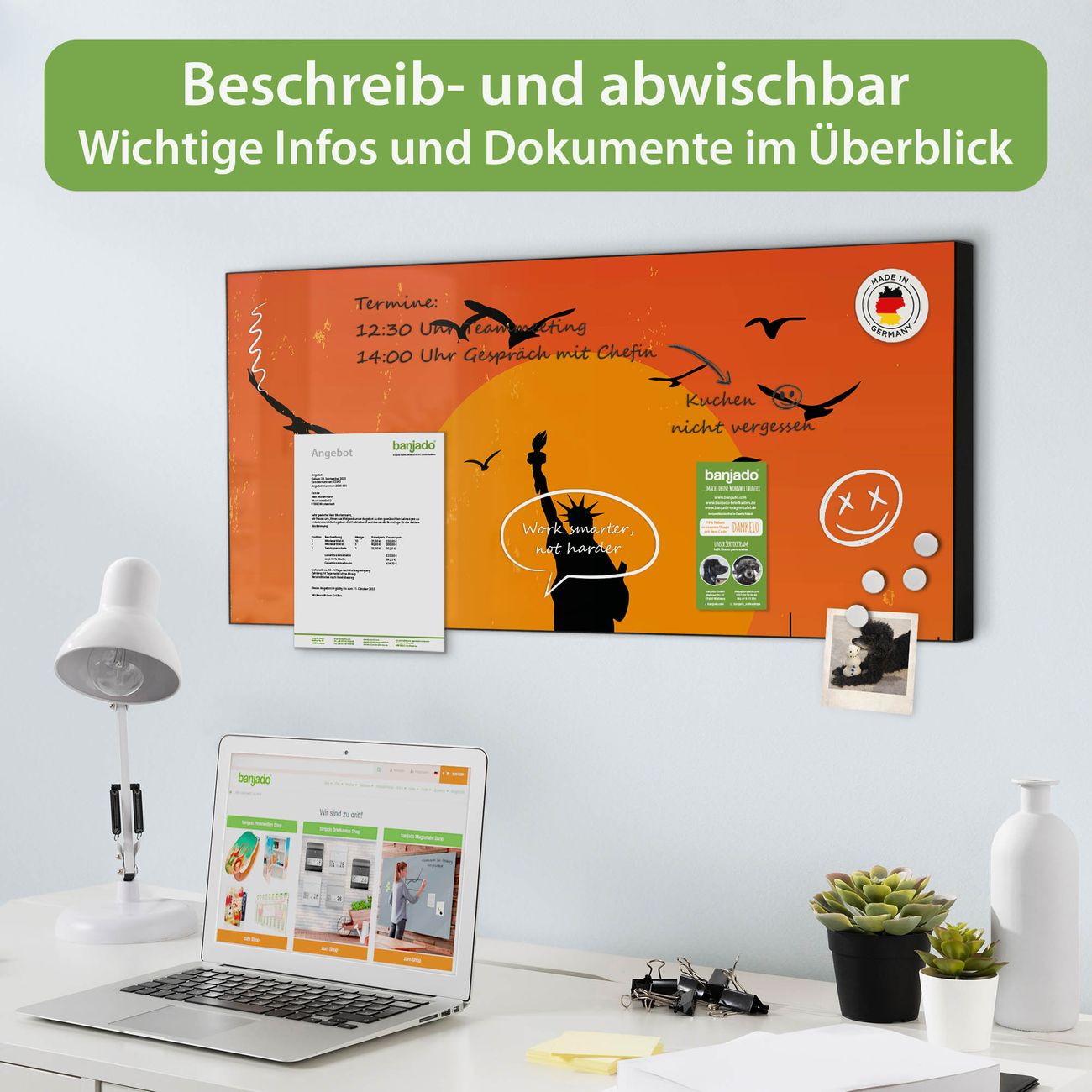 FUNKTION: Die banjado Magnettafel 78x37 cm im Design Motiv City Poster New York vereint Funktionalität und modernes Wohndesign auf stilvolle Weise. Diese hochwertige Magnetwand aus Metall hilft Ihnen dabei, Notizen, Fotos, Termine, Einkaufslisten oder Rezepte übersichtlich zu organisieren. Als praktisches Memoboard sorgt sie für Struktur im Alltag und setzt gleichzeitig einen dekorativen Akzent an Ihrer Wand. DESIGN: Die Metalltafel besteht aus robustem, lackiertem Stahl und ist mit allen handelsüblichen Magneten nutzbar. Besonders praktisch ist die beschreibbare Oberfläche. Sie können die Magnettafel ganz einfach mit Kreidestiften beschriften und die Inhalte bei Bedarf mit einem feuchten Tuch wieder entfernen. So eignet sich das Memoboard ideal für Wochenpläne, Menüpläne, To Do Listen oder kreative Botschaften. DETAILS: Mit ihrem großzügigen Querformat von 78x37 cm bietet die Magnettafel ausreichend Platz für Ihre Organisation. Das Motiv Motiv City Poster New York bringt eine warme, natürliche Optik in Küche, Flur, Büro oder Homeoffice und wirkt auch ohne Magnete oder Beschriftung wie ein modernes Wandbild. NUTZEN: Auf der Rückseite befinden sich vorgefertigte Löcher für eine schnelle und unkomplizierte Wandmontage. Jede banjado Magnettafel wird in Deutschland gefertigt und steht für Qualität, Langlebigkeit und liebevolle Verarbeitung. Dieses beschreibbare Memoboard ist die perfekte Kombination aus Metalltafel, Designobjekt und praktischer Magnetwand für Ihren Alltag. BANJADO: Wir sind ein kleines Team aus dem Herzen von Sachsen. Wir fertigen alle Artikel von Hand für Sie an, Sie erhalten keine preiswerte Importware. Auf Wunsch können Sie auch Ihr eigenes Foto auf die Magnettafel aufbringen, schreiben Sie uns an. Herzlichst, Ihr banjado-Team