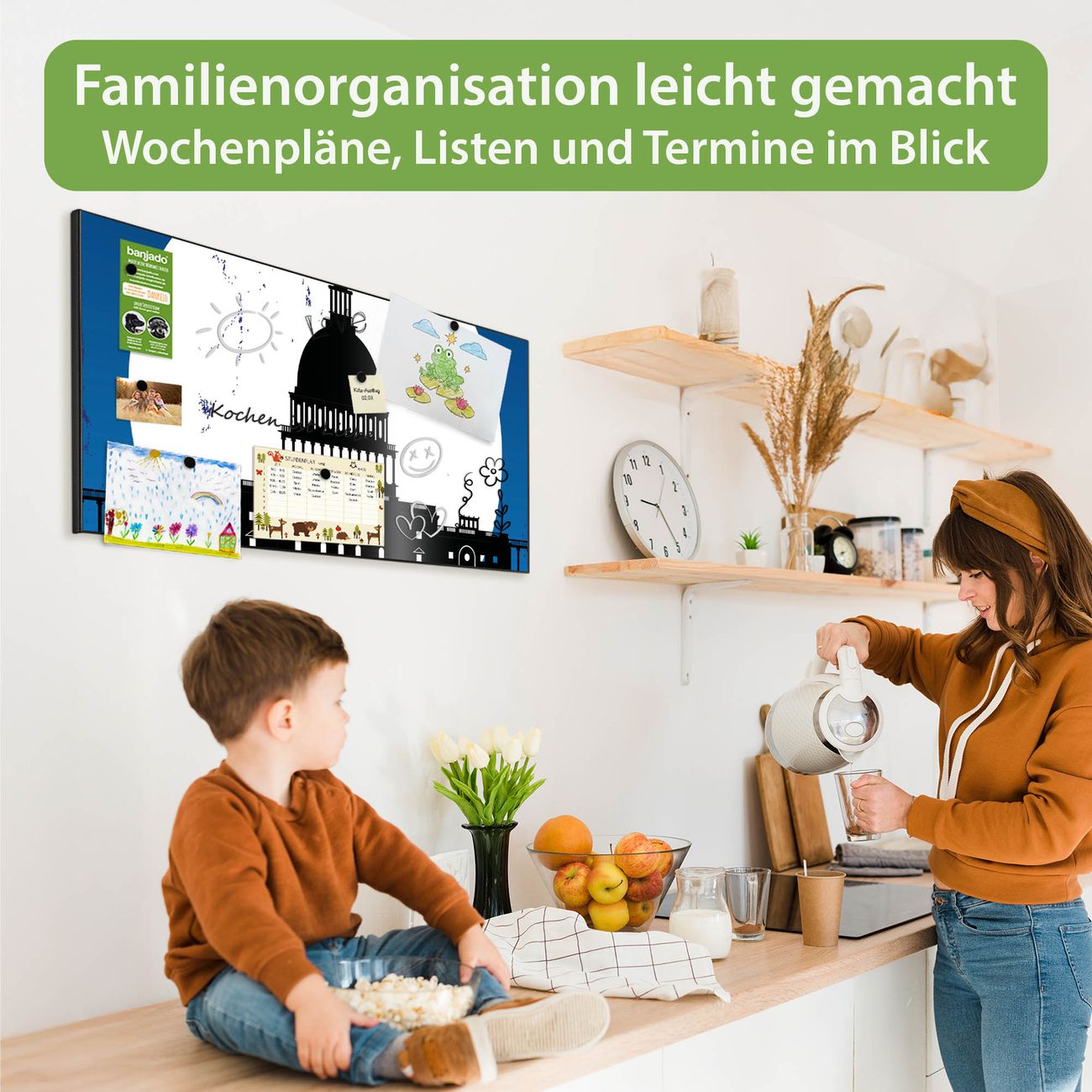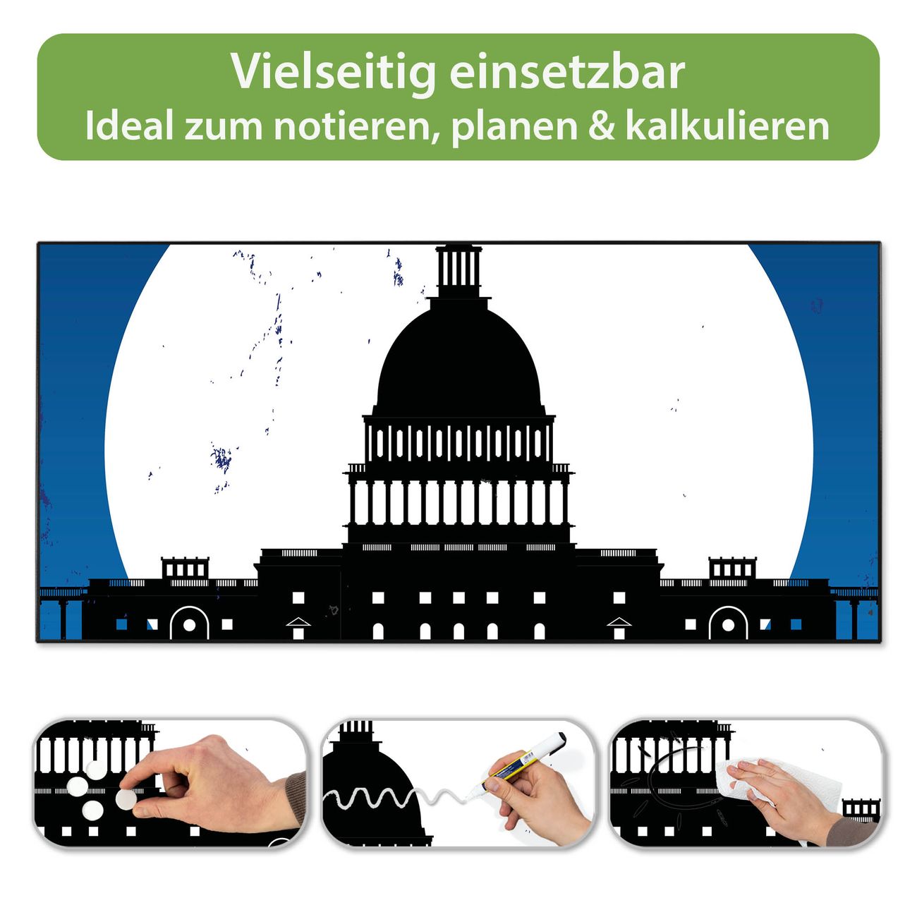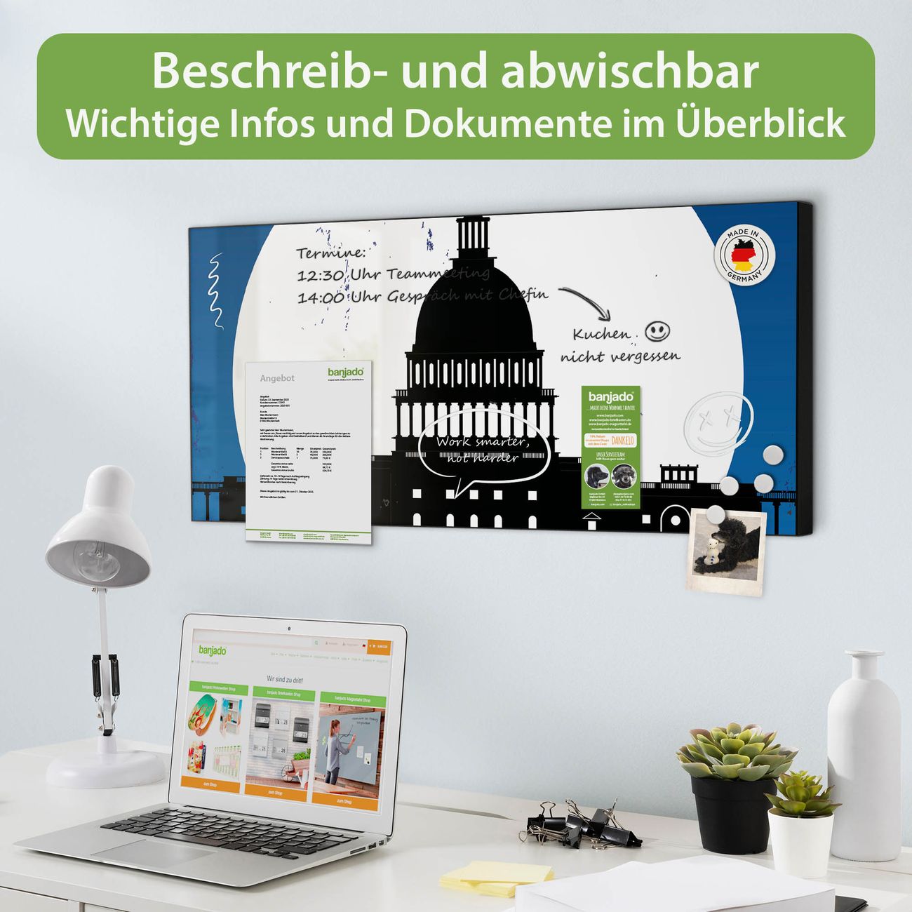 FUNKTION: Die banjado Magnettafel 78x37 cm im Design Motiv City Poster Washington vereint Funktionalität und modernes Wohndesign auf stilvolle Weise. Diese hochwertige Magnetwand aus Metall hilft Ihnen dabei, Notizen, Fotos, Termine, Einkaufslisten oder Rezepte übersichtlich zu organisieren. Als praktisches Memoboard sorgt sie für Struktur im Alltag und setzt gleichzeitig einen dekorativen Akzent an Ihrer Wand. DESIGN: Die Metalltafel besteht aus robustem, lackiertem Stahl und ist mit allen handelsüblichen Magneten nutzbar. Besonders praktisch ist die beschreibbare Oberfläche. Sie können die Magnettafel ganz einfach mit Kreidestiften beschriften und die Inhalte bei Bedarf mit einem feuchten Tuch wieder entfernen. So eignet sich das Memoboard ideal für Wochenpläne, Menüpläne, To Do Listen oder kreative Botschaften. DETAILS: Mit ihrem großzügigen Querformat von 78x37 cm bietet die Magnettafel ausreichend Platz für Ihre Organisation. Das Motiv Motiv City Poster Washington bringt eine warme, natürliche Optik in Küche, Flur, Büro oder Homeoffice und wirkt auch ohne Magnete oder Beschriftung wie ein modernes Wandbild. NUTZEN: Auf der Rückseite befinden sich vorgefertigte Löcher für eine schnelle und unkomplizierte Wandmontage. Jede banjado Magnettafel wird in Deutschland gefertigt und steht für Qualität, Langlebigkeit und liebevolle Verarbeitung. Dieses beschreibbare Memoboard ist die perfekte Kombination aus Metalltafel, Designobjekt und praktischer Magnetwand für Ihren Alltag. BANJADO: Wir sind ein kleines Team aus dem Herzen von Sachsen. Wir fertigen alle Artikel von Hand für Sie an, Sie erhalten keine preiswerte Importware. Auf Wunsch können Sie auch Ihr eigenes Foto auf die Magnettafel aufbringen, schreiben Sie uns an. Herzlichst, Ihr banjado-Team