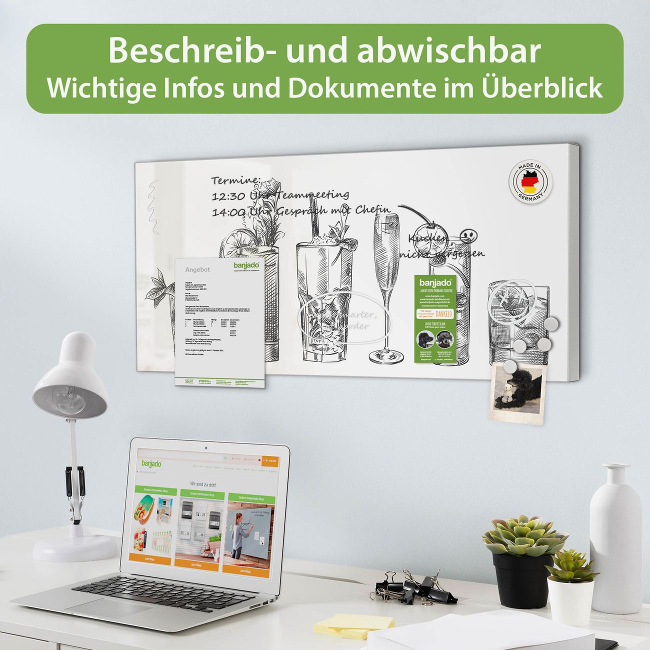 FUNKTION: Die banjado Magnettafel 78x37 cm im Design Motiv Cocktail Skizzen vereint Funktionalität und modernes Wohndesign auf stilvolle Weise. Diese hochwertige Magnetwand aus Metall hilft Ihnen dabei, Notizen, Fotos, Termine, Einkaufslisten oder Rezepte übersichtlich zu organisieren. Als praktisches Memoboard sorgt sie für Struktur im Alltag und setzt gleichzeitig einen dekorativen Akzent an Ihrer Wand. DESIGN: Die Metalltafel besteht aus robustem, lackiertem Stahl und ist mit allen handelsüblichen Magneten nutzbar. Besonders praktisch ist die beschreibbare Oberfläche. Sie können die Magnettafel ganz einfach mit Kreidestiften beschriften und die Inhalte bei Bedarf mit einem feuchten Tuch wieder entfernen. So eignet sich das Memoboard ideal für Wochenpläne, Menüpläne, To Do Listen oder kreative Botschaften. DETAILS: Mit ihrem großzügigen Querformat von 78x37 cm bietet die Magnettafel ausreichend Platz für Ihre Organisation. Das Motiv Motiv Cocktail Skizzen bringt eine warme, natürliche Optik in Küche, Flur, Büro oder Homeoffice und wirkt auch ohne Magnete oder Beschriftung wie ein modernes Wandbild. NUTZEN: Auf der Rückseite befinden sich vorgefertigte Löcher für eine schnelle und unkomplizierte Wandmontage. Jede banjado Magnettafel wird in Deutschland gefertigt und steht für Qualität, Langlebigkeit und liebevolle Verarbeitung. Dieses beschreibbare Memoboard ist die perfekte Kombination aus Metalltafel, Designobjekt und praktischer Magnetwand für Ihren Alltag. BANJADO: Wir sind ein kleines Team aus dem Herzen von Sachsen. Wir fertigen alle Artikel von Hand für Sie an, Sie erhalten keine preiswerte Importware. Auf Wunsch können Sie auch Ihr eigenes Foto auf die Magnettafel aufbringen, schreiben Sie uns an. Herzlichst, Ihr banjado-Team