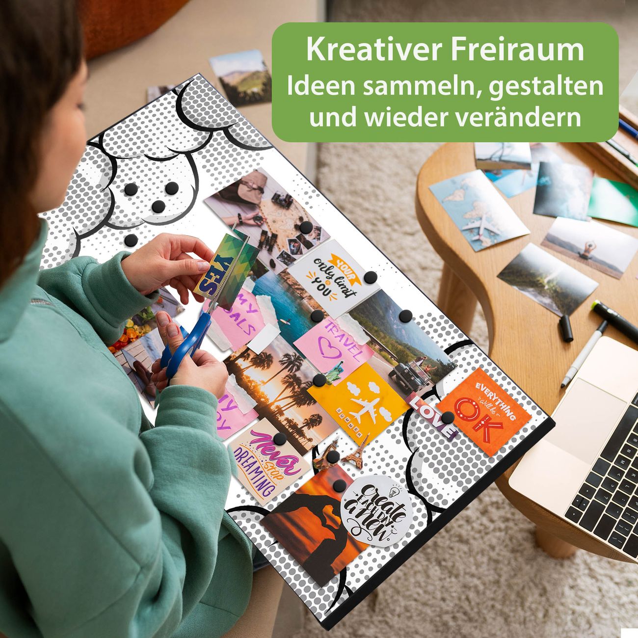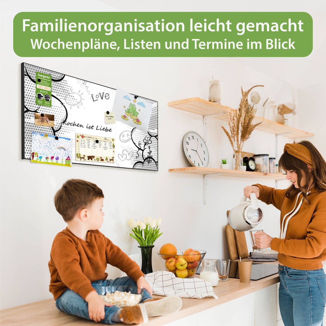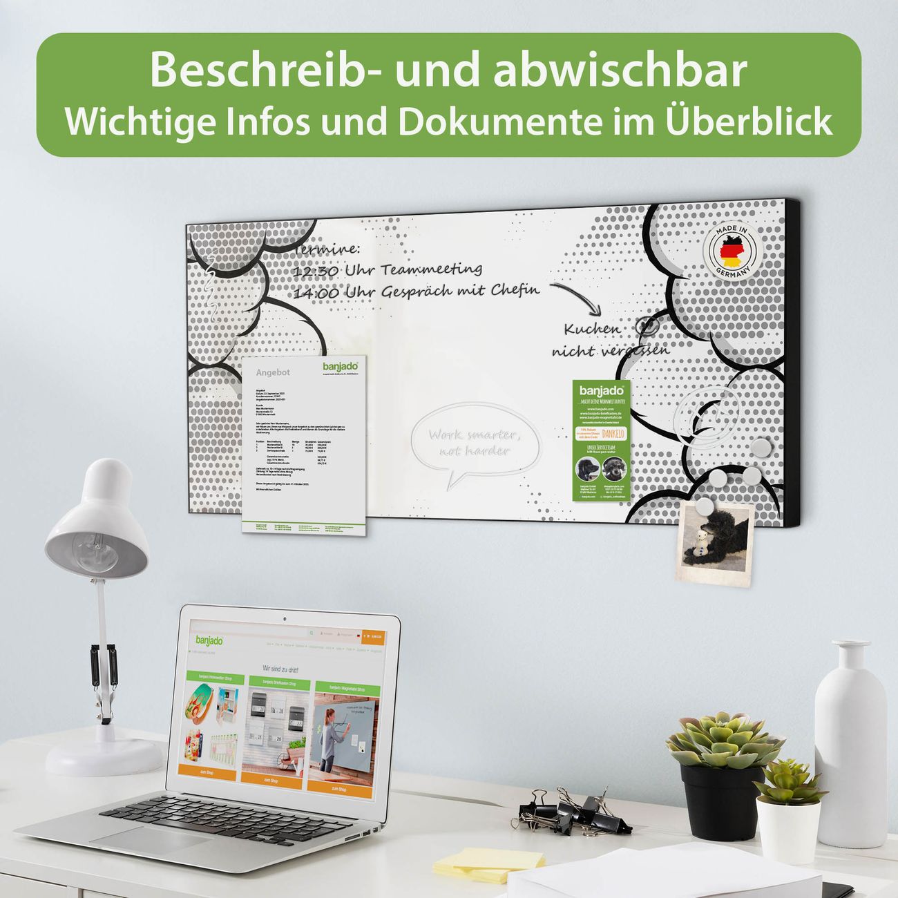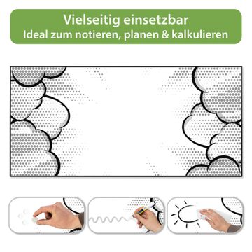 FUNKTION: Die banjado Magnettafel 78x37 cm im Design Motiv Comic Explosion vereint Funktionalität und modernes Wohndesign auf stilvolle Weise. Diese hochwertige Magnetwand aus Metall hilft Ihnen dabei, Notizen, Fotos, Termine, Einkaufslisten oder Rezepte übersichtlich zu organisieren. Als praktisches Memoboard sorgt sie für Struktur im Alltag und setzt gleichzeitig einen dekorativen Akzent an Ihrer Wand. DESIGN: Die Metalltafel besteht aus robustem, lackiertem Stahl und ist mit allen handelsüblichen Magneten nutzbar. Besonders praktisch ist die beschreibbare Oberfläche. Sie können die Magnettafel ganz einfach mit Kreidestiften beschriften und die Inhalte bei Bedarf mit einem feuchten Tuch wieder entfernen. So eignet sich das Memoboard ideal für Wochenpläne, Menüpläne, To Do Listen oder kreative Botschaften. DETAILS: Mit ihrem großzügigen Querformat von 78x37 cm bietet die Magnettafel ausreichend Platz für Ihre Organisation. Das Motiv Motiv Comic Explosion bringt eine warme, natürliche Optik in Küche, Flur, Büro oder Homeoffice und wirkt auch ohne Magnete oder Beschriftung wie ein modernes Wandbild. NUTZEN: Auf der Rückseite befinden sich vorgefertigte Löcher für eine schnelle und unkomplizierte Wandmontage. Jede banjado Magnettafel wird in Deutschland gefertigt und steht für Qualität, Langlebigkeit und liebevolle Verarbeitung. Dieses beschreibbare Memoboard ist die perfekte Kombination aus Metalltafel, Designobjekt und praktischer Magnetwand für Ihren Alltag. BANJADO: Wir sind ein kleines Team aus dem Herzen von Sachsen. Wir fertigen alle Artikel von Hand für Sie an, Sie erhalten keine preiswerte Importware. Auf Wunsch können Sie auch Ihr eigenes Foto auf die Magnettafel aufbringen, schreiben Sie uns an. Herzlichst, Ihr banjado-Team