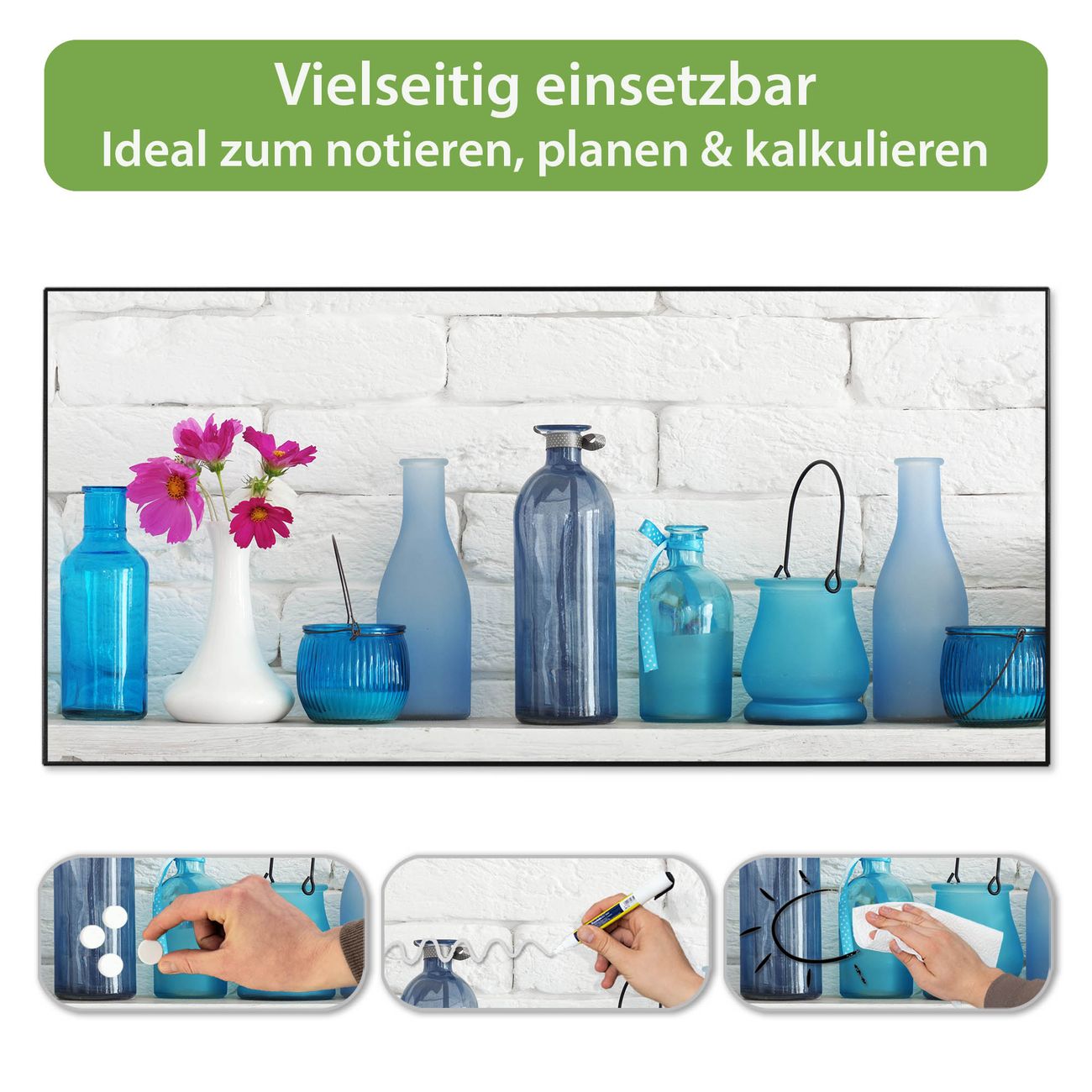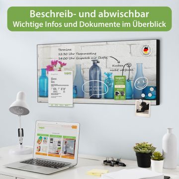 FUNKTION: Die banjado Magnettafel 78x37 cm im Design Motiv Dekoartikel Blau vereint Funktionalität und modernes Wohndesign auf stilvolle Weise. Diese hochwertige Magnetwand aus Metall hilft Ihnen dabei, Notizen, Fotos, Termine, Einkaufslisten oder Rezepte übersichtlich zu organisieren. Als praktisches Memoboard sorgt sie für Struktur im Alltag und setzt gleichzeitig einen dekorativen Akzent an Ihrer Wand. DESIGN: Die Metalltafel besteht aus robustem, lackiertem Stahl und ist mit allen handelsüblichen Magneten nutzbar. Besonders praktisch ist die beschreibbare Oberfläche. Sie können die Magnettafel ganz einfach mit Kreidestiften beschriften und die Inhalte bei Bedarf mit einem feuchten Tuch wieder entfernen. So eignet sich das Memoboard ideal für Wochenpläne, Menüpläne, To Do Listen oder kreative Botschaften. DETAILS: Mit ihrem großzügigen Querformat von 78x37 cm bietet die Magnettafel ausreichend Platz für Ihre Organisation. Das Motiv Motiv Dekoartikel Blau bringt eine warme, natürliche Optik in Küche, Flur, Büro oder Homeoffice und wirkt auch ohne Magnete oder Beschriftung wie ein modernes Wandbild. NUTZEN: Auf der Rückseite befinden sich vorgefertigte Löcher für eine schnelle und unkomplizierte Wandmontage. Jede banjado Magnettafel wird in Deutschland gefertigt und steht für Qualität, Langlebigkeit und liebevolle Verarbeitung. Dieses beschreibbare Memoboard ist die perfekte Kombination aus Metalltafel, Designobjekt und praktischer Magnetwand für Ihren Alltag. BANJADO: Wir sind ein kleines Team aus dem Herzen von Sachsen. Wir fertigen alle Artikel von Hand für Sie an, Sie erhalten keine preiswerte Importware. Auf Wunsch können Sie auch Ihr eigenes Foto auf die Magnettafel aufbringen, schreiben Sie uns an. Herzlichst, Ihr banjado-Team