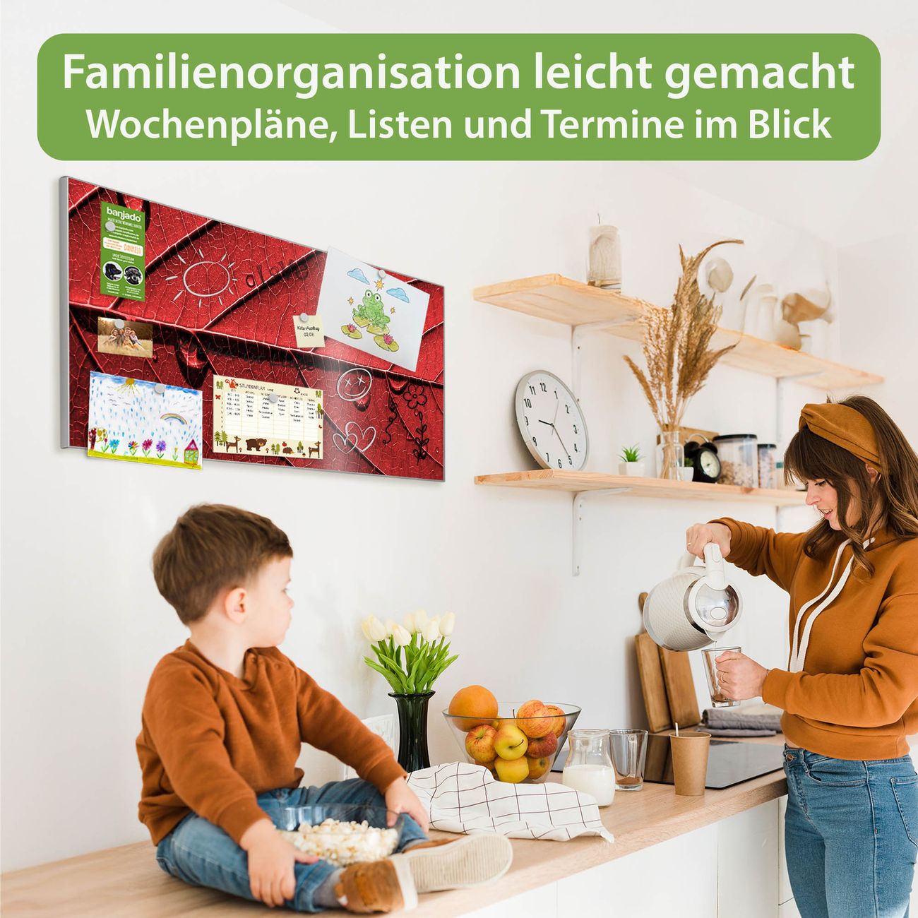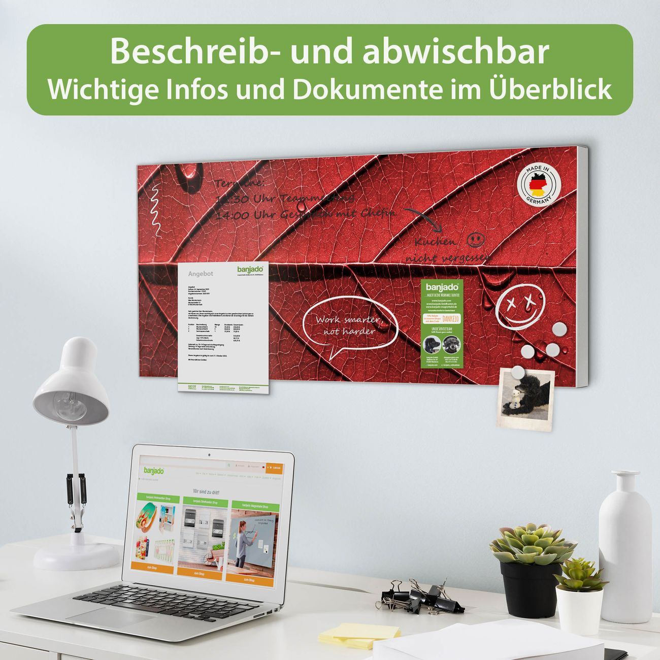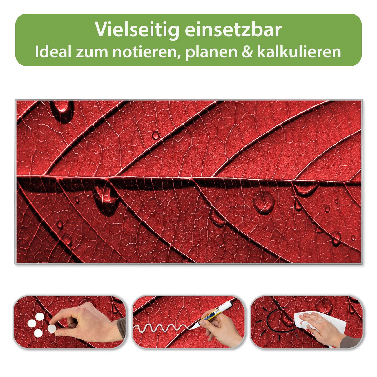FUNKTION: Die banjado Magnettafel 78x37 cm im Design Motiv Detail Blatt vereint Funktionalität und modernes Wohndesign auf stilvolle Weise. Diese hochwertige Magnetwand aus Metall hilft Ihnen dabei, Notizen, Fotos, Termine, Einkaufslisten oder Rezepte übersichtlich zu organisieren. Als praktisches Memoboard sorgt sie für Struktur im Alltag und setzt gleichzeitig einen dekorativen Akzent an Ihrer Wand. DESIGN: Die Metalltafel besteht aus robustem, lackiertem Stahl und ist mit allen handelsüblichen Magneten nutzbar. Besonders praktisch ist die beschreibbare Oberfläche. Sie können die Magnettafel ganz einfach mit Kreidestiften beschriften und die Inhalte bei Bedarf mit einem feuchten Tuch wieder entfernen. So eignet sich das Memoboard ideal für Wochenpläne, Menüpläne, To Do Listen oder kreative Botschaften. DETAILS: Mit ihrem großzügigen Querformat von 78x37 cm bietet die Magnettafel ausreichend Platz für Ihre Organisation. Das Motiv Motiv Detail Blatt bringt eine warme, natürliche Optik in Küche, Flur, Büro oder Homeoffice und wirkt auch ohne Magnete oder Beschriftung wie ein modernes Wandbild. NUTZEN: Auf der Rückseite befinden sich vorgefertigte Löcher für eine schnelle und unkomplizierte Wandmontage. Jede banjado Magnettafel wird in Deutschland gefertigt und steht für Qualität, Langlebigkeit und liebevolle Verarbeitung. Dieses beschreibbare Memoboard ist die perfekte Kombination aus Metalltafel, Designobjekt und praktischer Magnetwand für Ihren Alltag. BANJADO: Wir sind ein kleines Team aus dem Herzen von Sachsen. Wir fertigen alle Artikel von Hand für Sie an, Sie erhalten keine preiswerte Importware. Auf Wunsch können Sie auch Ihr eigenes Foto auf die Magnettafel aufbringen, schreiben Sie uns an. Herzlichst, Ihr banjado-Team