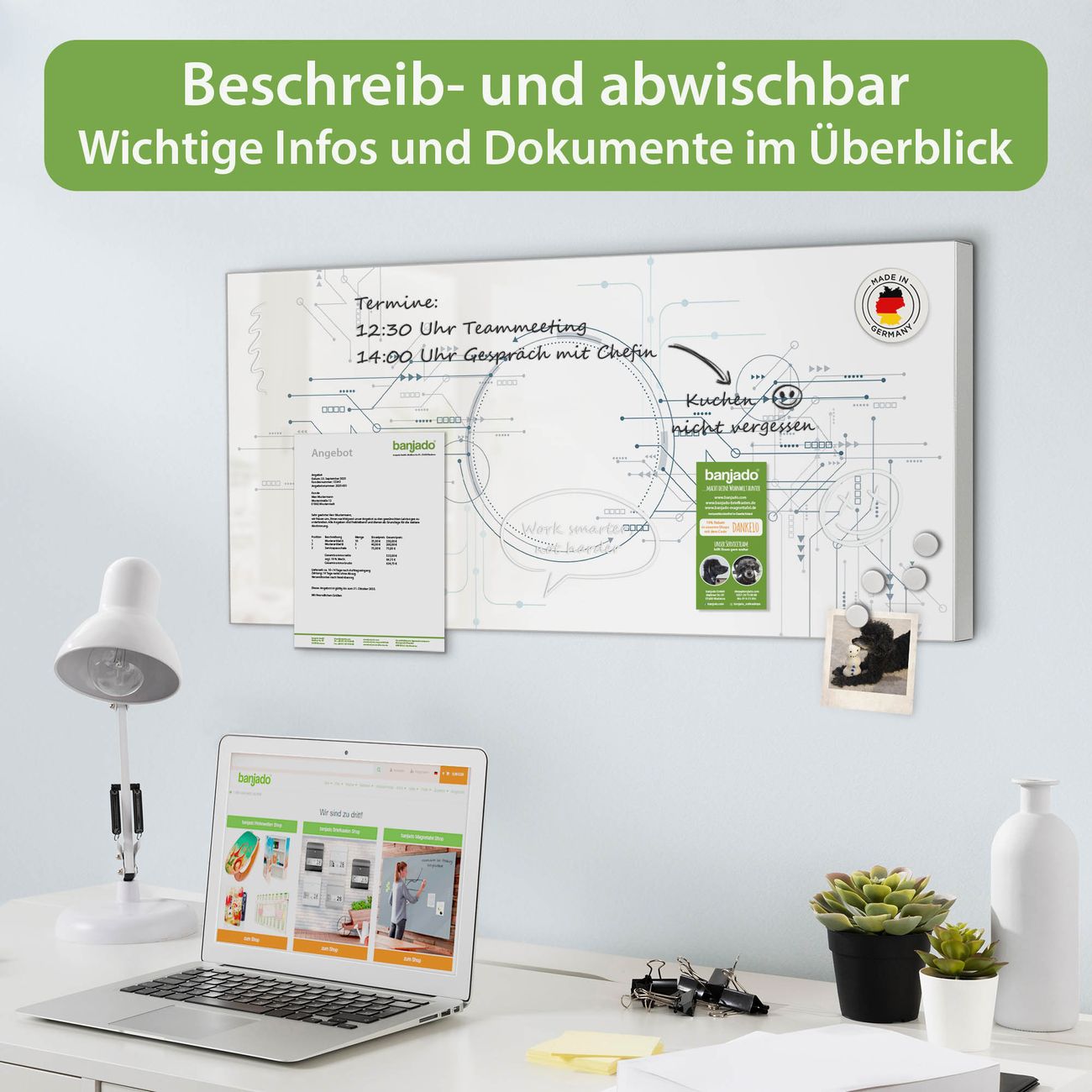FUNKTION: Die banjado Magnettafel 78x37 cm im Design Motiv Digitales Netzwerk 3 vereint Funktionalität und modernes Wohndesign auf stilvolle Weise. Diese hochwertige Magnetwand aus Metall hilft Ihnen dabei, Notizen, Fotos, Termine, Einkaufslisten oder Rezepte übersichtlich zu organisieren. Als praktisches Memoboard sorgt sie für Struktur im Alltag und setzt gleichzeitig einen dekorativen Akzent an Ihrer Wand. DESIGN: Die Metalltafel besteht aus robustem, lackiertem Stahl und ist mit allen handelsüblichen Magneten nutzbar. Besonders praktisch ist die beschreibbare Oberfläche. Sie können die Magnettafel ganz einfach mit Kreidestiften beschriften und die Inhalte bei Bedarf mit einem feuchten Tuch wieder entfernen. So eignet sich das Memoboard ideal für Wochenpläne, Menüpläne, To Do Listen oder kreative Botschaften. DETAILS: Mit ihrem großzügigen Querformat von 78x37 cm bietet die Magnettafel ausreichend Platz für Ihre Organisation. Das Motiv Motiv Digitales Netzwerk 3 bringt eine warme, natürliche Optik in Küche, Flur, Büro oder Homeoffice und wirkt auch ohne Magnete oder Beschriftung wie ein modernes Wandbild. NUTZEN: Auf der Rückseite befinden sich vorgefertigte Löcher für eine schnelle und unkomplizierte Wandmontage. Jede banjado Magnettafel wird in Deutschland gefertigt und steht für Qualität, Langlebigkeit und liebevolle Verarbeitung. Dieses beschreibbare Memoboard ist die perfekte Kombination aus Metalltafel, Designobjekt und praktischer Magnetwand für Ihren Alltag. BANJADO: Wir sind ein kleines Team aus dem Herzen von Sachsen. Wir fertigen alle Artikel von Hand für Sie an, Sie erhalten keine preiswerte Importware. Auf Wunsch können Sie auch Ihr eigenes Foto auf die Magnettafel aufbringen, schreiben Sie uns an. Herzlichst, Ihr banjado-Team