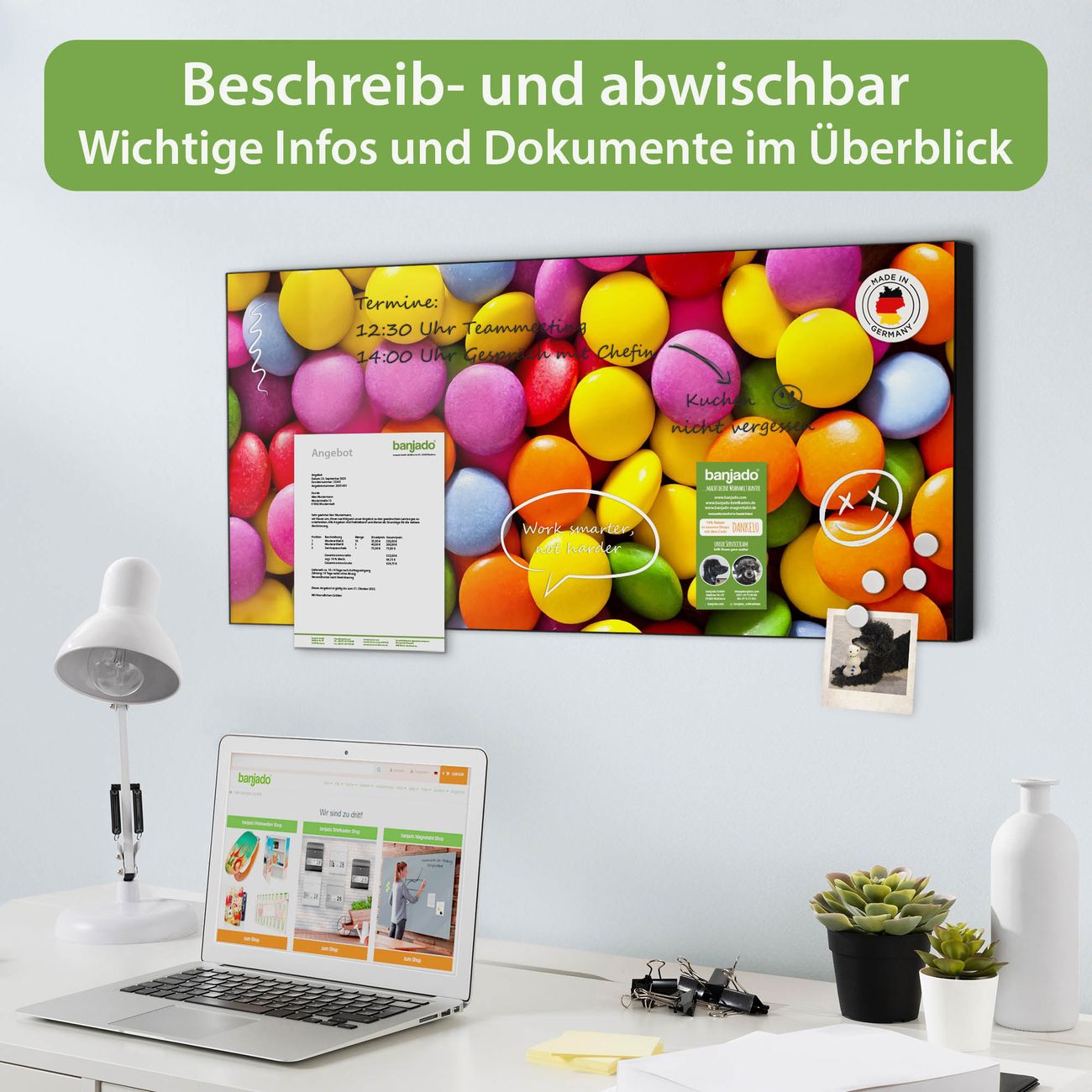 FUNKTION: Die banjado Magnettafel 78x37 cm im Design Motiv Dragees vereint Funktionalität und modernes Wohndesign auf stilvolle Weise. Diese hochwertige Magnetwand aus Metall hilft Ihnen dabei, Notizen, Fotos, Termine, Einkaufslisten oder Rezepte übersichtlich zu organisieren. Als praktisches Memoboard sorgt sie für Struktur im Alltag und setzt gleichzeitig einen dekorativen Akzent an Ihrer Wand. DESIGN: Die Metalltafel besteht aus robustem, lackiertem Stahl und ist mit allen handelsüblichen Magneten nutzbar. Besonders praktisch ist die beschreibbare Oberfläche. Sie können die Magnettafel ganz einfach mit Kreidestiften beschriften und die Inhalte bei Bedarf mit einem feuchten Tuch wieder entfernen. So eignet sich das Memoboard ideal für Wochenpläne, Menüpläne, To Do Listen oder kreative Botschaften. DETAILS: Mit ihrem großzügigen Querformat von 78x37 cm bietet die Magnettafel ausreichend Platz für Ihre Organisation. Das Motiv Motiv Dragees bringt eine warme, natürliche Optik in Küche, Flur, Büro oder Homeoffice und wirkt auch ohne Magnete oder Beschriftung wie ein modernes Wandbild. NUTZEN: Auf der Rückseite befinden sich vorgefertigte Löcher für eine schnelle und unkomplizierte Wandmontage. Jede banjado Magnettafel wird in Deutschland gefertigt und steht für Qualität, Langlebigkeit und liebevolle Verarbeitung. Dieses beschreibbare Memoboard ist die perfekte Kombination aus Metalltafel, Designobjekt und praktischer Magnetwand für Ihren Alltag. BANJADO: Wir sind ein kleines Team aus dem Herzen von Sachsen. Wir fertigen alle Artikel von Hand für Sie an, Sie erhalten keine preiswerte Importware. Auf Wunsch können Sie auch Ihr eigenes Foto auf die Magnettafel aufbringen, schreiben Sie uns an. Herzlichst, Ihr banjado-Team