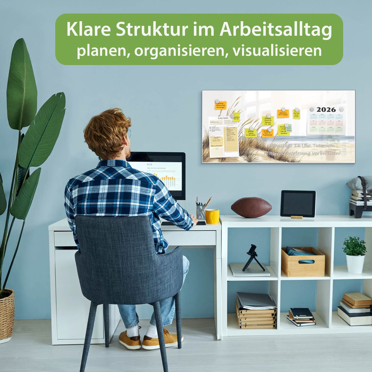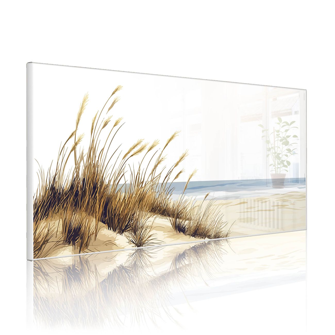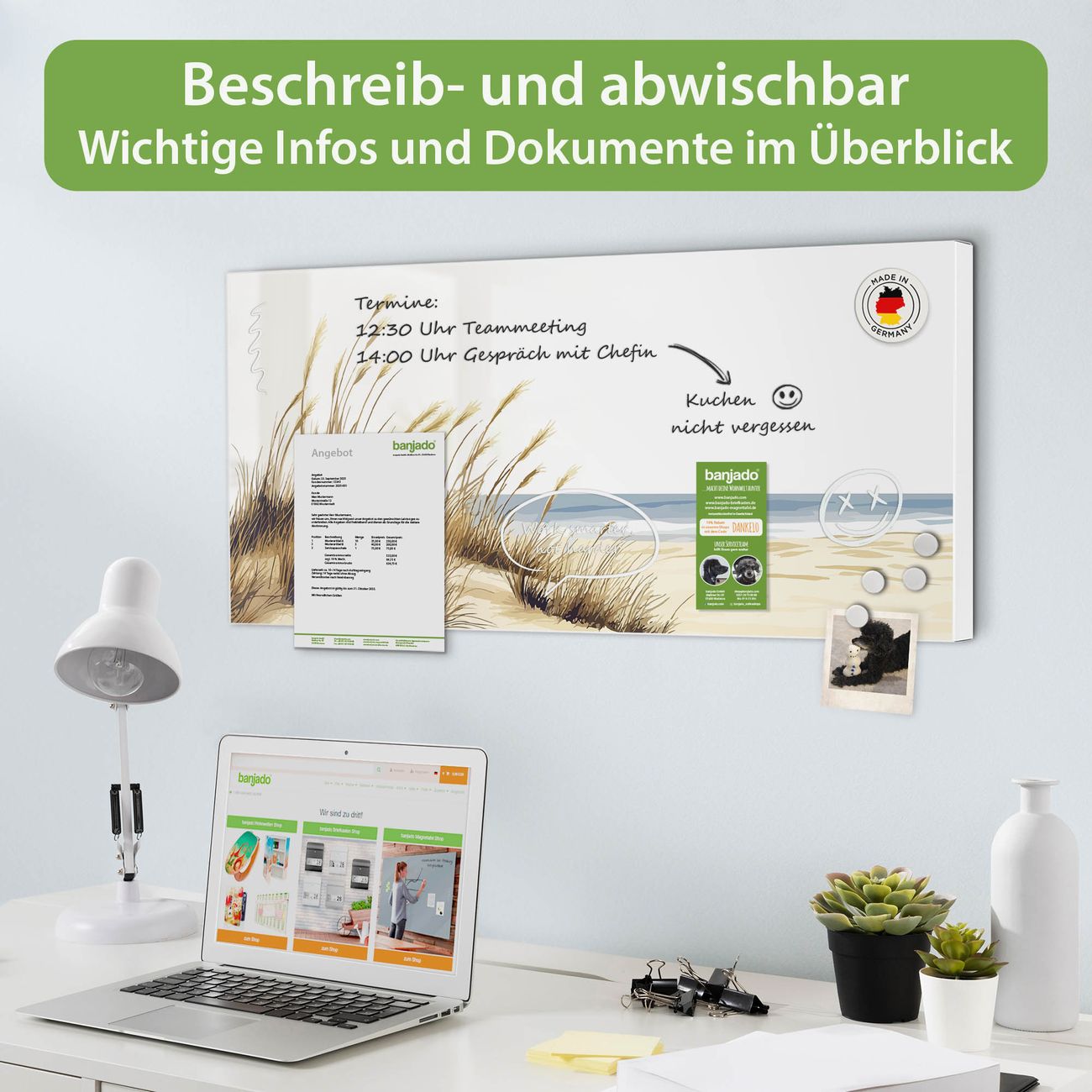 FUNKTION: Die banjado Magnettafel 78x37 cm im Design Motiv Dünenlandschaft am Meer vereint Funktionalität und modernes Wohndesign auf stilvolle Weise. Diese hochwertige Magnetwand aus Metall hilft Ihnen dabei, Notizen, Fotos, Termine, Einkaufslisten oder Rezepte übersichtlich zu organisieren. Als praktisches Memoboard sorgt sie für Struktur im Alltag und setzt gleichzeitig einen dekorativen Akzent an Ihrer Wand. DESIGN: Die Metalltafel besteht aus robustem, lackiertem Stahl und ist mit allen handelsüblichen Magneten nutzbar. Besonders praktisch ist die beschreibbare Oberfläche. Sie können die Magnettafel ganz einfach mit Kreidestiften beschriften und die Inhalte bei Bedarf mit einem feuchten Tuch wieder entfernen. So eignet sich das Memoboard ideal für Wochenpläne, Menüpläne, To Do Listen oder kreative Botschaften. DETAILS: Mit ihrem großzügigen Querformat von 78x37 cm bietet die Magnettafel ausreichend Platz für Ihre Organisation. Das Motiv Motiv Dünenlandschaft am Meer bringt eine warme, natürliche Optik in Küche, Flur, Büro oder Homeoffice und wirkt auch ohne Magnete oder Beschriftung wie ein modernes Wandbild. NUTZEN: Auf der Rückseite befinden sich vorgefertigte Löcher für eine schnelle und unkomplizierte Wandmontage. Jede banjado Magnettafel wird in Deutschland gefertigt und steht für Qualität, Langlebigkeit und liebevolle Verarbeitung. Dieses beschreibbare Memoboard ist die perfekte Kombination aus Metalltafel, Designobjekt und praktischer Magnetwand für Ihren Alltag. BANJADO: Wir sind ein kleines Team aus dem Herzen von Sachsen. Wir fertigen alle Artikel von Hand für Sie an, Sie erhalten keine preiswerte Importware. Auf Wunsch können Sie auch Ihr eigenes Foto auf die Magnettafel aufbringen, schreiben Sie uns an. Herzlichst, Ihr banjado-Team