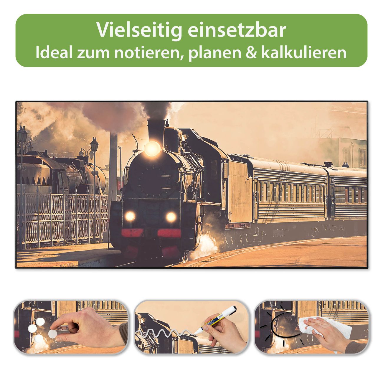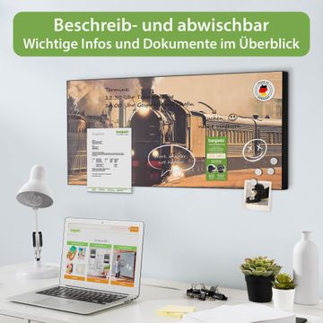 FUNKTION: Die banjado Magnettafel 78x37 cm im Design Motiv Einfahrender Zug vereint Funktionalität und modernes Wohndesign auf stilvolle Weise. Diese hochwertige Magnetwand aus Metall hilft Ihnen dabei, Notizen, Fotos, Termine, Einkaufslisten oder Rezepte übersichtlich zu organisieren. Als praktisches Memoboard sorgt sie für Struktur im Alltag und setzt gleichzeitig einen dekorativen Akzent an Ihrer Wand. DESIGN: Die Metalltafel besteht aus robustem, lackiertem Stahl und ist mit allen handelsüblichen Magneten nutzbar. Besonders praktisch ist die beschreibbare Oberfläche. Sie können die Magnettafel ganz einfach mit Kreidestiften beschriften und die Inhalte bei Bedarf mit einem feuchten Tuch wieder entfernen. So eignet sich das Memoboard ideal für Wochenpläne, Menüpläne, To Do Listen oder kreative Botschaften. DETAILS: Mit ihrem großzügigen Querformat von 78x37 cm bietet die Magnettafel ausreichend Platz für Ihre Organisation. Das Motiv Motiv Einfahrender Zug bringt eine warme, natürliche Optik in Küche, Flur, Büro oder Homeoffice und wirkt auch ohne Magnete oder Beschriftung wie ein modernes Wandbild. NUTZEN: Auf der Rückseite befinden sich vorgefertigte Löcher für eine schnelle und unkomplizierte Wandmontage. Jede banjado Magnettafel wird in Deutschland gefertigt und steht für Qualität, Langlebigkeit und liebevolle Verarbeitung. Dieses beschreibbare Memoboard ist die perfekte Kombination aus Metalltafel, Designobjekt und praktischer Magnetwand für Ihren Alltag. BANJADO: Wir sind ein kleines Team aus dem Herzen von Sachsen. Wir fertigen alle Artikel von Hand für Sie an, Sie erhalten keine preiswerte Importware. Auf Wunsch können Sie auch Ihr eigenes Foto auf die Magnettafel aufbringen, schreiben Sie uns an. Herzlichst, Ihr banjado-Team
