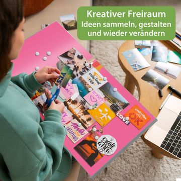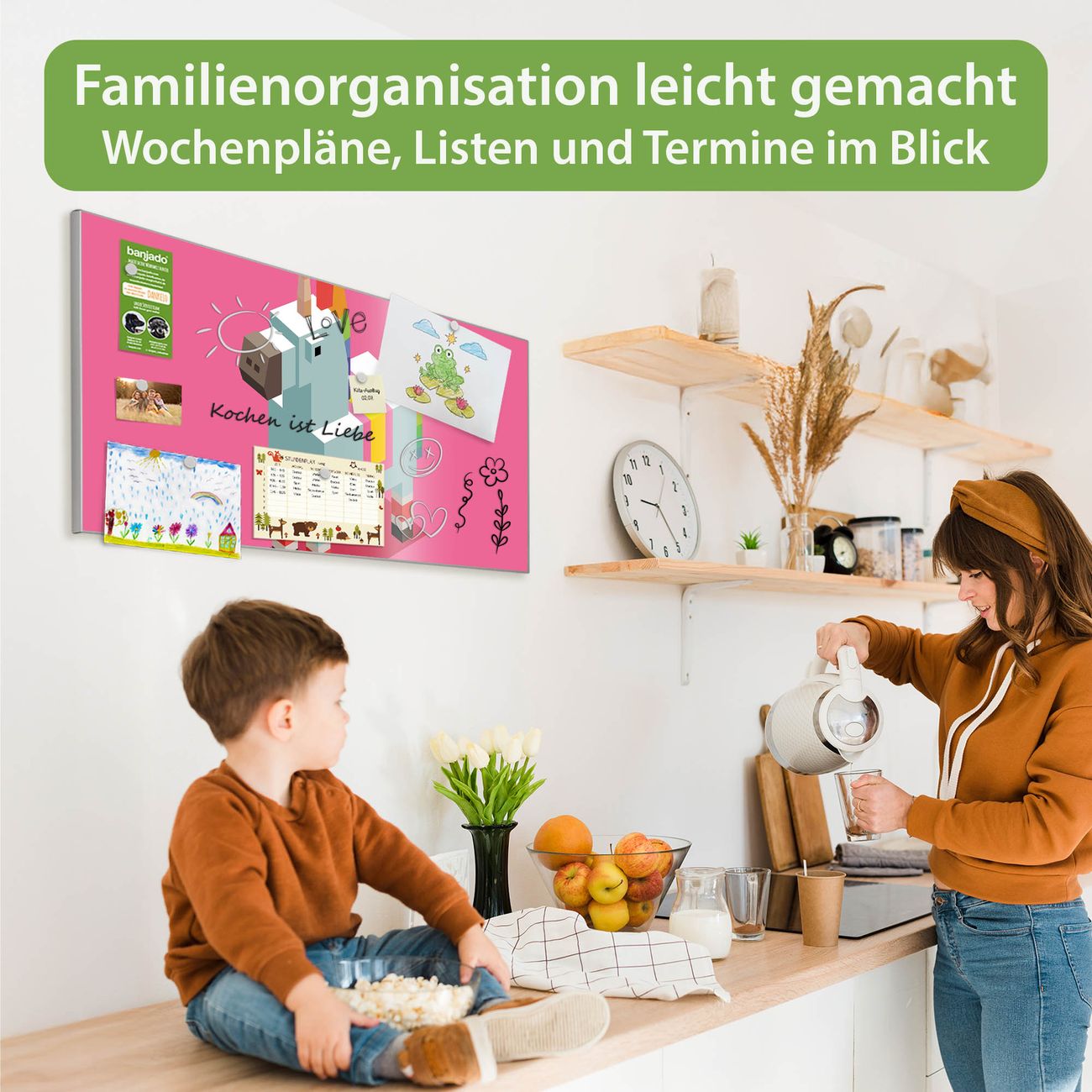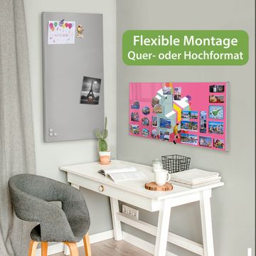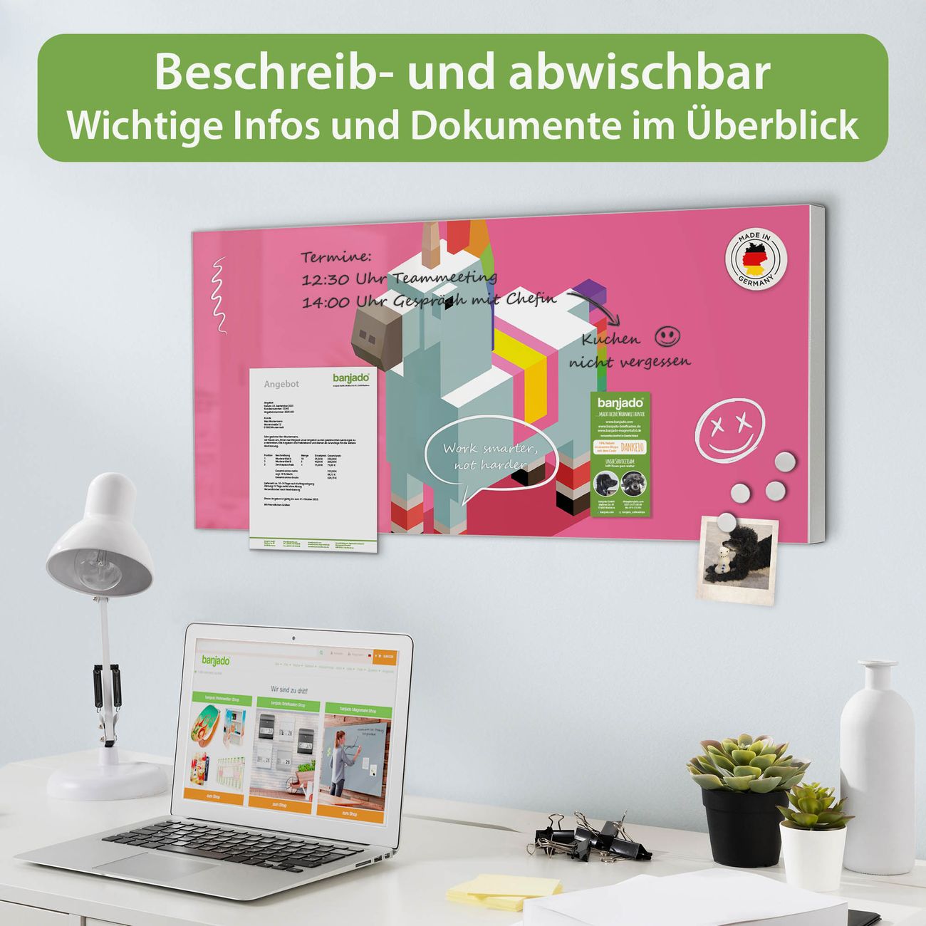 FUNKTION: Die banjado Magnettafel 78x37 cm im Design Motiv Einhorn Block vereint Funktionalität und modernes Wohndesign auf stilvolle Weise. Diese hochwertige Magnetwand aus Metall hilft Ihnen dabei, Notizen, Fotos, Termine, Einkaufslisten oder Rezepte übersichtlich zu organisieren. Als praktisches Memoboard sorgt sie für Struktur im Alltag und setzt gleichzeitig einen dekorativen Akzent an Ihrer Wand. DESIGN: Die Metalltafel besteht aus robustem, lackiertem Stahl und ist mit allen handelsüblichen Magneten nutzbar. Besonders praktisch ist die beschreibbare Oberfläche. Sie können die Magnettafel ganz einfach mit Kreidestiften beschriften und die Inhalte bei Bedarf mit einem feuchten Tuch wieder entfernen. So eignet sich das Memoboard ideal für Wochenpläne, Menüpläne, To Do Listen oder kreative Botschaften. DETAILS: Mit ihrem großzügigen Querformat von 78x37 cm bietet die Magnettafel ausreichend Platz für Ihre Organisation. Das Motiv Motiv Einhorn Block bringt eine warme, natürliche Optik in Küche, Flur, Büro oder Homeoffice und wirkt auch ohne Magnete oder Beschriftung wie ein modernes Wandbild. NUTZEN: Auf der Rückseite befinden sich vorgefertigte Löcher für eine schnelle und unkomplizierte Wandmontage. Jede banjado Magnettafel wird in Deutschland gefertigt und steht für Qualität, Langlebigkeit und liebevolle Verarbeitung. Dieses beschreibbare Memoboard ist die perfekte Kombination aus Metalltafel, Designobjekt und praktischer Magnetwand für Ihren Alltag. BANJADO: Wir sind ein kleines Team aus dem Herzen von Sachsen. Wir fertigen alle Artikel von Hand für Sie an, Sie erhalten keine preiswerte Importware. Auf Wunsch können Sie auch Ihr eigenes Foto auf die Magnettafel aufbringen, schreiben Sie uns an. Herzlichst, Ihr banjado-Team
