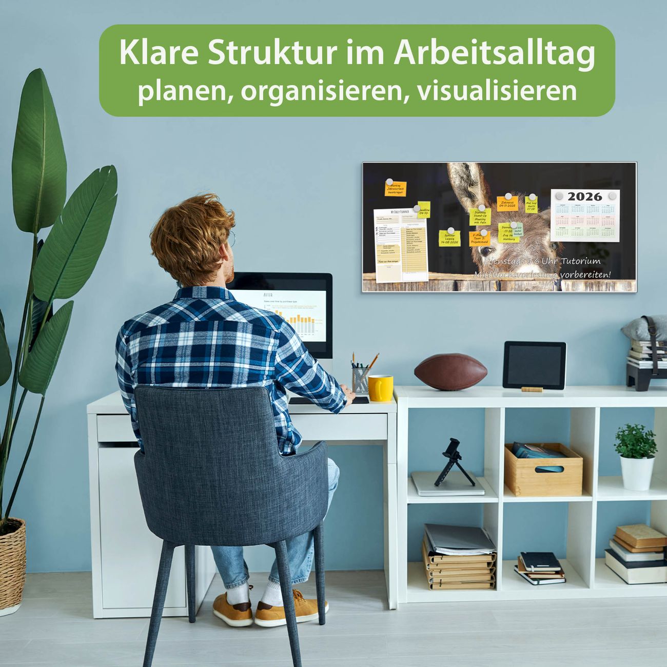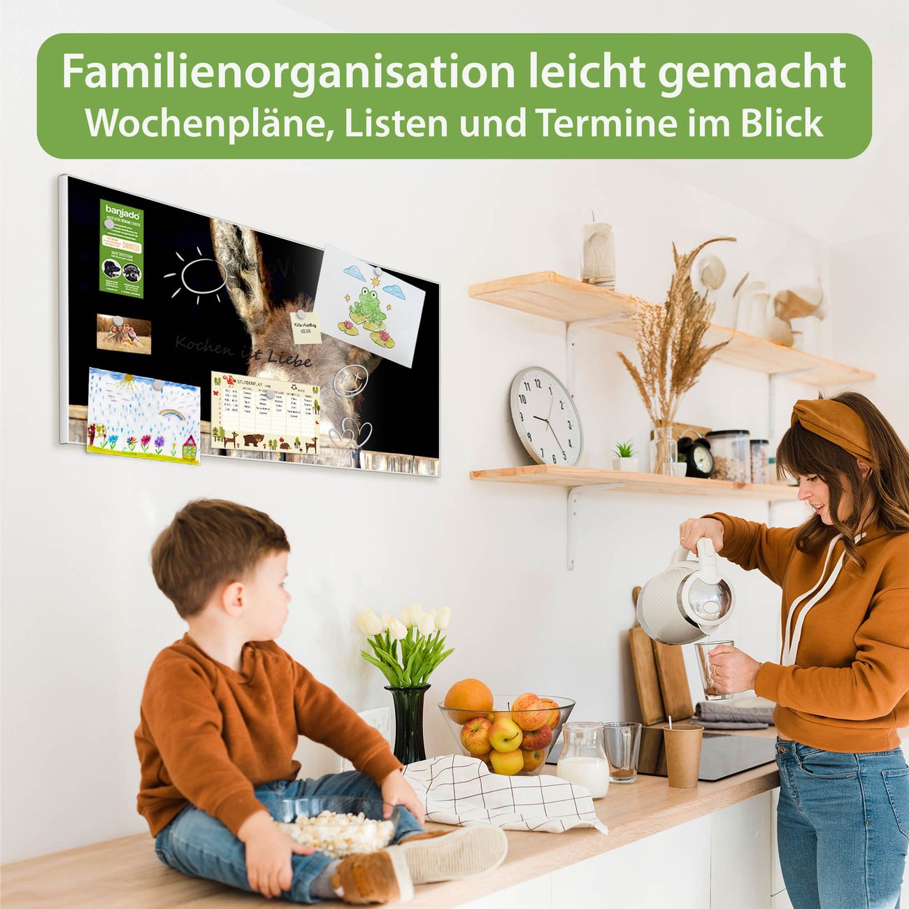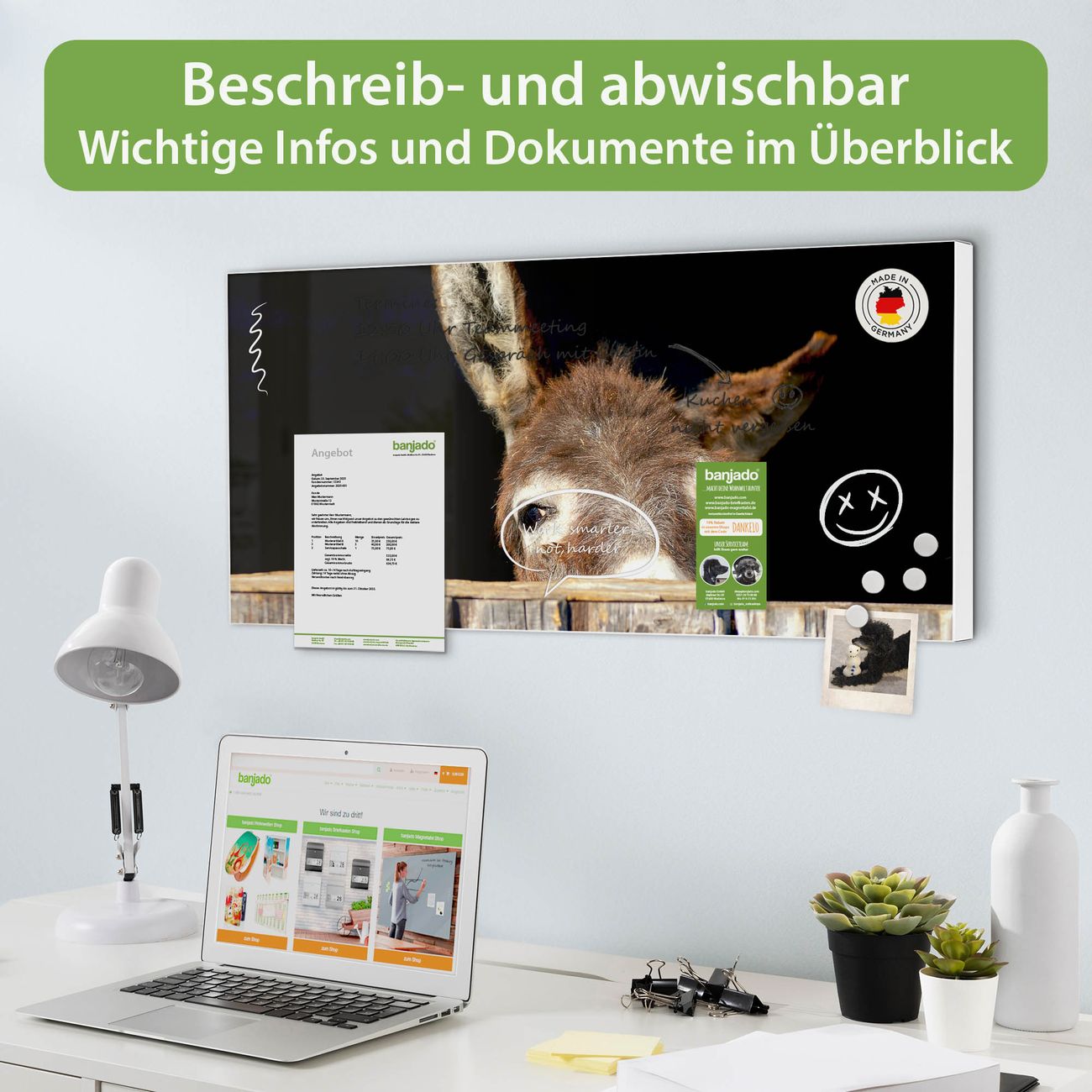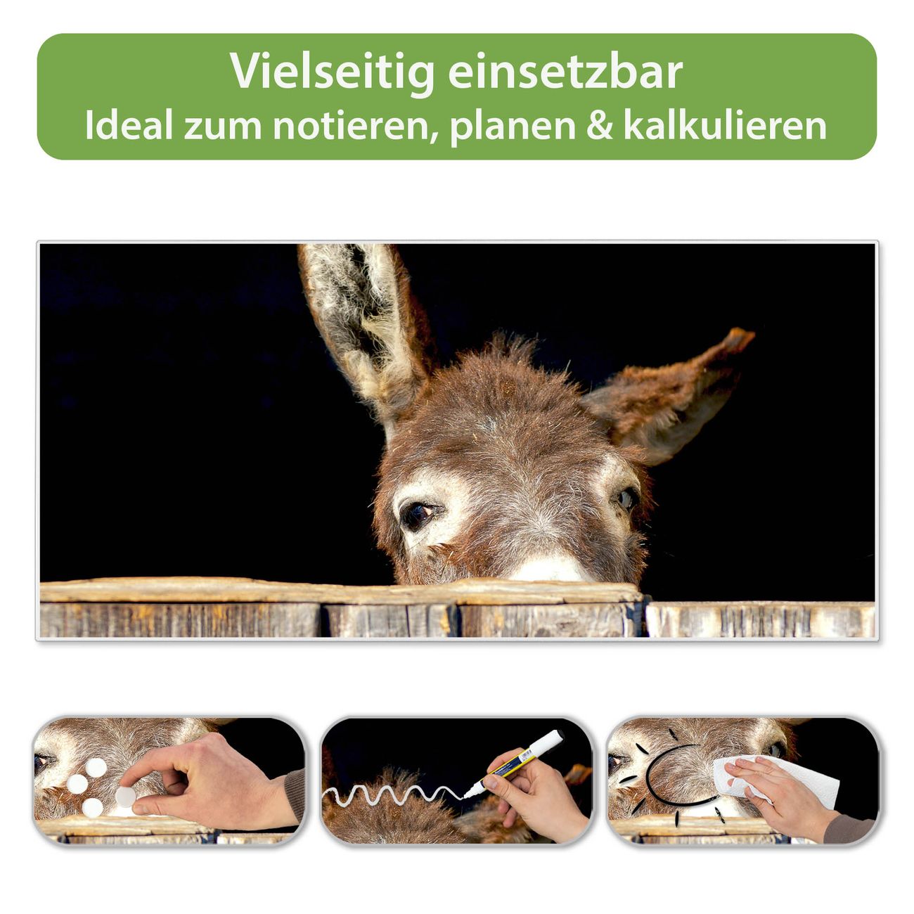 FUNKTION: Die banjado Magnettafel 78x37 cm im Design Motiv Esel vereint Funktionalität und modernes Wohndesign auf stilvolle Weise. Diese hochwertige Magnetwand aus Metall hilft Ihnen dabei, Notizen, Fotos, Termine, Einkaufslisten oder Rezepte übersichtlich zu organisieren. Als praktisches Memoboard sorgt sie für Struktur im Alltag und setzt gleichzeitig einen dekorativen Akzent an Ihrer Wand. DESIGN: Die Metalltafel besteht aus robustem, lackiertem Stahl und ist mit allen handelsüblichen Magneten nutzbar. Besonders praktisch ist die beschreibbare Oberfläche. Sie können die Magnettafel ganz einfach mit Kreidestiften beschriften und die Inhalte bei Bedarf mit einem feuchten Tuch wieder entfernen. So eignet sich das Memoboard ideal für Wochenpläne, Menüpläne, To Do Listen oder kreative Botschaften. DETAILS: Mit ihrem großzügigen Querformat von 78x37 cm bietet die Magnettafel ausreichend Platz für Ihre Organisation. Das Motiv Motiv Esel bringt eine warme, natürliche Optik in Küche, Flur, Büro oder Homeoffice und wirkt auch ohne Magnete oder Beschriftung wie ein modernes Wandbild. NUTZEN: Auf der Rückseite befinden sich vorgefertigte Löcher für eine schnelle und unkomplizierte Wandmontage. Jede banjado Magnettafel wird in Deutschland gefertigt und steht für Qualität, Langlebigkeit und liebevolle Verarbeitung. Dieses beschreibbare Memoboard ist die perfekte Kombination aus Metalltafel, Designobjekt und praktischer Magnetwand für Ihren Alltag. BANJADO: Wir sind ein kleines Team aus dem Herzen von Sachsen. Wir fertigen alle Artikel von Hand für Sie an, Sie erhalten keine preiswerte Importware. Auf Wunsch können Sie auch Ihr eigenes Foto auf die Magnettafel aufbringen, schreiben Sie uns an. Herzlichst, Ihr banjado-Team