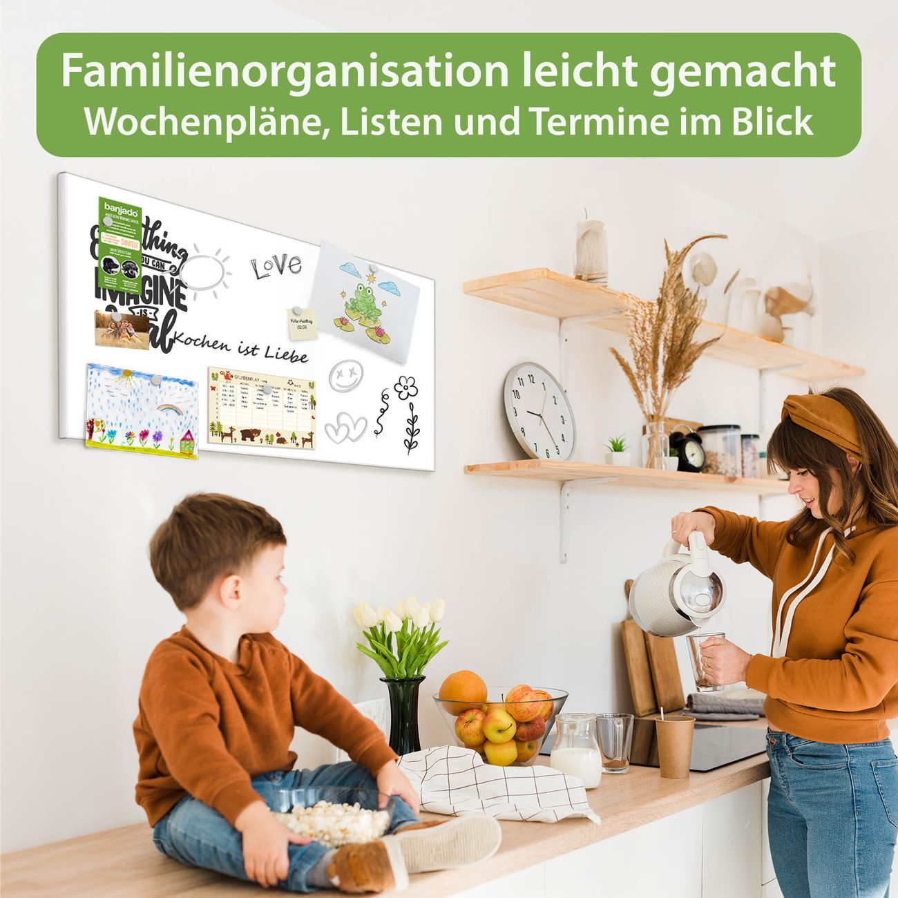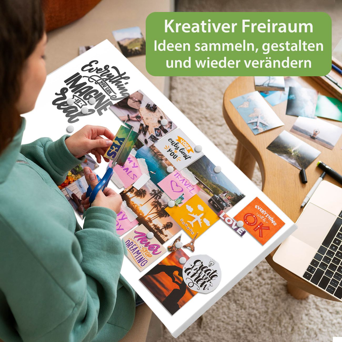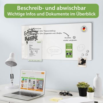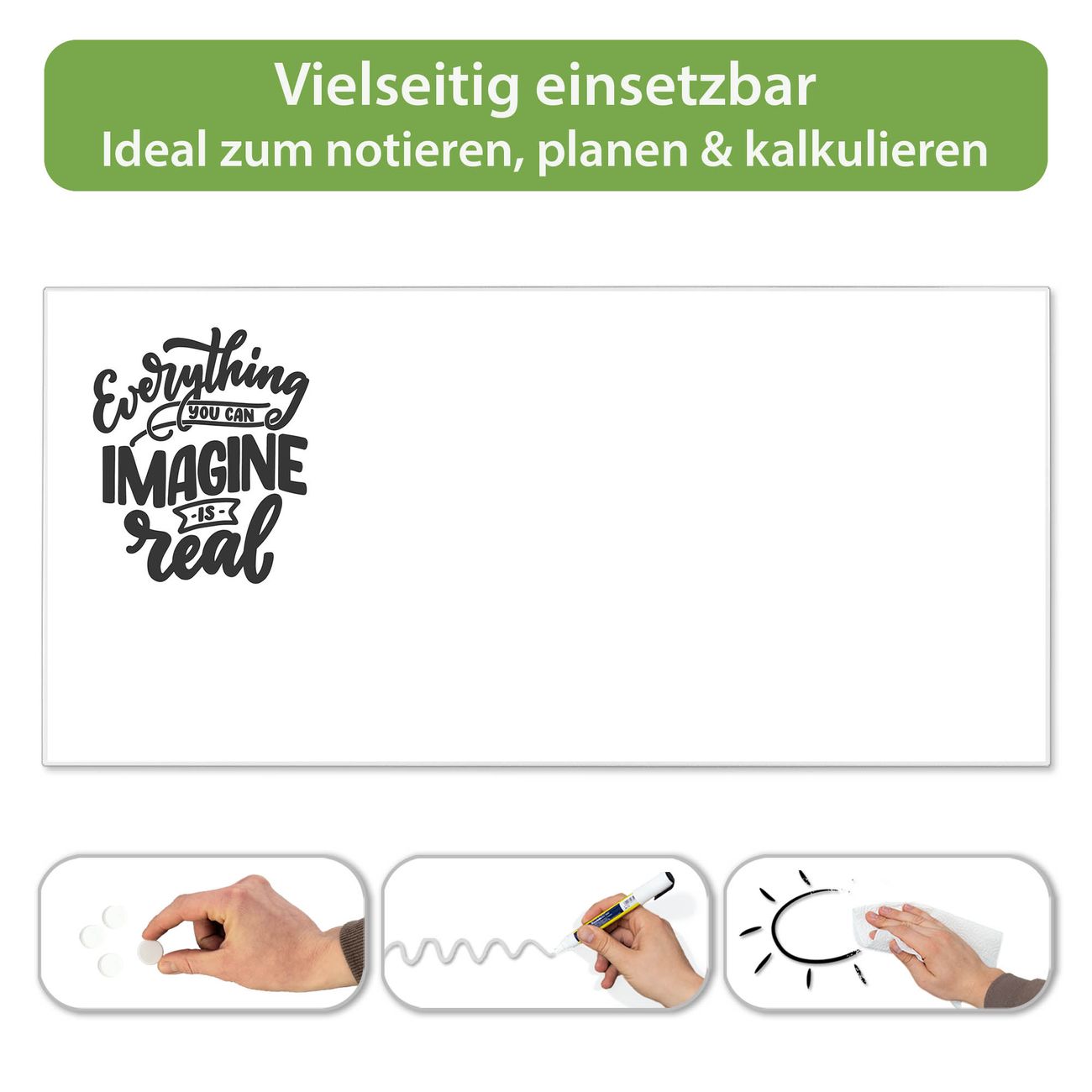FUNKTION: Die banjado Magnettafel 78x37 cm im Design Motiv Everything you can imagine is real 2 vereint Funktionalität und modernes Wohndesign auf stilvolle Weise. Diese hochwertige Magnetwand aus Metall hilft Ihnen dabei, Notizen, Fotos, Termine, Einkaufslisten oder Rezepte übersichtlich zu organisieren. Als praktisches Memoboard sorgt sie für Struktur im Alltag und setzt gleichzeitig einen dekorativen Akzent an Ihrer Wand. DESIGN: Die Metalltafel besteht aus robustem, lackiertem Stahl und ist mit allen handelsüblichen Magneten nutzbar. Besonders praktisch ist die beschreibbare Oberfläche. Sie können die Magnettafel ganz einfach mit Kreidestiften beschriften und die Inhalte bei Bedarf mit einem feuchten Tuch wieder entfernen. So eignet sich das Memoboard ideal für Wochenpläne, Menüpläne, To Do Listen oder kreative Botschaften. DETAILS: Mit ihrem großzügigen Querformat von 78x37 cm bietet die Magnettafel ausreichend Platz für Ihre Organisation. Das Motiv Motiv Everything you can imagine is real 2 bringt eine warme, natürliche Optik in Küche, Flur, Büro oder Homeoffice und wirkt auch ohne Magnete oder Beschriftung wie ein modernes Wandbild. NUTZEN: Auf der Rückseite befinden sich vorgefertigte Löcher für eine schnelle und unkomplizierte Wandmontage. Jede banjado Magnettafel wird in Deutschland gefertigt und steht für Qualität, Langlebigkeit und liebevolle Verarbeitung. Dieses beschreibbare Memoboard ist die perfekte Kombination aus Metalltafel, Designobjekt und praktischer Magnetwand für Ihren Alltag. BANJADO: Wir sind ein kleines Team aus dem Herzen von Sachsen. Wir fertigen alle Artikel von Hand für Sie an, Sie erhalten keine preiswerte Importware. Auf Wunsch können Sie auch Ihr eigenes Foto auf die Magnettafel aufbringen, schreiben Sie uns an. Herzlichst, Ihr banjado-Team