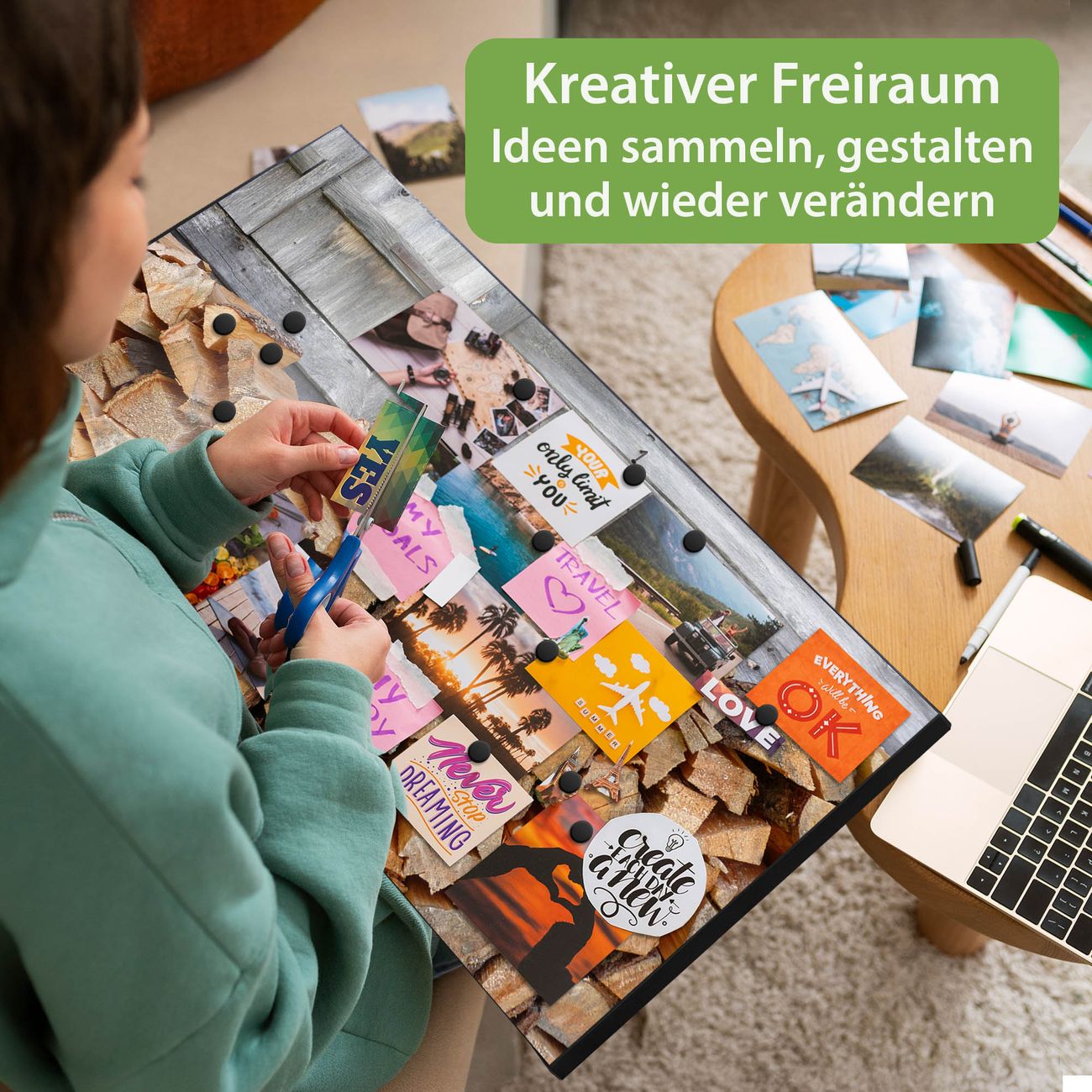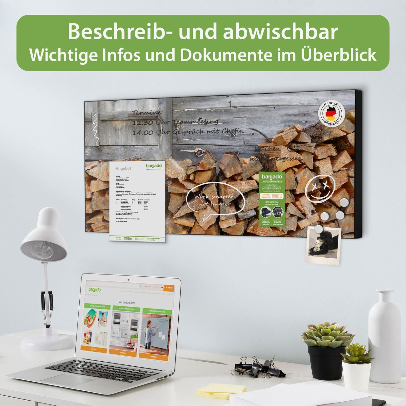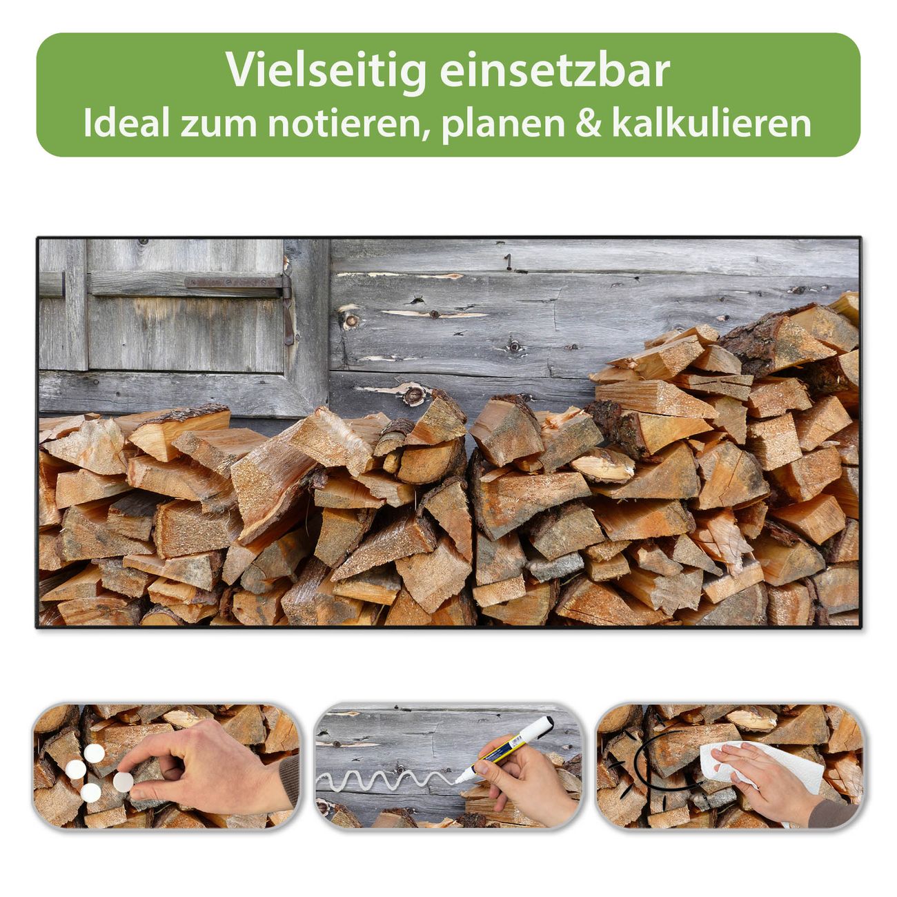 FUNKTION: Die banjado Magnettafel 78x37 cm im Design Motiv Feuerholz vereint Funktionalität und modernes Wohndesign auf stilvolle Weise. Diese hochwertige Magnetwand aus Metall hilft Ihnen dabei, Notizen, Fotos, Termine, Einkaufslisten oder Rezepte übersichtlich zu organisieren. Als praktisches Memoboard sorgt sie für Struktur im Alltag und setzt gleichzeitig einen dekorativen Akzent an Ihrer Wand. DESIGN: Die Metalltafel besteht aus robustem, lackiertem Stahl und ist mit allen handelsüblichen Magneten nutzbar. Besonders praktisch ist die beschreibbare Oberfläche. Sie können die Magnettafel ganz einfach mit Kreidestiften beschriften und die Inhalte bei Bedarf mit einem feuchten Tuch wieder entfernen. So eignet sich das Memoboard ideal für Wochenpläne, Menüpläne, To Do Listen oder kreative Botschaften. DETAILS: Mit ihrem großzügigen Querformat von 78x37 cm bietet die Magnettafel ausreichend Platz für Ihre Organisation. Das Motiv Motiv Feuerholz bringt eine warme, natürliche Optik in Küche, Flur, Büro oder Homeoffice und wirkt auch ohne Magnete oder Beschriftung wie ein modernes Wandbild. NUTZEN: Auf der Rückseite befinden sich vorgefertigte Löcher für eine schnelle und unkomplizierte Wandmontage. Jede banjado Magnettafel wird in Deutschland gefertigt und steht für Qualität, Langlebigkeit und liebevolle Verarbeitung. Dieses beschreibbare Memoboard ist die perfekte Kombination aus Metalltafel, Designobjekt und praktischer Magnetwand für Ihren Alltag. BANJADO: Wir sind ein kleines Team aus dem Herzen von Sachsen. Wir fertigen alle Artikel von Hand für Sie an, Sie erhalten keine preiswerte Importware. Auf Wunsch können Sie auch Ihr eigenes Foto auf die Magnettafel aufbringen, schreiben Sie uns an. Herzlichst, Ihr banjado-Team