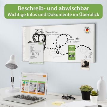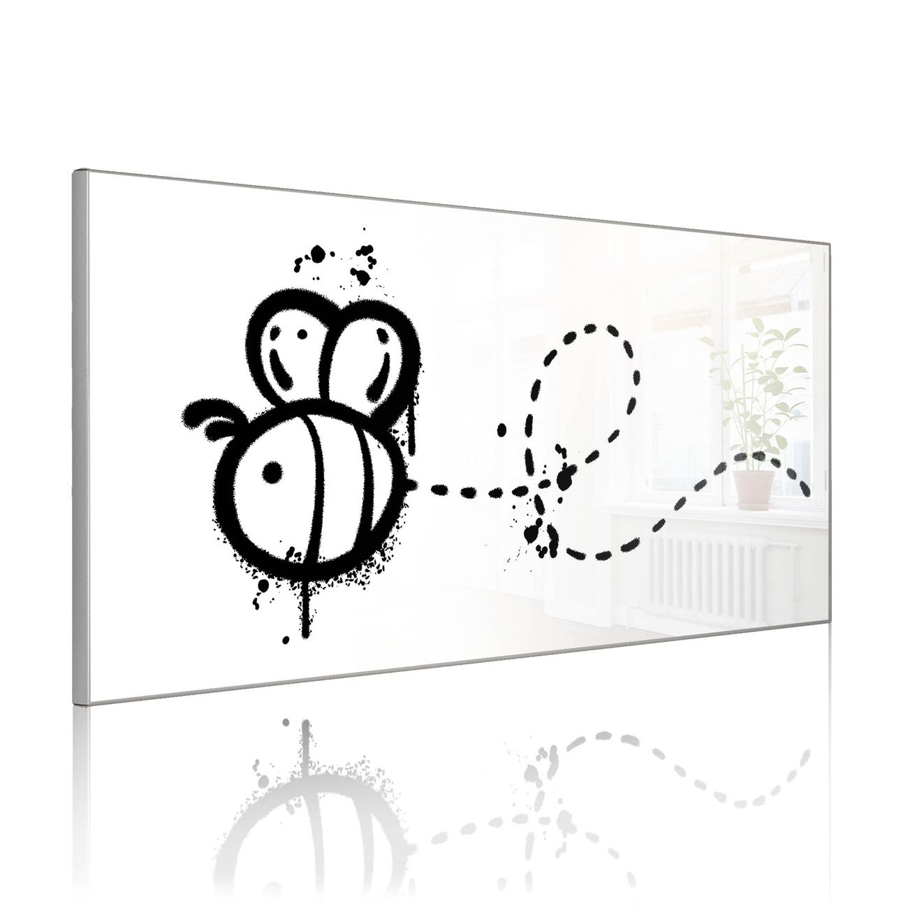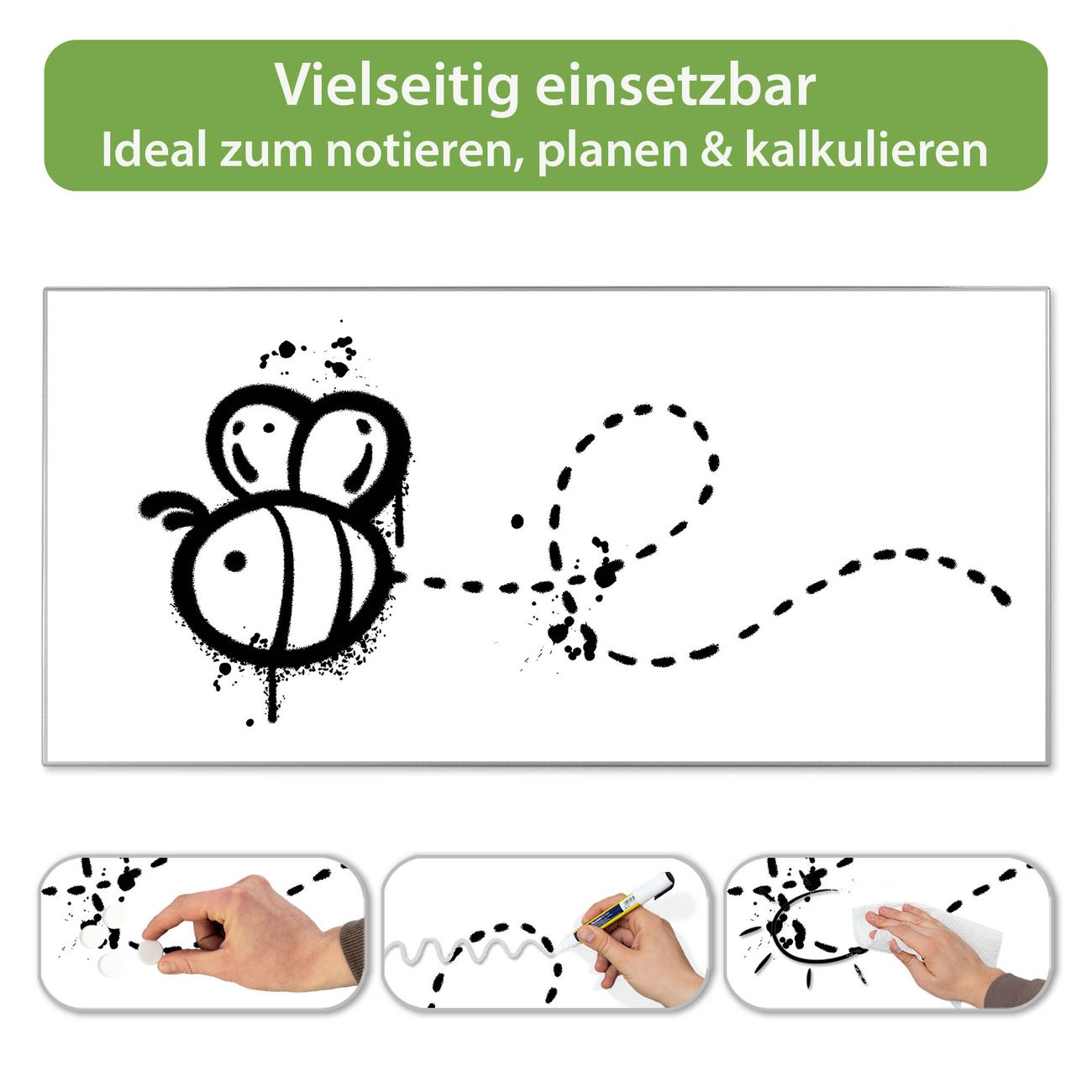 FUNKTION: Die banjado Magnettafel 78x37 cm im Design Motiv Fliegende Biene Graffiti vereint Funktionalität und modernes Wohndesign auf stilvolle Weise. Diese hochwertige Magnetwand aus Metall hilft Ihnen dabei, Notizen, Fotos, Termine, Einkaufslisten oder Rezepte übersichtlich zu organisieren. Als praktisches Memoboard sorgt sie für Struktur im Alltag und setzt gleichzeitig einen dekorativen Akzent an Ihrer Wand. DESIGN: Die Metalltafel besteht aus robustem, lackiertem Stahl und ist mit allen handelsüblichen Magneten nutzbar. Besonders praktisch ist die beschreibbare Oberfläche. Sie können die Magnettafel ganz einfach mit Kreidestiften beschriften und die Inhalte bei Bedarf mit einem feuchten Tuch wieder entfernen. So eignet sich das Memoboard ideal für Wochenpläne, Menüpläne, To Do Listen oder kreative Botschaften. DETAILS: Mit ihrem großzügigen Querformat von 78x37 cm bietet die Magnettafel ausreichend Platz für Ihre Organisation. Das Motiv Motiv Fliegende Biene Graffiti bringt eine warme, natürliche Optik in Küche, Flur, Büro oder Homeoffice und wirkt auch ohne Magnete oder Beschriftung wie ein modernes Wandbild. NUTZEN: Auf der Rückseite befinden sich vorgefertigte Löcher für eine schnelle und unkomplizierte Wandmontage. Jede banjado Magnettafel wird in Deutschland gefertigt und steht für Qualität, Langlebigkeit und liebevolle Verarbeitung. Dieses beschreibbare Memoboard ist die perfekte Kombination aus Metalltafel, Designobjekt und praktischer Magnetwand für Ihren Alltag. BANJADO: Wir sind ein kleines Team aus dem Herzen von Sachsen. Wir fertigen alle Artikel von Hand für Sie an, Sie erhalten keine preiswerte Importware. Auf Wunsch können Sie auch Ihr eigenes Foto auf die Magnettafel aufbringen, schreiben Sie uns an. Herzlichst, Ihr banjado-Team