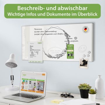 FUNKTION: Die banjado Magnettafel 78x37 cm im Design Motiv Floral Geometric Frame vereint Funktionalität und modernes Wohndesign auf stilvolle Weise. Diese hochwertige Magnetwand aus Metall hilft Ihnen dabei, Notizen, Fotos, Termine, Einkaufslisten oder Rezepte übersichtlich zu organisieren. Als praktisches Memoboard sorgt sie für Struktur im Alltag und setzt gleichzeitig einen dekorativen Akzent an Ihrer Wand. DESIGN: Die Metalltafel besteht aus robustem, lackiertem Stahl und ist mit allen handelsüblichen Magneten nutzbar. Besonders praktisch ist die beschreibbare Oberfläche. Sie können die Magnettafel ganz einfach mit Kreidestiften beschriften und die Inhalte bei Bedarf mit einem feuchten Tuch wieder entfernen. So eignet sich das Memoboard ideal für Wochenpläne, Menüpläne, To Do Listen oder kreative Botschaften. DETAILS: Mit ihrem großzügigen Querformat von 78x37 cm bietet die Magnettafel ausreichend Platz für Ihre Organisation. Das Motiv Motiv Floral Geometric Frame bringt eine warme, natürliche Optik in Küche, Flur, Büro oder Homeoffice und wirkt auch ohne Magnete oder Beschriftung wie ein modernes Wandbild. NUTZEN: Auf der Rückseite befinden sich vorgefertigte Löcher für eine schnelle und unkomplizierte Wandmontage. Jede banjado Magnettafel wird in Deutschland gefertigt und steht für Qualität, Langlebigkeit und liebevolle Verarbeitung. Dieses beschreibbare Memoboard ist die perfekte Kombination aus Metalltafel, Designobjekt und praktischer Magnetwand für Ihren Alltag. BANJADO: Wir sind ein kleines Team aus dem Herzen von Sachsen. Wir fertigen alle Artikel von Hand für Sie an, Sie erhalten keine preiswerte Importware. Auf Wunsch können Sie auch Ihr eigenes Foto auf die Magnettafel aufbringen, schreiben Sie uns an. Herzlichst, Ihr banjado-Team