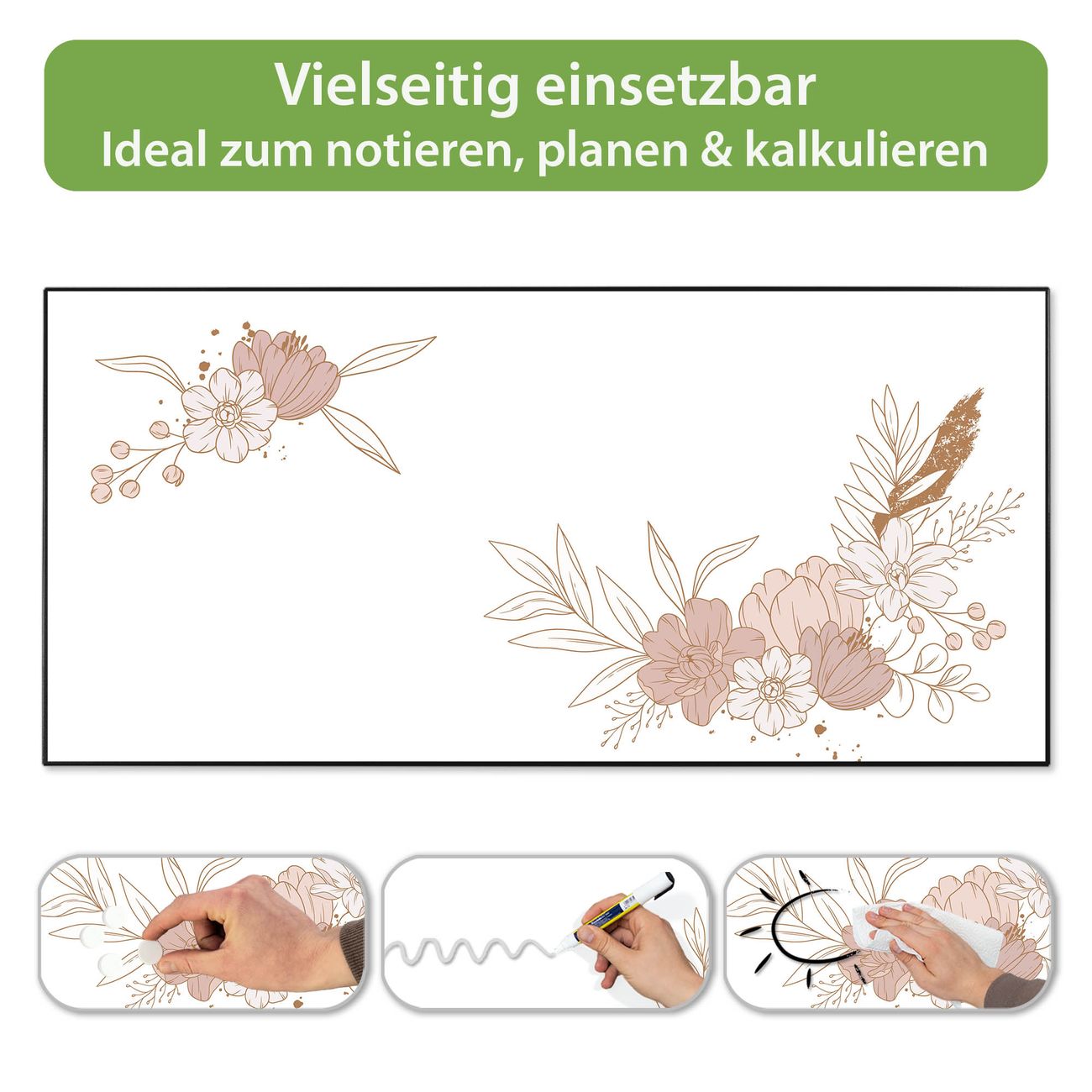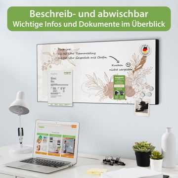FUNKTION: Die banjado Magnettafel 78x37 cm im Design Motiv Floral Geometrie vereint Funktionalität und modernes Wohndesign auf stilvolle Weise. Diese hochwertige Magnetwand aus Metall hilft Ihnen dabei, Notizen, Fotos, Termine, Einkaufslisten oder Rezepte übersichtlich zu organisieren. Als praktisches Memoboard sorgt sie für Struktur im Alltag und setzt gleichzeitig einen dekorativen Akzent an Ihrer Wand. DESIGN: Die Metalltafel besteht aus robustem, lackiertem Stahl und ist mit allen handelsüblichen Magneten nutzbar. Besonders praktisch ist die beschreibbare Oberfläche. Sie können die Magnettafel ganz einfach mit Kreidestiften beschriften und die Inhalte bei Bedarf mit einem feuchten Tuch wieder entfernen. So eignet sich das Memoboard ideal für Wochenpläne, Menüpläne, To Do Listen oder kreative Botschaften. DETAILS: Mit ihrem großzügigen Querformat von 78x37 cm bietet die Magnettafel ausreichend Platz für Ihre Organisation. Das Motiv Motiv Floral Geometrie bringt eine warme, natürliche Optik in Küche, Flur, Büro oder Homeoffice und wirkt auch ohne Magnete oder Beschriftung wie ein modernes Wandbild. NUTZEN: Auf der Rückseite befinden sich vorgefertigte Löcher für eine schnelle und unkomplizierte Wandmontage. Jede banjado Magnettafel wird in Deutschland gefertigt und steht für Qualität, Langlebigkeit und liebevolle Verarbeitung. Dieses beschreibbare Memoboard ist die perfekte Kombination aus Metalltafel, Designobjekt und praktischer Magnetwand für Ihren Alltag. BANJADO: Wir sind ein kleines Team aus dem Herzen von Sachsen. Wir fertigen alle Artikel von Hand für Sie an, Sie erhalten keine preiswerte Importware. Auf Wunsch können Sie auch Ihr eigenes Foto auf die Magnettafel aufbringen, schreiben Sie uns an. Herzlichst, Ihr banjado-Team