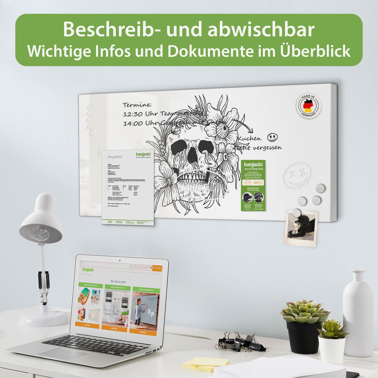 FUNKTION: Die banjado Magnettafel 78x37 cm im Design Motiv Floral Skull 2 vereint Funktionalität und modernes Wohndesign auf stilvolle Weise. Diese hochwertige Magnetwand aus Metall hilft Ihnen dabei, Notizen, Fotos, Termine, Einkaufslisten oder Rezepte übersichtlich zu organisieren. Als praktisches Memoboard sorgt sie für Struktur im Alltag und setzt gleichzeitig einen dekorativen Akzent an Ihrer Wand. DESIGN: Die Metalltafel besteht aus robustem, lackiertem Stahl und ist mit allen handelsüblichen Magneten nutzbar. Besonders praktisch ist die beschreibbare Oberfläche. Sie können die Magnettafel ganz einfach mit Kreidestiften beschriften und die Inhalte bei Bedarf mit einem feuchten Tuch wieder entfernen. So eignet sich das Memoboard ideal für Wochenpläne, Menüpläne, To Do Listen oder kreative Botschaften. DETAILS: Mit ihrem großzügigen Querformat von 78x37 cm bietet die Magnettafel ausreichend Platz für Ihre Organisation. Das Motiv Motiv Floral Skull 2 bringt eine warme, natürliche Optik in Küche, Flur, Büro oder Homeoffice und wirkt auch ohne Magnete oder Beschriftung wie ein modernes Wandbild. NUTZEN: Auf der Rückseite befinden sich vorgefertigte Löcher für eine schnelle und unkomplizierte Wandmontage. Jede banjado Magnettafel wird in Deutschland gefertigt und steht für Qualität, Langlebigkeit und liebevolle Verarbeitung. Dieses beschreibbare Memoboard ist die perfekte Kombination aus Metalltafel, Designobjekt und praktischer Magnetwand für Ihren Alltag. BANJADO: Wir sind ein kleines Team aus dem Herzen von Sachsen. Wir fertigen alle Artikel von Hand für Sie an, Sie erhalten keine preiswerte Importware. Auf Wunsch können Sie auch Ihr eigenes Foto auf die Magnettafel aufbringen, schreiben Sie uns an. Herzlichst, Ihr banjado-Team