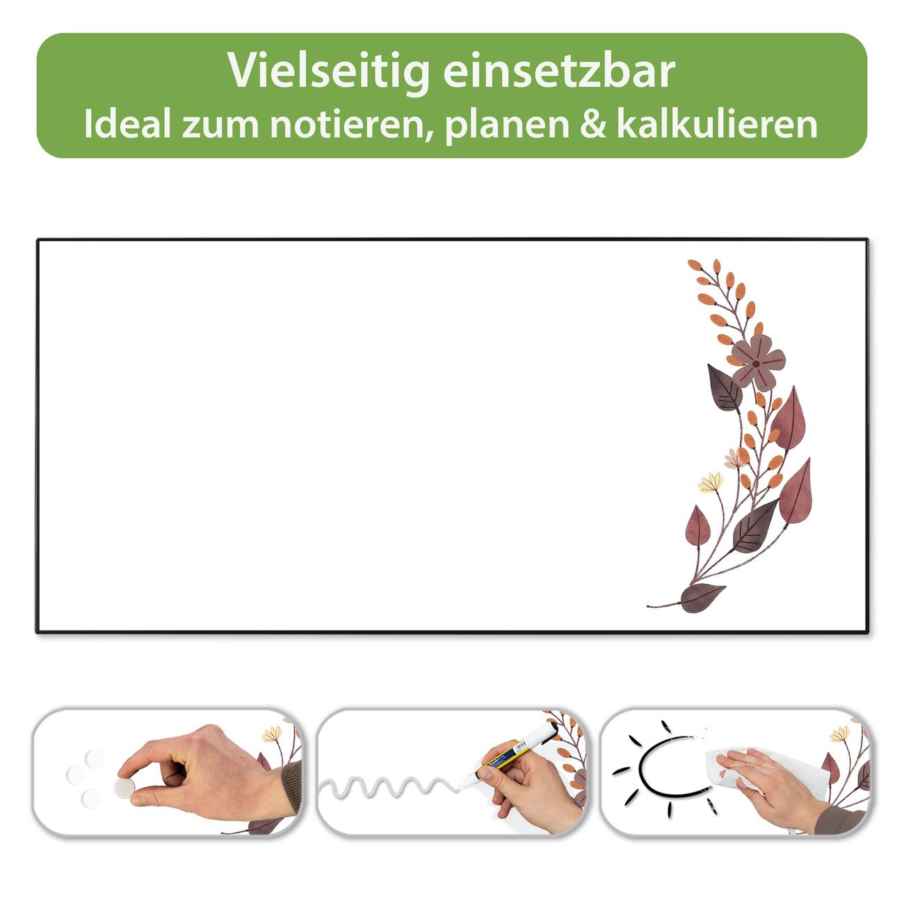 FUNKTION: Die banjado Magnettafel 78x37 cm im Design Motiv Floraler Aquarellkranz vereint Funktionalität und modernes Wohndesign auf stilvolle Weise. Diese hochwertige Magnetwand aus Metall hilft Ihnen dabei, Notizen, Fotos, Termine, Einkaufslisten oder Rezepte übersichtlich zu organisieren. Als praktisches Memoboard sorgt sie für Struktur im Alltag und setzt gleichzeitig einen dekorativen Akzent an Ihrer Wand. DESIGN: Die Metalltafel besteht aus robustem, lackiertem Stahl und ist mit allen handelsüblichen Magneten nutzbar. Besonders praktisch ist die beschreibbare Oberfläche. Sie können die Magnettafel ganz einfach mit Kreidestiften beschriften und die Inhalte bei Bedarf mit einem feuchten Tuch wieder entfernen. So eignet sich das Memoboard ideal für Wochenpläne, Menüpläne, To Do Listen oder kreative Botschaften. DETAILS: Mit ihrem großzügigen Querformat von 78x37 cm bietet die Magnettafel ausreichend Platz für Ihre Organisation. Das Motiv Motiv Floraler Aquarellkranz bringt eine warme, natürliche Optik in Küche, Flur, Büro oder Homeoffice und wirkt auch ohne Magnete oder Beschriftung wie ein modernes Wandbild. NUTZEN: Auf der Rückseite befinden sich vorgefertigte Löcher für eine schnelle und unkomplizierte Wandmontage. Jede banjado Magnettafel wird in Deutschland gefertigt und steht für Qualität, Langlebigkeit und liebevolle Verarbeitung. Dieses beschreibbare Memoboard ist die perfekte Kombination aus Metalltafel, Designobjekt und praktischer Magnetwand für Ihren Alltag. BANJADO: Wir sind ein kleines Team aus dem Herzen von Sachsen. Wir fertigen alle Artikel von Hand für Sie an, Sie erhalten keine preiswerte Importware. Auf Wunsch können Sie auch Ihr eigenes Foto auf die Magnettafel aufbringen, schreiben Sie uns an. Herzlichst, Ihr banjado-Team