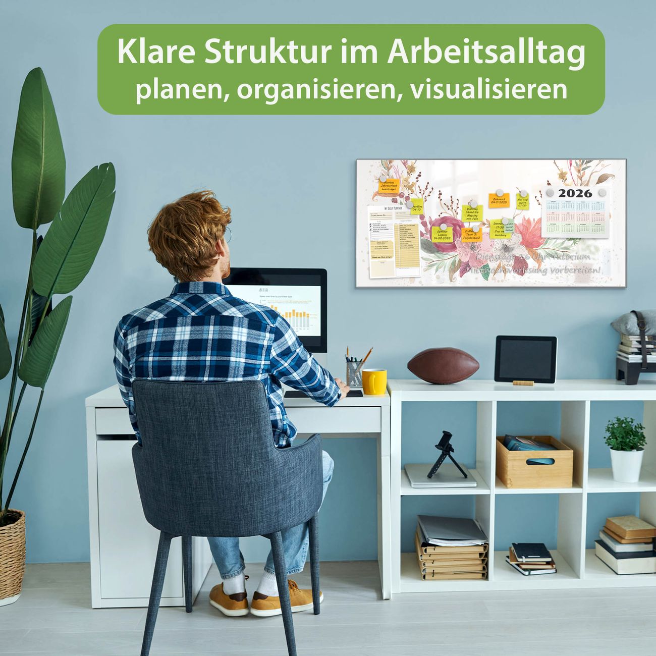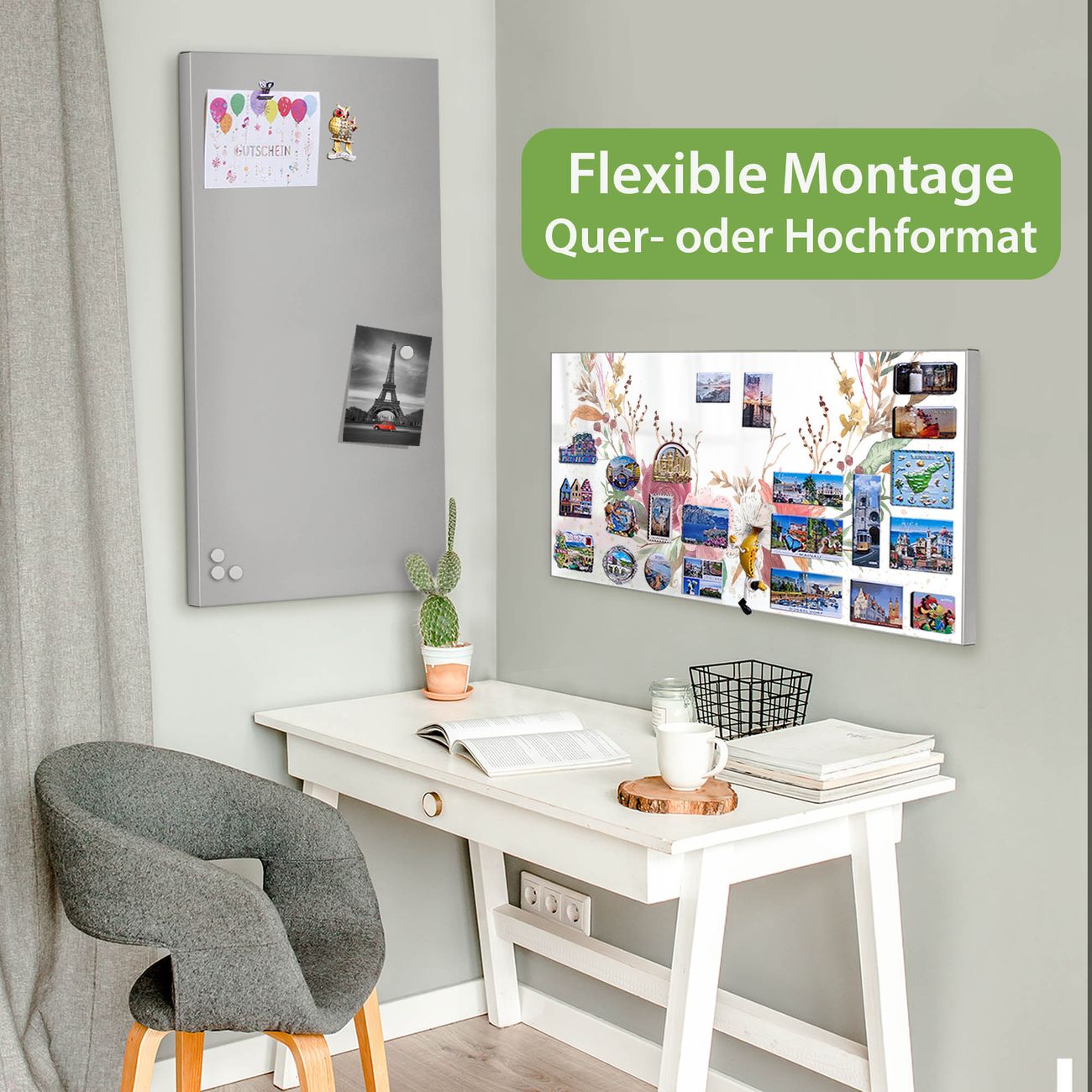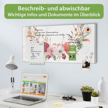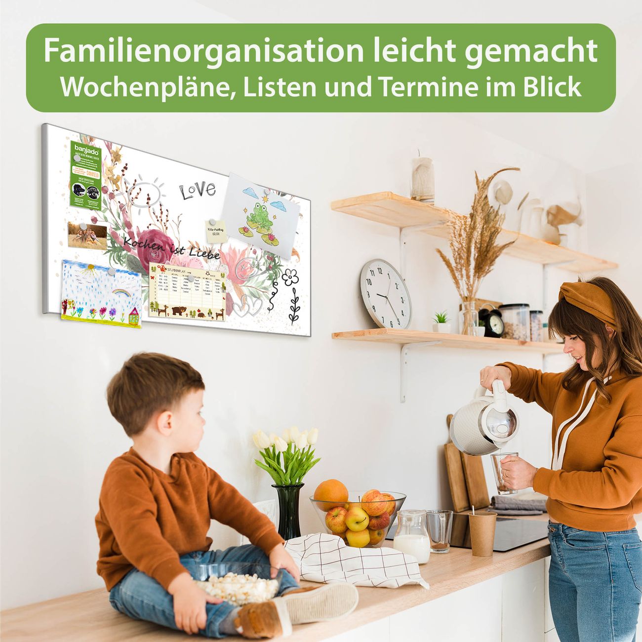 FUNKTION: Die banjado Magnettafel 78x37 cm im Design Motiv Floraler Blumenkranz vereint Funktionalität und modernes Wohndesign auf stilvolle Weise. Diese hochwertige Magnetwand aus Metall hilft Ihnen dabei, Notizen, Fotos, Termine, Einkaufslisten oder Rezepte übersichtlich zu organisieren. Als praktisches Memoboard sorgt sie für Struktur im Alltag und setzt gleichzeitig einen dekorativen Akzent an Ihrer Wand. DESIGN: Die Metalltafel besteht aus robustem, lackiertem Stahl und ist mit allen handelsüblichen Magneten nutzbar. Besonders praktisch ist die beschreibbare Oberfläche. Sie können die Magnettafel ganz einfach mit Kreidestiften beschriften und die Inhalte bei Bedarf mit einem feuchten Tuch wieder entfernen. So eignet sich das Memoboard ideal für Wochenpläne, Menüpläne, To Do Listen oder kreative Botschaften. DETAILS: Mit ihrem großzügigen Querformat von 78x37 cm bietet die Magnettafel ausreichend Platz für Ihre Organisation. Das Motiv Motiv Floraler Blumenkranz bringt eine warme, natürliche Optik in Küche, Flur, Büro oder Homeoffice und wirkt auch ohne Magnete oder Beschriftung wie ein modernes Wandbild. NUTZEN: Auf der Rückseite befinden sich vorgefertigte Löcher für eine schnelle und unkomplizierte Wandmontage. Jede banjado Magnettafel wird in Deutschland gefertigt und steht für Qualität, Langlebigkeit und liebevolle Verarbeitung. Dieses beschreibbare Memoboard ist die perfekte Kombination aus Metalltafel, Designobjekt und praktischer Magnetwand für Ihren Alltag. BANJADO: Wir sind ein kleines Team aus dem Herzen von Sachsen. Wir fertigen alle Artikel von Hand für Sie an, Sie erhalten keine preiswerte Importware. Auf Wunsch können Sie auch Ihr eigenes Foto auf die Magnettafel aufbringen, schreiben Sie uns an. Herzlichst, Ihr banjado-Team