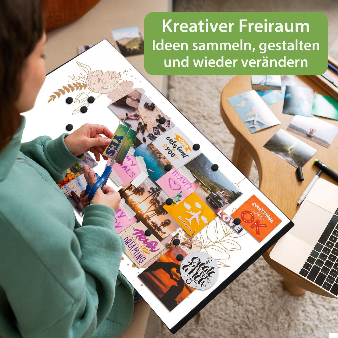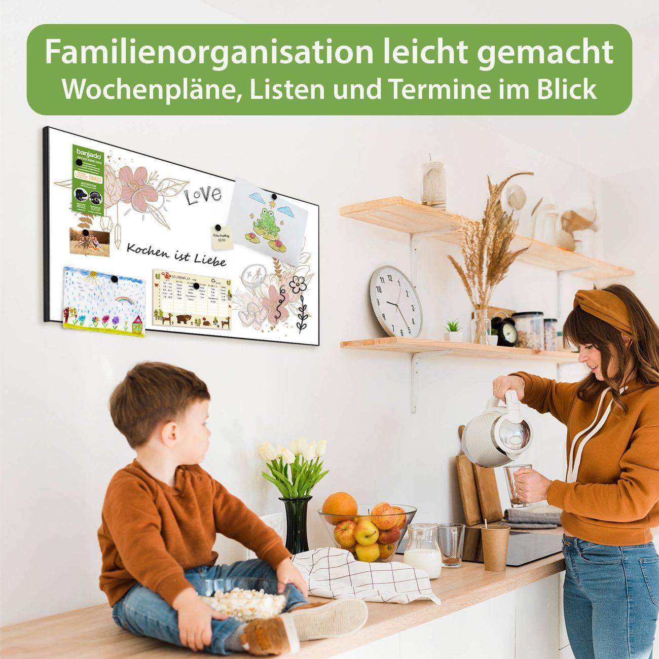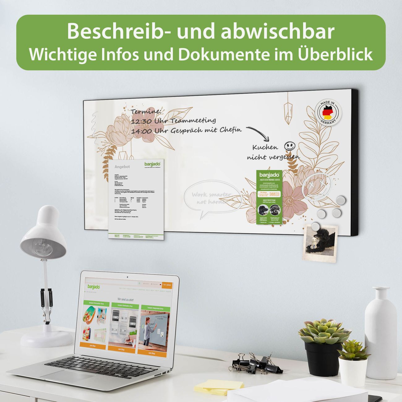 FUNKTION: Die banjado Magnettafel 78x37 cm im Design Motiv Floraler Kranz vereint Funktionalität und modernes Wohndesign auf stilvolle Weise. Diese hochwertige Magnetwand aus Metall hilft Ihnen dabei, Notizen, Fotos, Termine, Einkaufslisten oder Rezepte übersichtlich zu organisieren. Als praktisches Memoboard sorgt sie für Struktur im Alltag und setzt gleichzeitig einen dekorativen Akzent an Ihrer Wand. DESIGN: Die Metalltafel besteht aus robustem, lackiertem Stahl und ist mit allen handelsüblichen Magneten nutzbar. Besonders praktisch ist die beschreibbare Oberfläche. Sie können die Magnettafel ganz einfach mit Kreidestiften beschriften und die Inhalte bei Bedarf mit einem feuchten Tuch wieder entfernen. So eignet sich das Memoboard ideal für Wochenpläne, Menüpläne, To Do Listen oder kreative Botschaften. DETAILS: Mit ihrem großzügigen Querformat von 78x37 cm bietet die Magnettafel ausreichend Platz für Ihre Organisation. Das Motiv Motiv Floraler Kranz bringt eine warme, natürliche Optik in Küche, Flur, Büro oder Homeoffice und wirkt auch ohne Magnete oder Beschriftung wie ein modernes Wandbild. NUTZEN: Auf der Rückseite befinden sich vorgefertigte Löcher für eine schnelle und unkomplizierte Wandmontage. Jede banjado Magnettafel wird in Deutschland gefertigt und steht für Qualität, Langlebigkeit und liebevolle Verarbeitung. Dieses beschreibbare Memoboard ist die perfekte Kombination aus Metalltafel, Designobjekt und praktischer Magnetwand für Ihren Alltag. BANJADO: Wir sind ein kleines Team aus dem Herzen von Sachsen. Wir fertigen alle Artikel von Hand für Sie an, Sie erhalten keine preiswerte Importware. Auf Wunsch können Sie auch Ihr eigenes Foto auf die Magnettafel aufbringen, schreiben Sie uns an. Herzlichst, Ihr banjado-Team