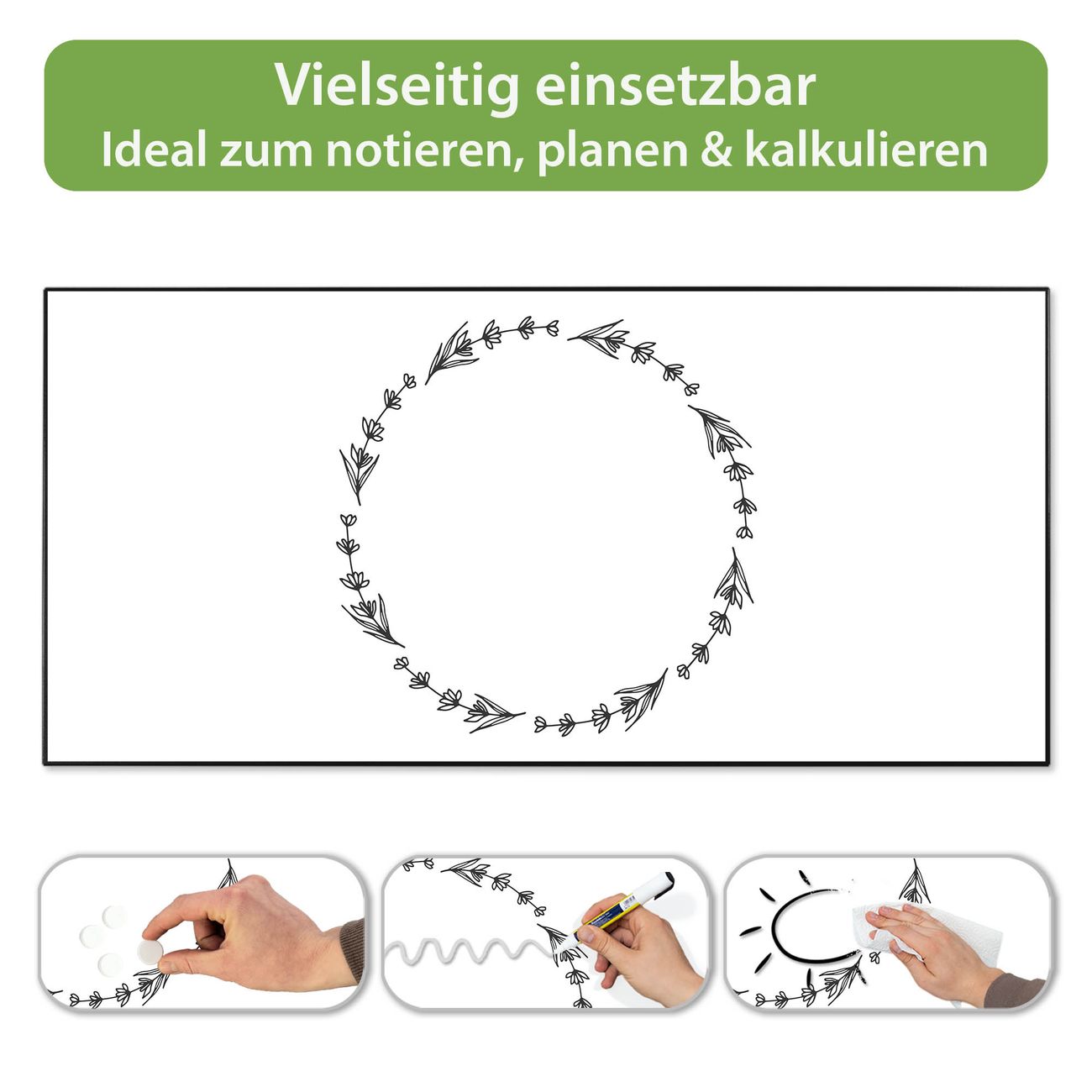 FUNKTION: Die banjado Magnettafel 78x37 cm im Design Motiv Floraler Rahmen 4 vereint Funktionalität und modernes Wohndesign auf stilvolle Weise. Diese hochwertige Magnetwand aus Metall hilft Ihnen dabei, Notizen, Fotos, Termine, Einkaufslisten oder Rezepte übersichtlich zu organisieren. Als praktisches Memoboard sorgt sie für Struktur im Alltag und setzt gleichzeitig einen dekorativen Akzent an Ihrer Wand. DESIGN: Die Metalltafel besteht aus robustem, lackiertem Stahl und ist mit allen handelsüblichen Magneten nutzbar. Besonders praktisch ist die beschreibbare Oberfläche. Sie können die Magnettafel ganz einfach mit Kreidestiften beschriften und die Inhalte bei Bedarf mit einem feuchten Tuch wieder entfernen. So eignet sich das Memoboard ideal für Wochenpläne, Menüpläne, To Do Listen oder kreative Botschaften. DETAILS: Mit ihrem großzügigen Querformat von 78x37 cm bietet die Magnettafel ausreichend Platz für Ihre Organisation. Das Motiv Motiv Floraler Rahmen 4 bringt eine warme, natürliche Optik in Küche, Flur, Büro oder Homeoffice und wirkt auch ohne Magnete oder Beschriftung wie ein modernes Wandbild. NUTZEN: Auf der Rückseite befinden sich vorgefertigte Löcher für eine schnelle und unkomplizierte Wandmontage. Jede banjado Magnettafel wird in Deutschland gefertigt und steht für Qualität, Langlebigkeit und liebevolle Verarbeitung. Dieses beschreibbare Memoboard ist die perfekte Kombination aus Metalltafel, Designobjekt und praktischer Magnetwand für Ihren Alltag. BANJADO: Wir sind ein kleines Team aus dem Herzen von Sachsen. Wir fertigen alle Artikel von Hand für Sie an, Sie erhalten keine preiswerte Importware. Auf Wunsch können Sie auch Ihr eigenes Foto auf die Magnettafel aufbringen, schreiben Sie uns an. Herzlichst, Ihr banjado-Team