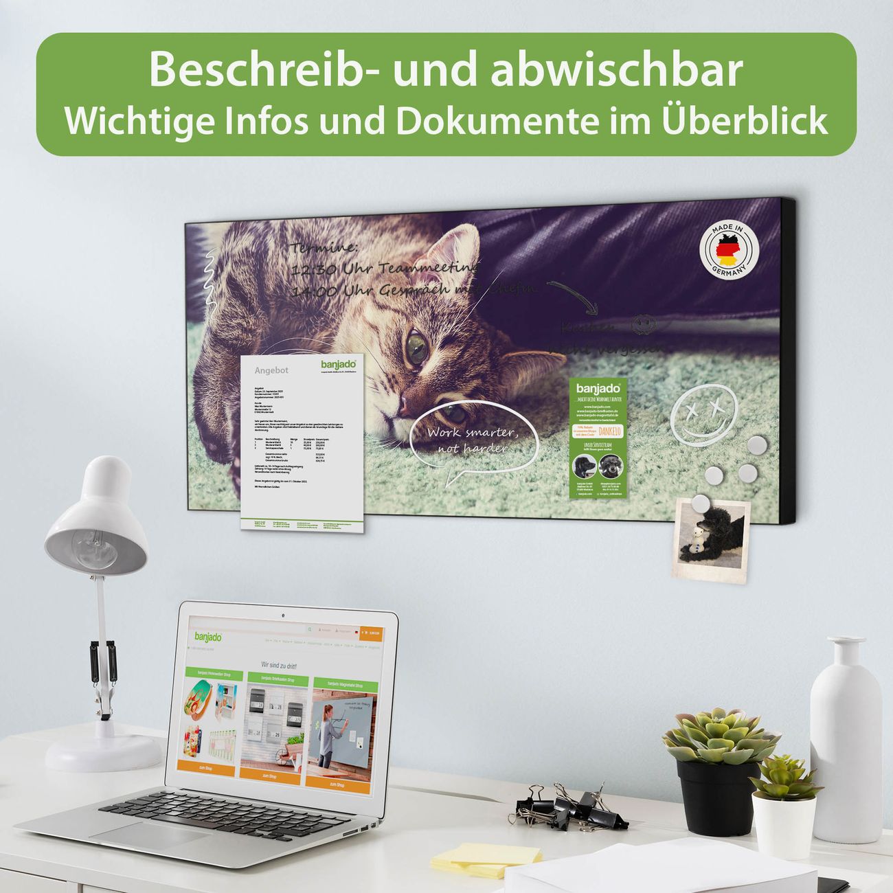 FUNKTION: Die banjado Magnettafel 78x37 cm im Design Motiv Florian vereint Funktionalität und modernes Wohndesign auf stilvolle Weise. Diese hochwertige Magnetwand aus Metall hilft Ihnen dabei, Notizen, Fotos, Termine, Einkaufslisten oder Rezepte übersichtlich zu organisieren. Als praktisches Memoboard sorgt sie für Struktur im Alltag und setzt gleichzeitig einen dekorativen Akzent an Ihrer Wand. DESIGN: Die Metalltafel besteht aus robustem, lackiertem Stahl und ist mit allen handelsüblichen Magneten nutzbar. Besonders praktisch ist die beschreibbare Oberfläche. Sie können die Magnettafel ganz einfach mit Kreidestiften beschriften und die Inhalte bei Bedarf mit einem feuchten Tuch wieder entfernen. So eignet sich das Memoboard ideal für Wochenpläne, Menüpläne, To Do Listen oder kreative Botschaften. DETAILS: Mit ihrem großzügigen Querformat von 78x37 cm bietet die Magnettafel ausreichend Platz für Ihre Organisation. Das Motiv Motiv Florian bringt eine warme, natürliche Optik in Küche, Flur, Büro oder Homeoffice und wirkt auch ohne Magnete oder Beschriftung wie ein modernes Wandbild. NUTZEN: Auf der Rückseite befinden sich vorgefertigte Löcher für eine schnelle und unkomplizierte Wandmontage. Jede banjado Magnettafel wird in Deutschland gefertigt und steht für Qualität, Langlebigkeit und liebevolle Verarbeitung. Dieses beschreibbare Memoboard ist die perfekte Kombination aus Metalltafel, Designobjekt und praktischer Magnetwand für Ihren Alltag. BANJADO: Wir sind ein kleines Team aus dem Herzen von Sachsen. Wir fertigen alle Artikel von Hand für Sie an, Sie erhalten keine preiswerte Importware. Auf Wunsch können Sie auch Ihr eigenes Foto auf die Magnettafel aufbringen, schreiben Sie uns an. Herzlichst, Ihr banjado-Team