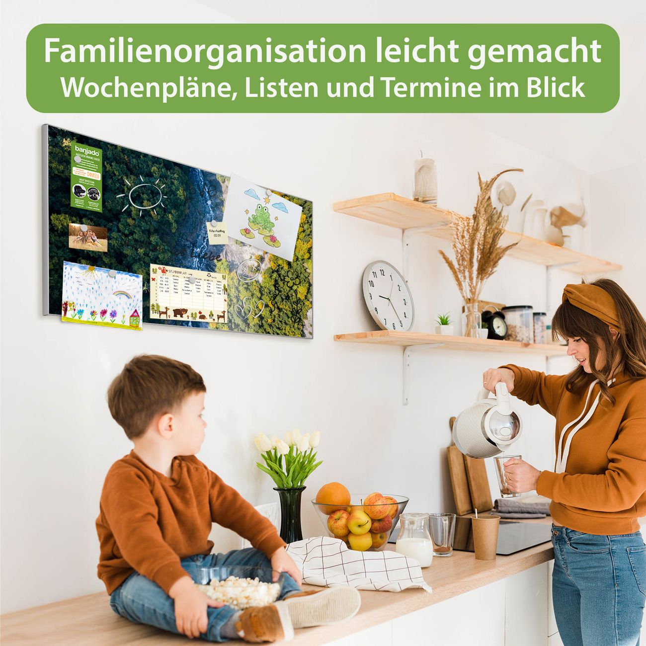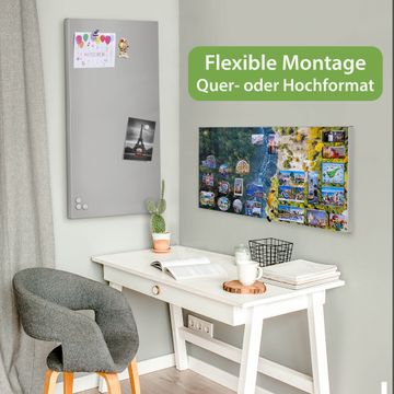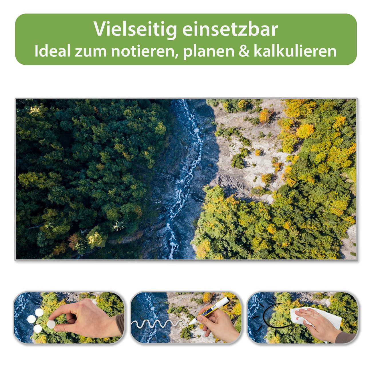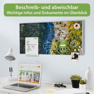 FUNKTION: Die banjado Magnettafel 78x37 cm im Design Motiv Fluss im Tal vereint Funktionalität und modernes Wohndesign auf stilvolle Weise. Diese hochwertige Magnetwand aus Metall hilft Ihnen dabei, Notizen, Fotos, Termine, Einkaufslisten oder Rezepte übersichtlich zu organisieren. Als praktisches Memoboard sorgt sie für Struktur im Alltag und setzt gleichzeitig einen dekorativen Akzent an Ihrer Wand. DESIGN: Die Metalltafel besteht aus robustem, lackiertem Stahl und ist mit allen handelsüblichen Magneten nutzbar. Besonders praktisch ist die beschreibbare Oberfläche. Sie können die Magnettafel ganz einfach mit Kreidestiften beschriften und die Inhalte bei Bedarf mit einem feuchten Tuch wieder entfernen. So eignet sich das Memoboard ideal für Wochenpläne, Menüpläne, To Do Listen oder kreative Botschaften. DETAILS: Mit ihrem großzügigen Querformat von 78x37 cm bietet die Magnettafel ausreichend Platz für Ihre Organisation. Das Motiv Motiv Fluss im Tal bringt eine warme, natürliche Optik in Küche, Flur, Büro oder Homeoffice und wirkt auch ohne Magnete oder Beschriftung wie ein modernes Wandbild. NUTZEN: Auf der Rückseite befinden sich vorgefertigte Löcher für eine schnelle und unkomplizierte Wandmontage. Jede banjado Magnettafel wird in Deutschland gefertigt und steht für Qualität, Langlebigkeit und liebevolle Verarbeitung. Dieses beschreibbare Memoboard ist die perfekte Kombination aus Metalltafel, Designobjekt und praktischer Magnetwand für Ihren Alltag. BANJADO: Wir sind ein kleines Team aus dem Herzen von Sachsen. Wir fertigen alle Artikel von Hand für Sie an, Sie erhalten keine preiswerte Importware. Auf Wunsch können Sie auch Ihr eigenes Foto auf die Magnettafel aufbringen, schreiben Sie uns an. Herzlichst, Ihr banjado-Team