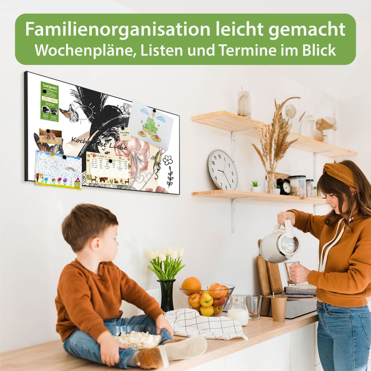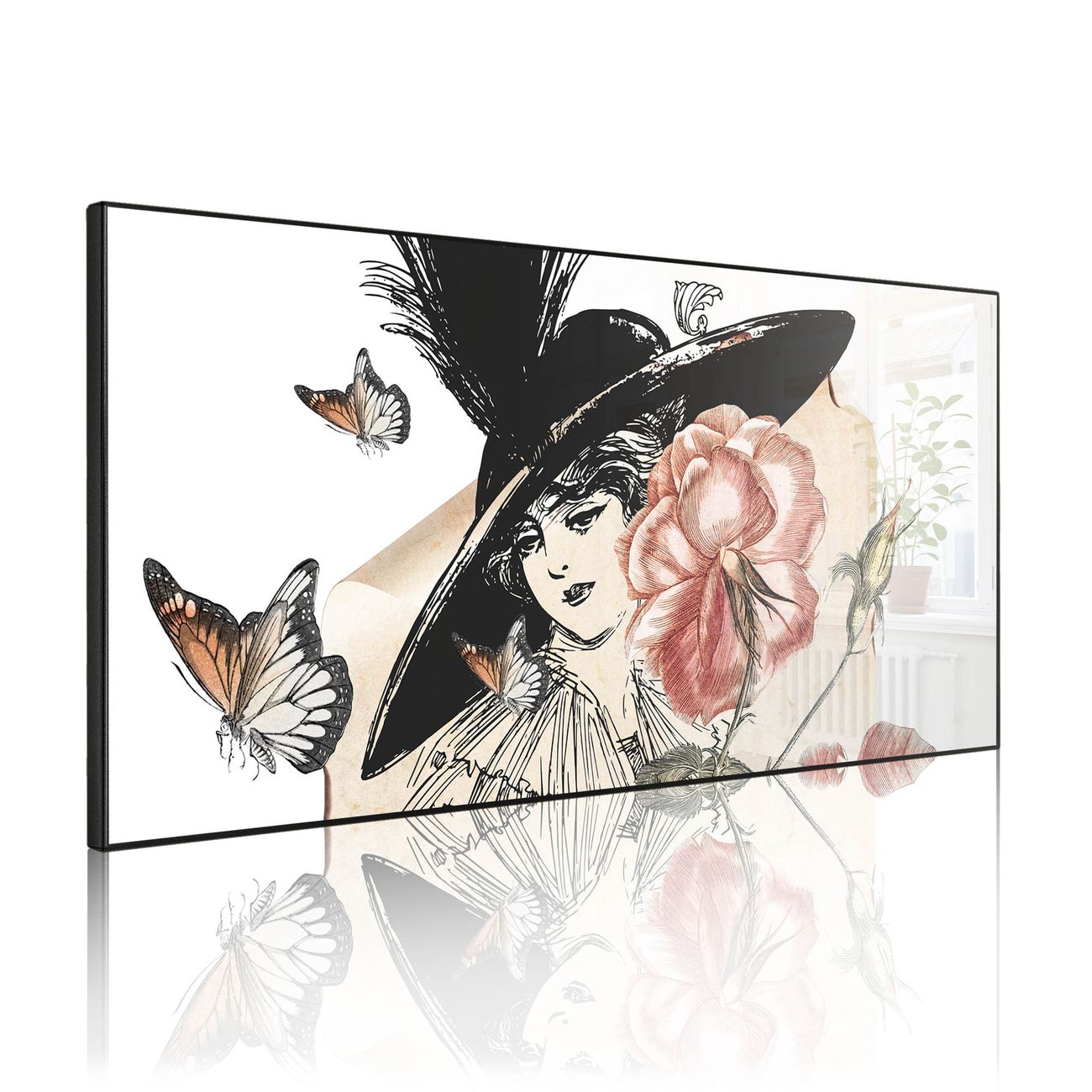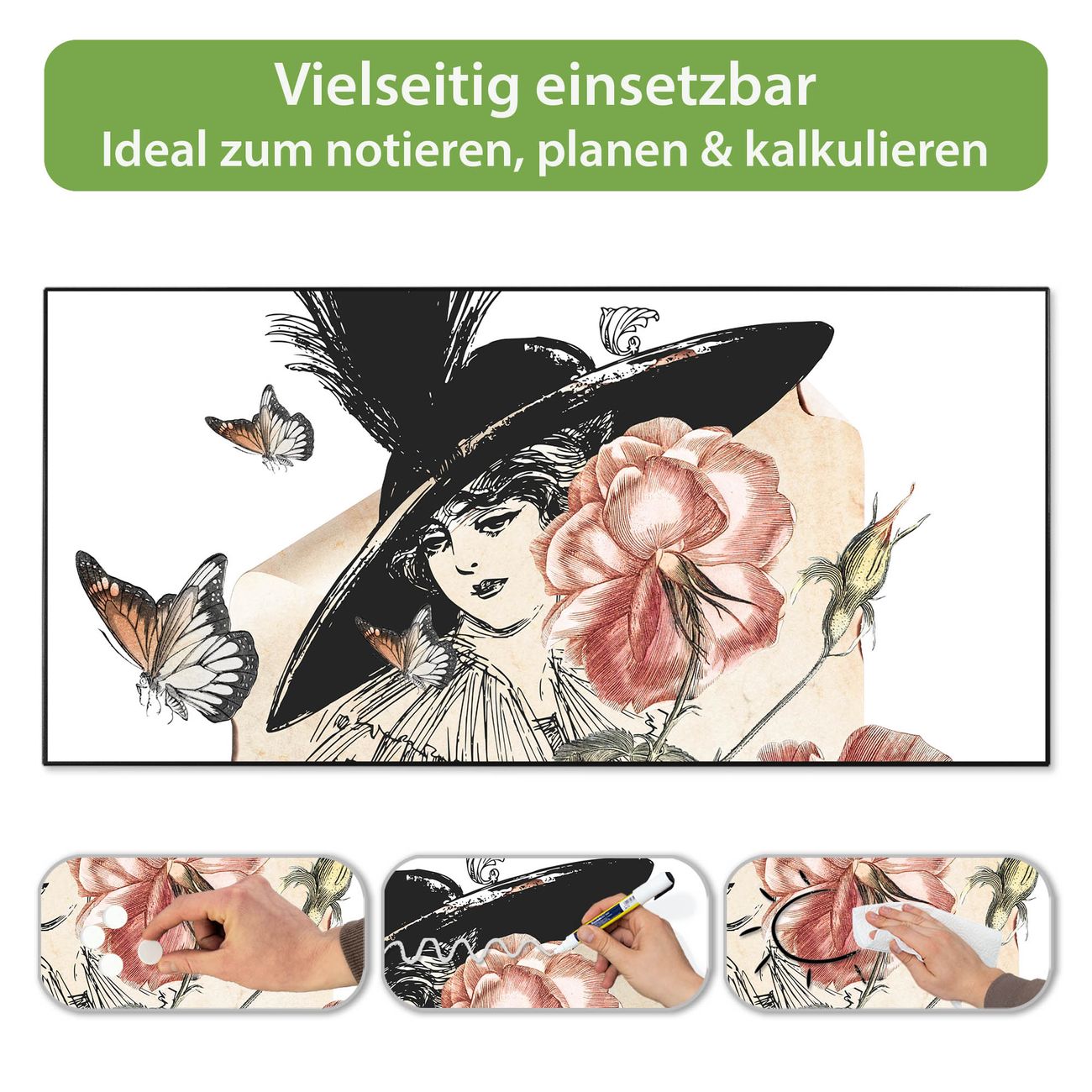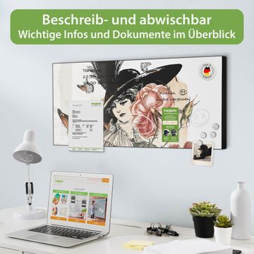 FUNKTION: Die banjado Magnettafel 78x37 cm im Design Motiv Frau und Blühten Vintage vereint Funktionalität und modernes Wohndesign auf stilvolle Weise. Diese hochwertige Magnetwand aus Metall hilft Ihnen dabei, Notizen, Fotos, Termine, Einkaufslisten oder Rezepte übersichtlich zu organisieren. Als praktisches Memoboard sorgt sie für Struktur im Alltag und setzt gleichzeitig einen dekorativen Akzent an Ihrer Wand. DESIGN: Die Metalltafel besteht aus robustem, lackiertem Stahl und ist mit allen handelsüblichen Magneten nutzbar. Besonders praktisch ist die beschreibbare Oberfläche. Sie können die Magnettafel ganz einfach mit Kreidestiften beschriften und die Inhalte bei Bedarf mit einem feuchten Tuch wieder entfernen. So eignet sich das Memoboard ideal für Wochenpläne, Menüpläne, To Do Listen oder kreative Botschaften. DETAILS: Mit ihrem großzügigen Querformat von 78x37 cm bietet die Magnettafel ausreichend Platz für Ihre Organisation. Das Motiv Motiv Frau und Blühten Vintage bringt eine warme, natürliche Optik in Küche, Flur, Büro oder Homeoffice und wirkt auch ohne Magnete oder Beschriftung wie ein modernes Wandbild. NUTZEN: Auf der Rückseite befinden sich vorgefertigte Löcher für eine schnelle und unkomplizierte Wandmontage. Jede banjado Magnettafel wird in Deutschland gefertigt und steht für Qualität, Langlebigkeit und liebevolle Verarbeitung. Dieses beschreibbare Memoboard ist die perfekte Kombination aus Metalltafel, Designobjekt und praktischer Magnetwand für Ihren Alltag. BANJADO: Wir sind ein kleines Team aus dem Herzen von Sachsen. Wir fertigen alle Artikel von Hand für Sie an, Sie erhalten keine preiswerte Importware. Auf Wunsch können Sie auch Ihr eigenes Foto auf die Magnettafel aufbringen, schreiben Sie uns an. Herzlichst, Ihr banjado-Team
