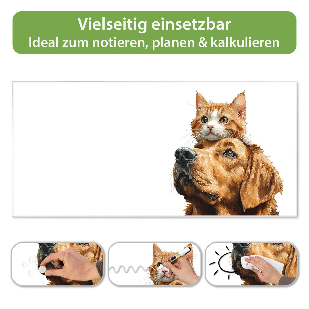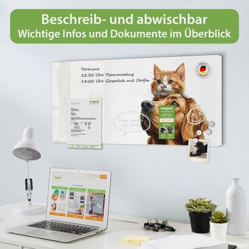 FUNKTION: Die banjado Magnettafel 78x37 cm im Design Motiv Freundschaft in Fell vereint Funktionalität und modernes Wohndesign auf stilvolle Weise. Diese hochwertige Magnetwand aus Metall hilft Ihnen dabei, Notizen, Fotos, Termine, Einkaufslisten oder Rezepte übersichtlich zu organisieren. Als praktisches Memoboard sorgt sie für Struktur im Alltag und setzt gleichzeitig einen dekorativen Akzent an Ihrer Wand. DESIGN: Die Metalltafel besteht aus robustem, lackiertem Stahl und ist mit allen handelsüblichen Magneten nutzbar. Besonders praktisch ist die beschreibbare Oberfläche. Sie können die Magnettafel ganz einfach mit Kreidestiften beschriften und die Inhalte bei Bedarf mit einem feuchten Tuch wieder entfernen. So eignet sich das Memoboard ideal für Wochenpläne, Menüpläne, To Do Listen oder kreative Botschaften. DETAILS: Mit ihrem großzügigen Querformat von 78x37 cm bietet die Magnettafel ausreichend Platz für Ihre Organisation. Das Motiv Motiv Freundschaft in Fell bringt eine warme, natürliche Optik in Küche, Flur, Büro oder Homeoffice und wirkt auch ohne Magnete oder Beschriftung wie ein modernes Wandbild. NUTZEN: Auf der Rückseite befinden sich vorgefertigte Löcher für eine schnelle und unkomplizierte Wandmontage. Jede banjado Magnettafel wird in Deutschland gefertigt und steht für Qualität, Langlebigkeit und liebevolle Verarbeitung. Dieses beschreibbare Memoboard ist die perfekte Kombination aus Metalltafel, Designobjekt und praktischer Magnetwand für Ihren Alltag. BANJADO: Wir sind ein kleines Team aus dem Herzen von Sachsen. Wir fertigen alle Artikel von Hand für Sie an, Sie erhalten keine preiswerte Importware. Auf Wunsch können Sie auch Ihr eigenes Foto auf die Magnettafel aufbringen, schreiben Sie uns an. Herzlichst, Ihr banjado-Team