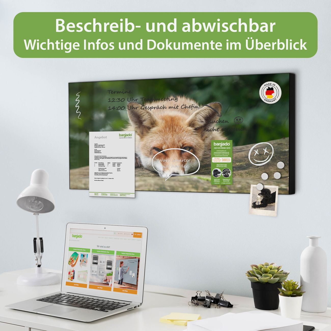 FUNKTION: Die banjado Magnettafel 78x37 cm im Design Motiv Fuchs Relax vereint Funktionalität und modernes Wohndesign auf stilvolle Weise. Diese hochwertige Magnetwand aus Metall hilft Ihnen dabei, Notizen, Fotos, Termine, Einkaufslisten oder Rezepte übersichtlich zu organisieren. Als praktisches Memoboard sorgt sie für Struktur im Alltag und setzt gleichzeitig einen dekorativen Akzent an Ihrer Wand. DESIGN: Die Metalltafel besteht aus robustem, lackiertem Stahl und ist mit allen handelsüblichen Magneten nutzbar. Besonders praktisch ist die beschreibbare Oberfläche. Sie können die Magnettafel ganz einfach mit Kreidestiften beschriften und die Inhalte bei Bedarf mit einem feuchten Tuch wieder entfernen. So eignet sich das Memoboard ideal für Wochenpläne, Menüpläne, To Do Listen oder kreative Botschaften. DETAILS: Mit ihrem großzügigen Querformat von 78x37 cm bietet die Magnettafel ausreichend Platz für Ihre Organisation. Das Motiv Motiv Fuchs Relax bringt eine warme, natürliche Optik in Küche, Flur, Büro oder Homeoffice und wirkt auch ohne Magnete oder Beschriftung wie ein modernes Wandbild. NUTZEN: Auf der Rückseite befinden sich vorgefertigte Löcher für eine schnelle und unkomplizierte Wandmontage. Jede banjado Magnettafel wird in Deutschland gefertigt und steht für Qualität, Langlebigkeit und liebevolle Verarbeitung. Dieses beschreibbare Memoboard ist die perfekte Kombination aus Metalltafel, Designobjekt und praktischer Magnetwand für Ihren Alltag. BANJADO: Wir sind ein kleines Team aus dem Herzen von Sachsen. Wir fertigen alle Artikel von Hand für Sie an, Sie erhalten keine preiswerte Importware. Auf Wunsch können Sie auch Ihr eigenes Foto auf die Magnettafel aufbringen, schreiben Sie uns an. Herzlichst, Ihr banjado-Team