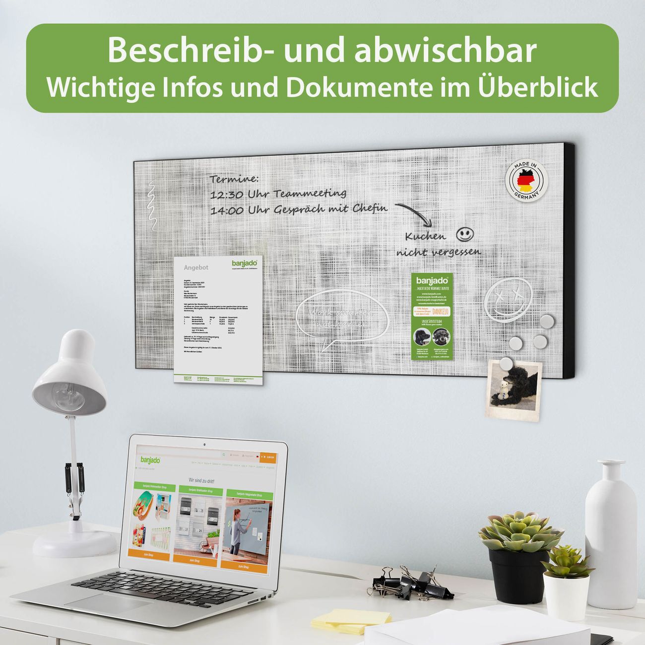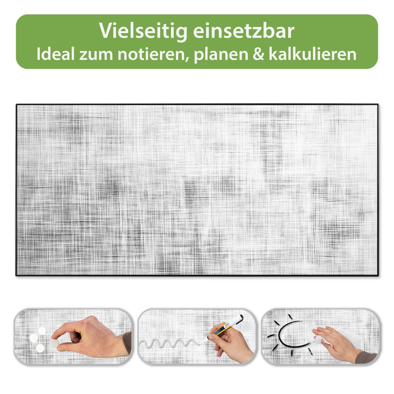 FUNKTION: Die banjado Magnettafel 78x37 cm im Design Motiv Gewebtes Gitter Grau vereint Funktionalität und modernes Wohndesign auf stilvolle Weise. Diese hochwertige Magnetwand aus Metall hilft Ihnen dabei, Notizen, Fotos, Termine, Einkaufslisten oder Rezepte übersichtlich zu organisieren. Als praktisches Memoboard sorgt sie für Struktur im Alltag und setzt gleichzeitig einen dekorativen Akzent an Ihrer Wand. DESIGN: Die Metalltafel besteht aus robustem, lackiertem Stahl und ist mit allen handelsüblichen Magneten nutzbar. Besonders praktisch ist die beschreibbare Oberfläche. Sie können die Magnettafel ganz einfach mit Kreidestiften beschriften und die Inhalte bei Bedarf mit einem feuchten Tuch wieder entfernen. So eignet sich das Memoboard ideal für Wochenpläne, Menüpläne, To Do Listen oder kreative Botschaften. DETAILS: Mit ihrem großzügigen Querformat von 78x37 cm bietet die Magnettafel ausreichend Platz für Ihre Organisation. Das Motiv Motiv Gewebtes Gitter Grau bringt eine warme, natürliche Optik in Küche, Flur, Büro oder Homeoffice und wirkt auch ohne Magnete oder Beschriftung wie ein modernes Wandbild. NUTZEN: Auf der Rückseite befinden sich vorgefertigte Löcher für eine schnelle und unkomplizierte Wandmontage. Jede banjado Magnettafel wird in Deutschland gefertigt und steht für Qualität, Langlebigkeit und liebevolle Verarbeitung. Dieses beschreibbare Memoboard ist die perfekte Kombination aus Metalltafel, Designobjekt und praktischer Magnetwand für Ihren Alltag. BANJADO: Wir sind ein kleines Team aus dem Herzen von Sachsen. Wir fertigen alle Artikel von Hand für Sie an, Sie erhalten keine preiswerte Importware. Auf Wunsch können Sie auch Ihr eigenes Foto auf die Magnettafel aufbringen, schreiben Sie uns an. Herzlichst, Ihr banjado-Team
