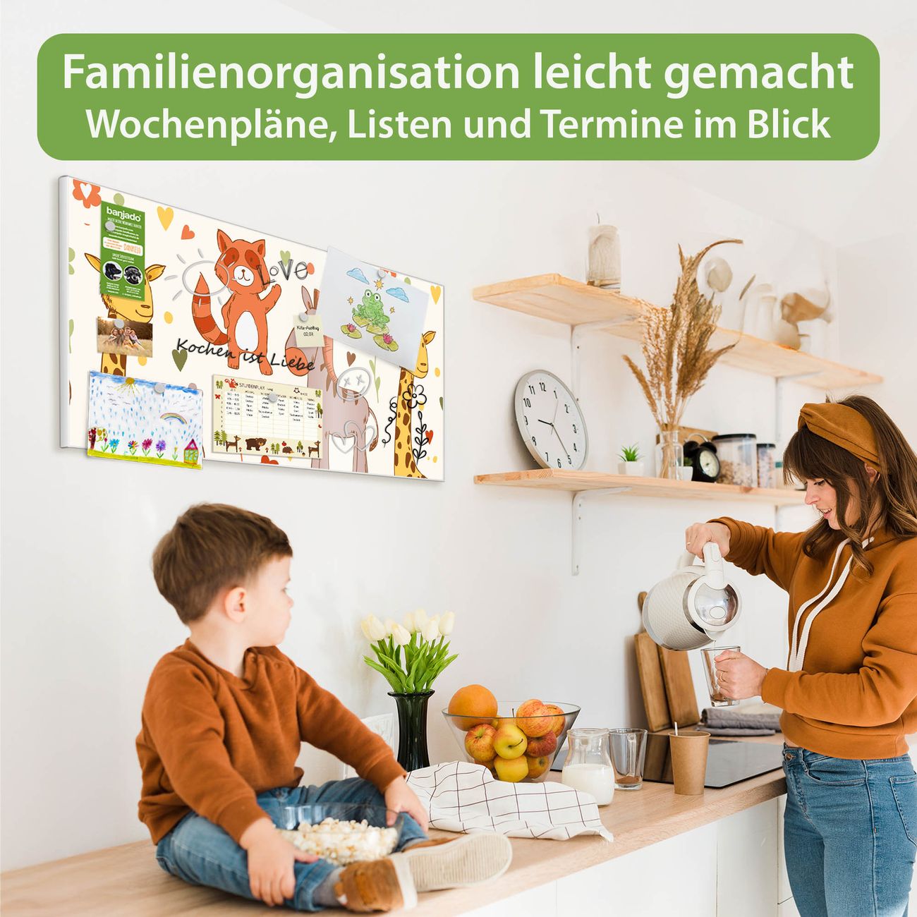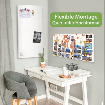 FUNKTION: Die banjado Magnettafel 78x37 cm im Design Motiv Giraffe & Co vereint Funktionalität und modernes Wohndesign auf stilvolle Weise. Diese hochwertige Magnetwand aus Metall hilft Ihnen dabei, Notizen, Fotos, Termine, Einkaufslisten oder Rezepte übersichtlich zu organisieren. Als praktisches Memoboard sorgt sie für Struktur im Alltag und setzt gleichzeitig einen dekorativen Akzent an Ihrer Wand. DESIGN: Die Metalltafel besteht aus robustem, lackiertem Stahl und ist mit allen handelsüblichen Magneten nutzbar. Besonders praktisch ist die beschreibbare Oberfläche. Sie können die Magnettafel ganz einfach mit Kreidestiften beschriften und die Inhalte bei Bedarf mit einem feuchten Tuch wieder entfernen. So eignet sich das Memoboard ideal für Wochenpläne, Menüpläne, To Do Listen oder kreative Botschaften. DETAILS: Mit ihrem großzügigen Querformat von 78x37 cm bietet die Magnettafel ausreichend Platz für Ihre Organisation. Das Motiv Motiv Giraffe & Co bringt eine warme, natürliche Optik in Küche, Flur, Büro oder Homeoffice und wirkt auch ohne Magnete oder Beschriftung wie ein modernes Wandbild. NUTZEN: Auf der Rückseite befinden sich vorgefertigte Löcher für eine schnelle und unkomplizierte Wandmontage. Jede banjado Magnettafel wird in Deutschland gefertigt und steht für Qualität, Langlebigkeit und liebevolle Verarbeitung. Dieses beschreibbare Memoboard ist die perfekte Kombination aus Metalltafel, Designobjekt und praktischer Magnetwand für Ihren Alltag. BANJADO: Wir sind ein kleines Team aus dem Herzen von Sachsen. Wir fertigen alle Artikel von Hand für Sie an, Sie erhalten keine preiswerte Importware. Auf Wunsch können Sie auch Ihr eigenes Foto auf die Magnettafel aufbringen, schreiben Sie uns an. Herzlichst, Ihr banjado-Team