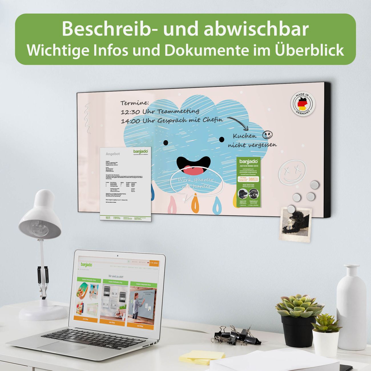 FUNKTION: Die banjado Magnettafel 78x37 cm im Design Motiv glückliche Regenwolke vereint Funktionalität und modernes Wohndesign auf stilvolle Weise. Diese hochwertige Magnetwand aus Metall hilft Ihnen dabei, Notizen, Fotos, Termine, Einkaufslisten oder Rezepte übersichtlich zu organisieren. Als praktisches Memoboard sorgt sie für Struktur im Alltag und setzt gleichzeitig einen dekorativen Akzent an Ihrer Wand. DESIGN: Die Metalltafel besteht aus robustem, lackiertem Stahl und ist mit allen handelsüblichen Magneten nutzbar. Besonders praktisch ist die beschreibbare Oberfläche. Sie können die Magnettafel ganz einfach mit Kreidestiften beschriften und die Inhalte bei Bedarf mit einem feuchten Tuch wieder entfernen. So eignet sich das Memoboard ideal für Wochenpläne, Menüpläne, To Do Listen oder kreative Botschaften. DETAILS: Mit ihrem großzügigen Querformat von 78x37 cm bietet die Magnettafel ausreichend Platz für Ihre Organisation. Das Motiv Motiv glückliche Regenwolke bringt eine warme, natürliche Optik in Küche, Flur, Büro oder Homeoffice und wirkt auch ohne Magnete oder Beschriftung wie ein modernes Wandbild. NUTZEN: Auf der Rückseite befinden sich vorgefertigte Löcher für eine schnelle und unkomplizierte Wandmontage. Jede banjado Magnettafel wird in Deutschland gefertigt und steht für Qualität, Langlebigkeit und liebevolle Verarbeitung. Dieses beschreibbare Memoboard ist die perfekte Kombination aus Metalltafel, Designobjekt und praktischer Magnetwand für Ihren Alltag. BANJADO: Wir sind ein kleines Team aus dem Herzen von Sachsen. Wir fertigen alle Artikel von Hand für Sie an, Sie erhalten keine preiswerte Importware. Auf Wunsch können Sie auch Ihr eigenes Foto auf die Magnettafel aufbringen, schreiben Sie uns an. Herzlichst, Ihr banjado-Team