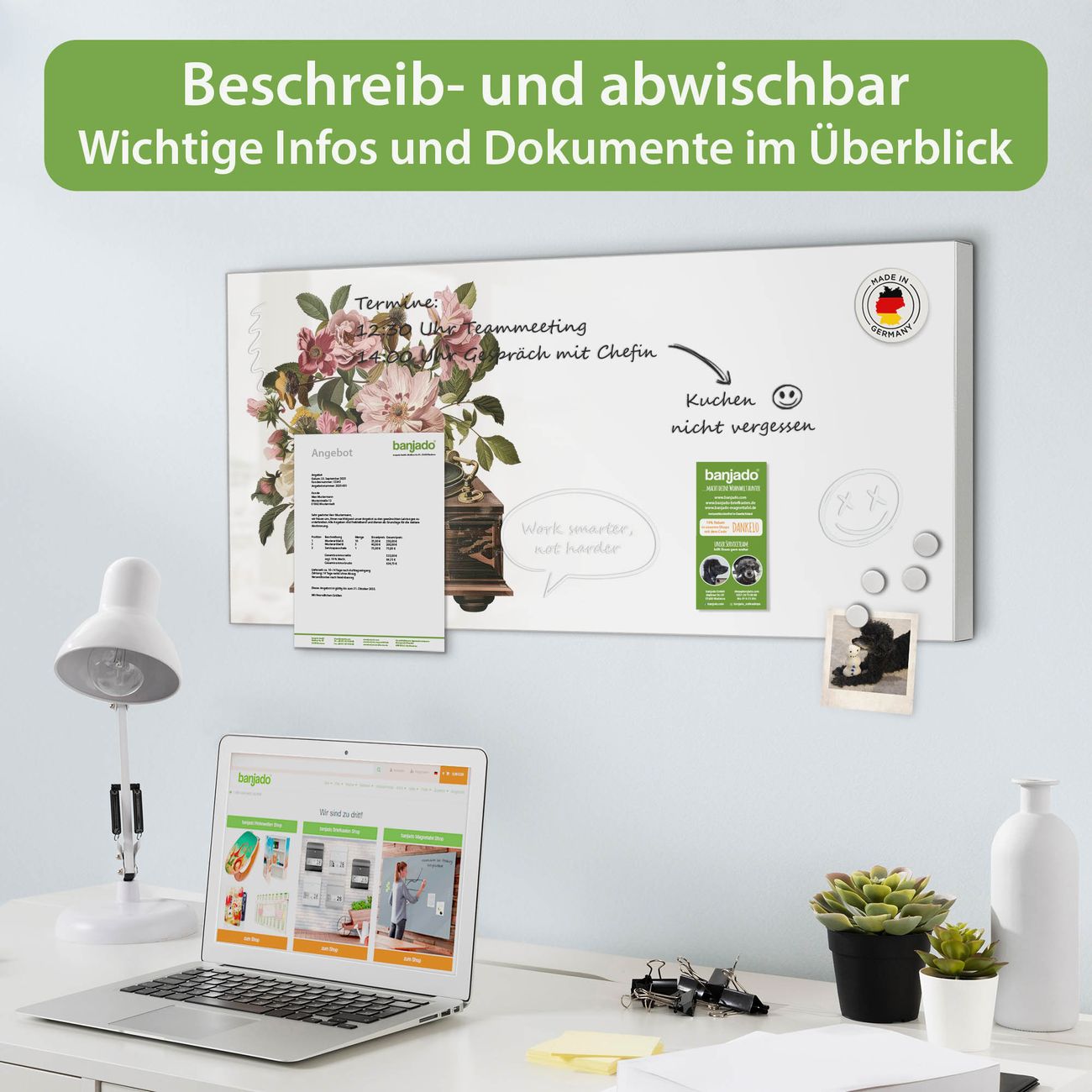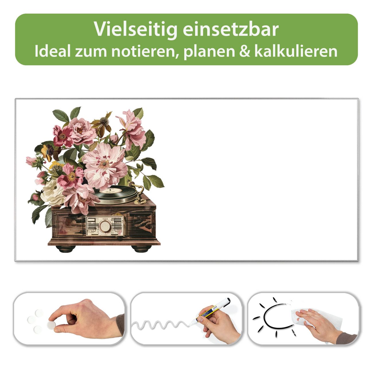 FUNKTION: Die banjado Magnettafel 78x37 cm im Design Motiv Grammophon Vintage vereint Funktionalität und modernes Wohndesign auf stilvolle Weise. Diese hochwertige Magnetwand aus Metall hilft Ihnen dabei, Notizen, Fotos, Termine, Einkaufslisten oder Rezepte übersichtlich zu organisieren. Als praktisches Memoboard sorgt sie für Struktur im Alltag und setzt gleichzeitig einen dekorativen Akzent an Ihrer Wand. DESIGN: Die Metalltafel besteht aus robustem, lackiertem Stahl und ist mit allen handelsüblichen Magneten nutzbar. Besonders praktisch ist die beschreibbare Oberfläche. Sie können die Magnettafel ganz einfach mit Kreidestiften beschriften und die Inhalte bei Bedarf mit einem feuchten Tuch wieder entfernen. So eignet sich das Memoboard ideal für Wochenpläne, Menüpläne, To Do Listen oder kreative Botschaften. DETAILS: Mit ihrem großzügigen Querformat von 78x37 cm bietet die Magnettafel ausreichend Platz für Ihre Organisation. Das Motiv Motiv Grammophon Vintage bringt eine warme, natürliche Optik in Küche, Flur, Büro oder Homeoffice und wirkt auch ohne Magnete oder Beschriftung wie ein modernes Wandbild. NUTZEN: Auf der Rückseite befinden sich vorgefertigte Löcher für eine schnelle und unkomplizierte Wandmontage. Jede banjado Magnettafel wird in Deutschland gefertigt und steht für Qualität, Langlebigkeit und liebevolle Verarbeitung. Dieses beschreibbare Memoboard ist die perfekte Kombination aus Metalltafel, Designobjekt und praktischer Magnetwand für Ihren Alltag. BANJADO: Wir sind ein kleines Team aus dem Herzen von Sachsen. Wir fertigen alle Artikel von Hand für Sie an, Sie erhalten keine preiswerte Importware. Auf Wunsch können Sie auch Ihr eigenes Foto auf die Magnettafel aufbringen, schreiben Sie uns an. Herzlichst, Ihr banjado-Team