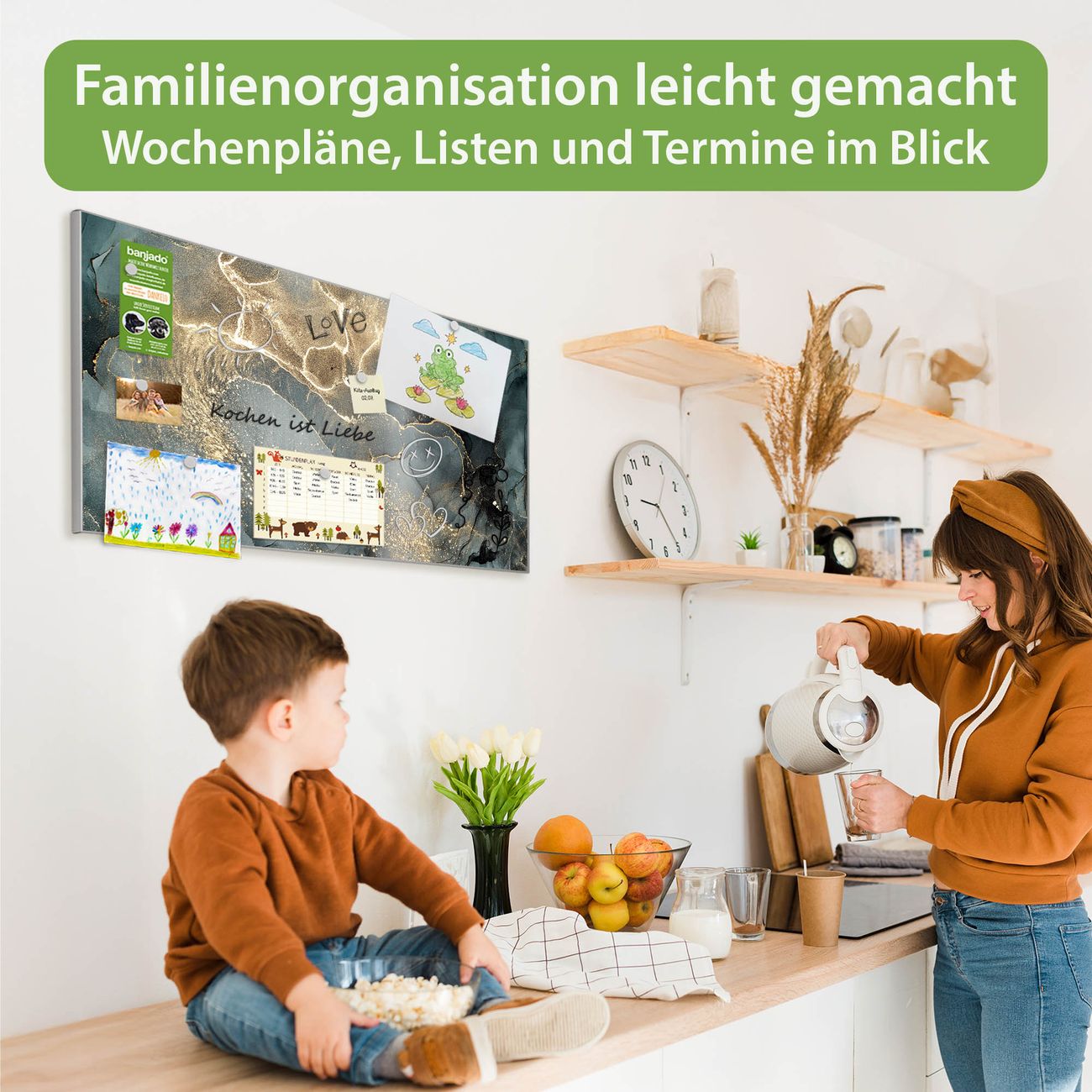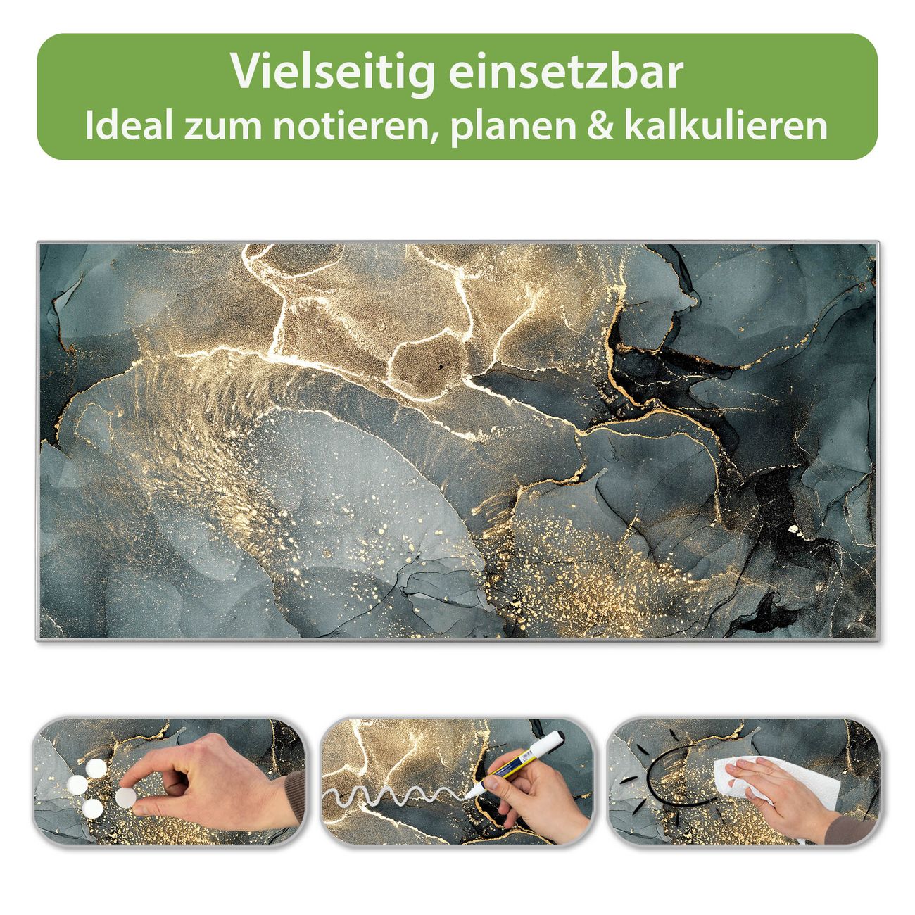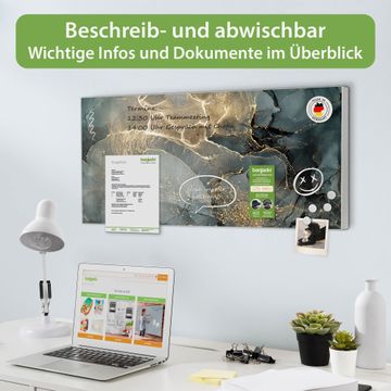 FUNKTION: Die banjado Magnettafel 78x37 cm im Design Motiv grauer Marmor mit Gold 1 vereint Funktionalität und modernes Wohndesign auf stilvolle Weise. Diese hochwertige Magnetwand aus Metall hilft Ihnen dabei, Notizen, Fotos, Termine, Einkaufslisten oder Rezepte übersichtlich zu organisieren. Als praktisches Memoboard sorgt sie für Struktur im Alltag und setzt gleichzeitig einen dekorativen Akzent an Ihrer Wand. DESIGN: Die Metalltafel besteht aus robustem, lackiertem Stahl und ist mit allen handelsüblichen Magneten nutzbar. Besonders praktisch ist die beschreibbare Oberfläche. Sie können die Magnettafel ganz einfach mit Kreidestiften beschriften und die Inhalte bei Bedarf mit einem feuchten Tuch wieder entfernen. So eignet sich das Memoboard ideal für Wochenpläne, Menüpläne, To Do Listen oder kreative Botschaften. DETAILS: Mit ihrem großzügigen Querformat von 78x37 cm bietet die Magnettafel ausreichend Platz für Ihre Organisation. Das Motiv Motiv grauer Marmor mit Gold 1 bringt eine warme, natürliche Optik in Küche, Flur, Büro oder Homeoffice und wirkt auch ohne Magnete oder Beschriftung wie ein modernes Wandbild. NUTZEN: Auf der Rückseite befinden sich vorgefertigte Löcher für eine schnelle und unkomplizierte Wandmontage. Jede banjado Magnettafel wird in Deutschland gefertigt und steht für Qualität, Langlebigkeit und liebevolle Verarbeitung. Dieses beschreibbare Memoboard ist die perfekte Kombination aus Metalltafel, Designobjekt und praktischer Magnetwand für Ihren Alltag. BANJADO: Wir sind ein kleines Team aus dem Herzen von Sachsen. Wir fertigen alle Artikel von Hand für Sie an, Sie erhalten keine preiswerte Importware. Auf Wunsch können Sie auch Ihr eigenes Foto auf die Magnettafel aufbringen, schreiben Sie uns an. Herzlichst, Ihr banjado-Team