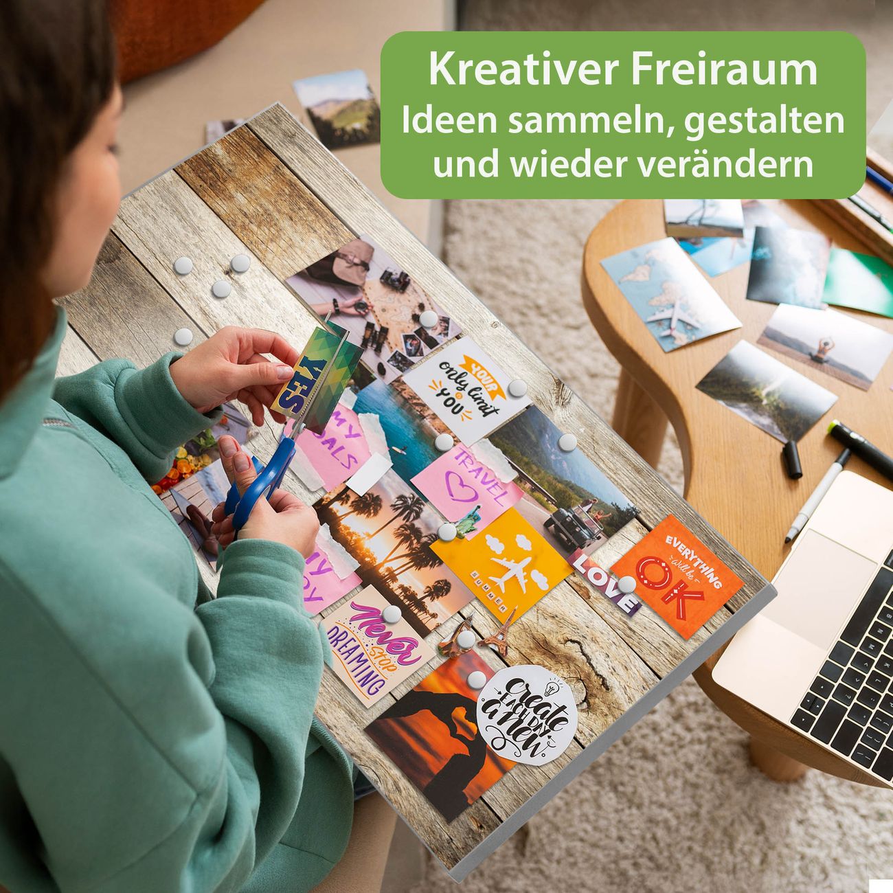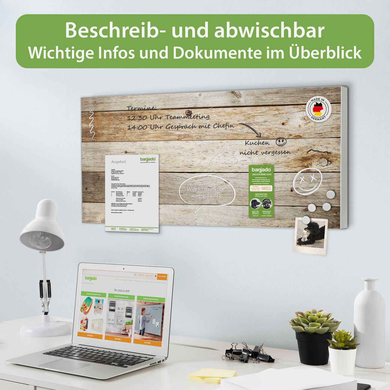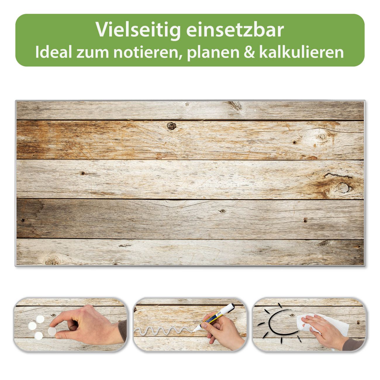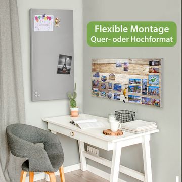 FUNKTION: Die banjado Magnettafel 78x37 cm im Design Motiv Graues Holz vereint Funktionalität und modernes Wohndesign auf stilvolle Weise. Diese hochwertige Magnetwand aus Metall hilft Ihnen dabei, Notizen, Fotos, Termine, Einkaufslisten oder Rezepte übersichtlich zu organisieren. Als praktisches Memoboard sorgt sie für Struktur im Alltag und setzt gleichzeitig einen dekorativen Akzent an Ihrer Wand. DESIGN: Die Metalltafel besteht aus robustem, lackiertem Stahl und ist mit allen handelsüblichen Magneten nutzbar. Besonders praktisch ist die beschreibbare Oberfläche. Sie können die Magnettafel ganz einfach mit Kreidestiften beschriften und die Inhalte bei Bedarf mit einem feuchten Tuch wieder entfernen. So eignet sich das Memoboard ideal für Wochenpläne, Menüpläne, To Do Listen oder kreative Botschaften. DETAILS: Mit ihrem großzügigen Querformat von 78x37 cm bietet die Magnettafel ausreichend Platz für Ihre Organisation. Das Motiv Motiv Graues Holz bringt eine warme, natürliche Optik in Küche, Flur, Büro oder Homeoffice und wirkt auch ohne Magnete oder Beschriftung wie ein modernes Wandbild. NUTZEN: Auf der Rückseite befinden sich vorgefertigte Löcher für eine schnelle und unkomplizierte Wandmontage. Jede banjado Magnettafel wird in Deutschland gefertigt und steht für Qualität, Langlebigkeit und liebevolle Verarbeitung. Dieses beschreibbare Memoboard ist die perfekte Kombination aus Metalltafel, Designobjekt und praktischer Magnetwand für Ihren Alltag. BANJADO: Wir sind ein kleines Team aus dem Herzen von Sachsen. Wir fertigen alle Artikel von Hand für Sie an, Sie erhalten keine preiswerte Importware. Auf Wunsch können Sie auch Ihr eigenes Foto auf die Magnettafel aufbringen, schreiben Sie uns an. Herzlichst, Ihr banjado-Team