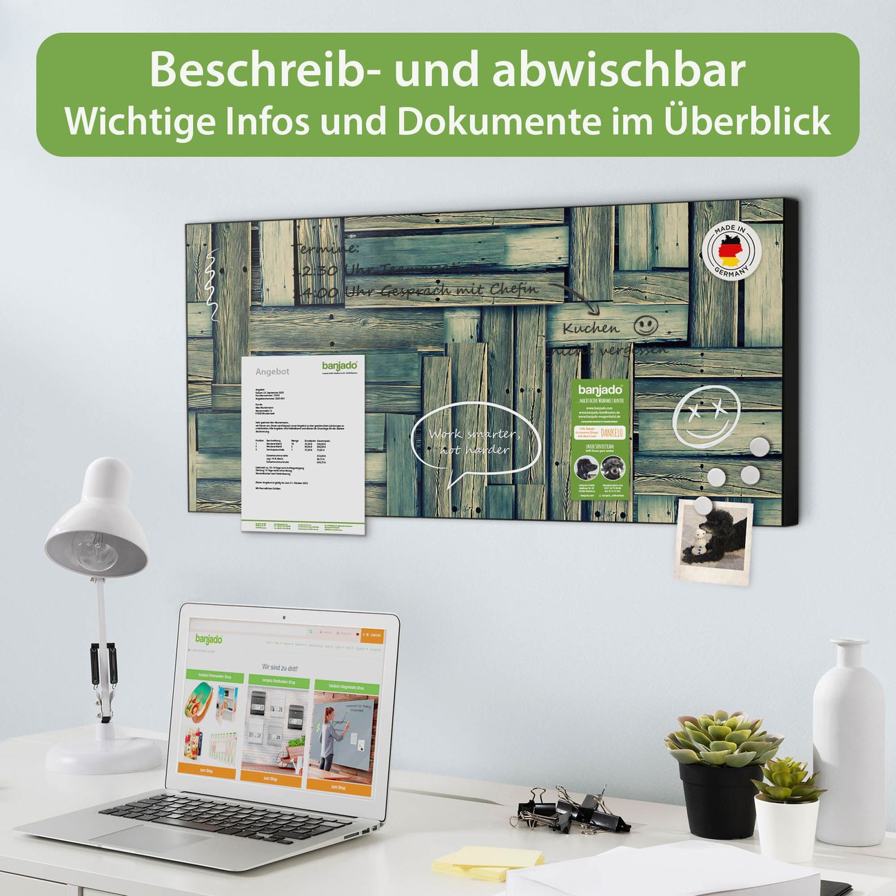 FUNKTION: Die banjado Magnettafel 78x37 cm im Design Motiv Grüne Planken vereint Funktionalität und modernes Wohndesign auf stilvolle Weise. Diese hochwertige Magnetwand aus Metall hilft Ihnen dabei, Notizen, Fotos, Termine, Einkaufslisten oder Rezepte übersichtlich zu organisieren. Als praktisches Memoboard sorgt sie für Struktur im Alltag und setzt gleichzeitig einen dekorativen Akzent an Ihrer Wand. DESIGN: Die Metalltafel besteht aus robustem, lackiertem Stahl und ist mit allen handelsüblichen Magneten nutzbar. Besonders praktisch ist die beschreibbare Oberfläche. Sie können die Magnettafel ganz einfach mit Kreidestiften beschriften und die Inhalte bei Bedarf mit einem feuchten Tuch wieder entfernen. So eignet sich das Memoboard ideal für Wochenpläne, Menüpläne, To Do Listen oder kreative Botschaften. DETAILS: Mit ihrem großzügigen Querformat von 78x37 cm bietet die Magnettafel ausreichend Platz für Ihre Organisation. Das Motiv Motiv Grüne Planken bringt eine warme, natürliche Optik in Küche, Flur, Büro oder Homeoffice und wirkt auch ohne Magnete oder Beschriftung wie ein modernes Wandbild. NUTZEN: Auf der Rückseite befinden sich vorgefertigte Löcher für eine schnelle und unkomplizierte Wandmontage. Jede banjado Magnettafel wird in Deutschland gefertigt und steht für Qualität, Langlebigkeit und liebevolle Verarbeitung. Dieses beschreibbare Memoboard ist die perfekte Kombination aus Metalltafel, Designobjekt und praktischer Magnetwand für Ihren Alltag. BANJADO: Wir sind ein kleines Team aus dem Herzen von Sachsen. Wir fertigen alle Artikel von Hand für Sie an, Sie erhalten keine preiswerte Importware. Auf Wunsch können Sie auch Ihr eigenes Foto auf die Magnettafel aufbringen, schreiben Sie uns an. Herzlichst, Ihr banjado-Team