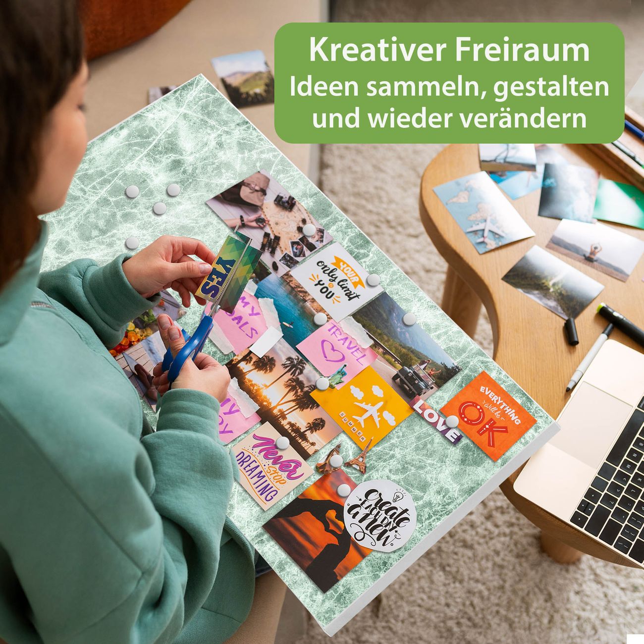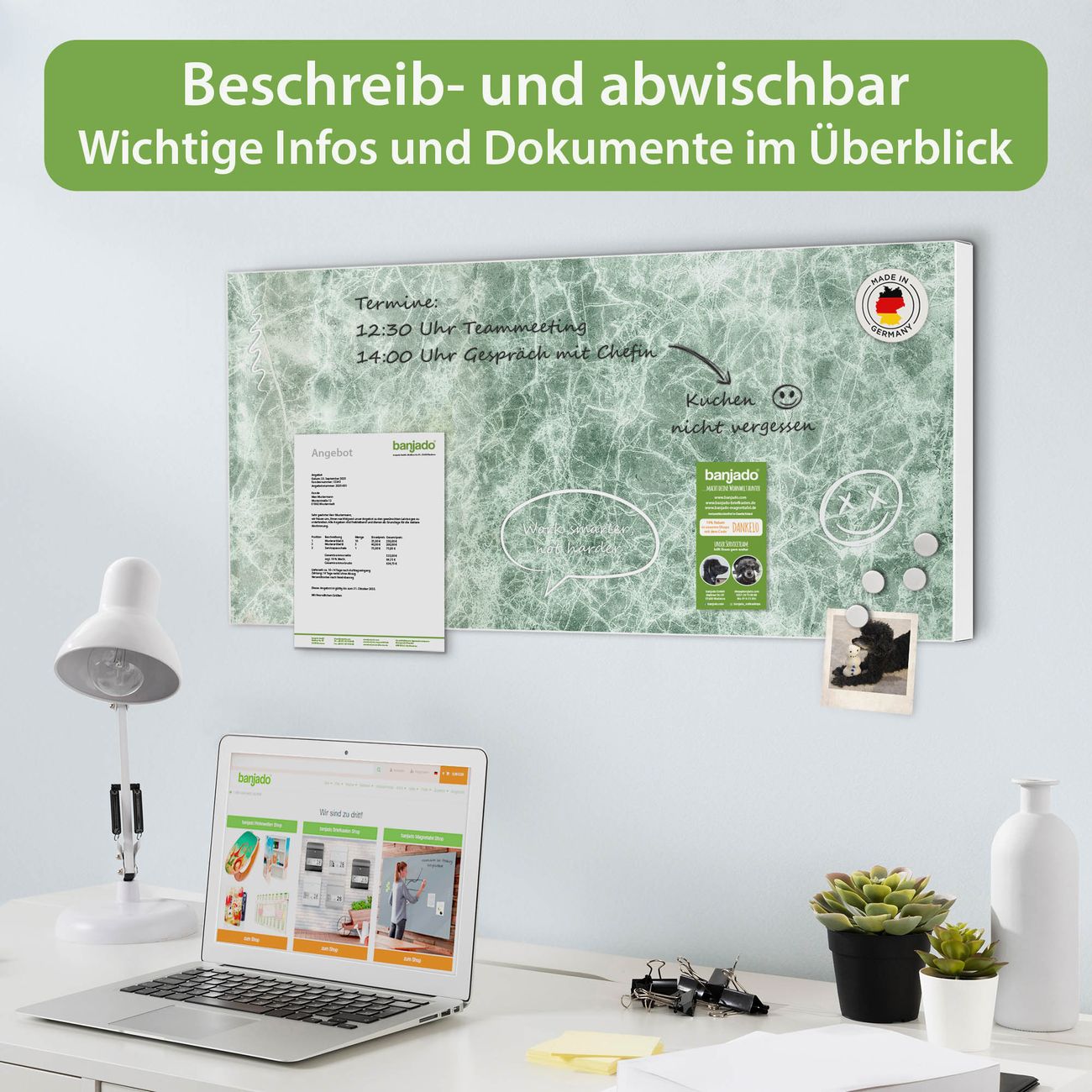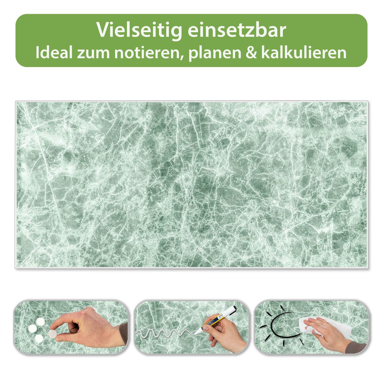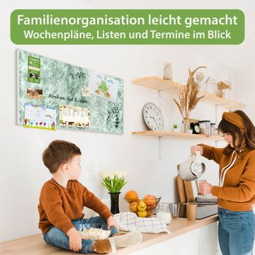 FUNKTION: Die banjado Magnettafel 78x37 cm im Design Motiv Grüner Marmor 1 vereint Funktionalität und modernes Wohndesign auf stilvolle Weise. Diese hochwertige Magnetwand aus Metall hilft Ihnen dabei, Notizen, Fotos, Termine, Einkaufslisten oder Rezepte übersichtlich zu organisieren. Als praktisches Memoboard sorgt sie für Struktur im Alltag und setzt gleichzeitig einen dekorativen Akzent an Ihrer Wand. DESIGN: Die Metalltafel besteht aus robustem, lackiertem Stahl und ist mit allen handelsüblichen Magneten nutzbar. Besonders praktisch ist die beschreibbare Oberfläche. Sie können die Magnettafel ganz einfach mit Kreidestiften beschriften und die Inhalte bei Bedarf mit einem feuchten Tuch wieder entfernen. So eignet sich das Memoboard ideal für Wochenpläne, Menüpläne, To Do Listen oder kreative Botschaften. DETAILS: Mit ihrem großzügigen Querformat von 78x37 cm bietet die Magnettafel ausreichend Platz für Ihre Organisation. Das Motiv Motiv Grüner Marmor 1 bringt eine warme, natürliche Optik in Küche, Flur, Büro oder Homeoffice und wirkt auch ohne Magnete oder Beschriftung wie ein modernes Wandbild. NUTZEN: Auf der Rückseite befinden sich vorgefertigte Löcher für eine schnelle und unkomplizierte Wandmontage. Jede banjado Magnettafel wird in Deutschland gefertigt und steht für Qualität, Langlebigkeit und liebevolle Verarbeitung. Dieses beschreibbare Memoboard ist die perfekte Kombination aus Metalltafel, Designobjekt und praktischer Magnetwand für Ihren Alltag. BANJADO: Wir sind ein kleines Team aus dem Herzen von Sachsen. Wir fertigen alle Artikel von Hand für Sie an, Sie erhalten keine preiswerte Importware. Auf Wunsch können Sie auch Ihr eigenes Foto auf die Magnettafel aufbringen, schreiben Sie uns an. Herzlichst, Ihr banjado-Team