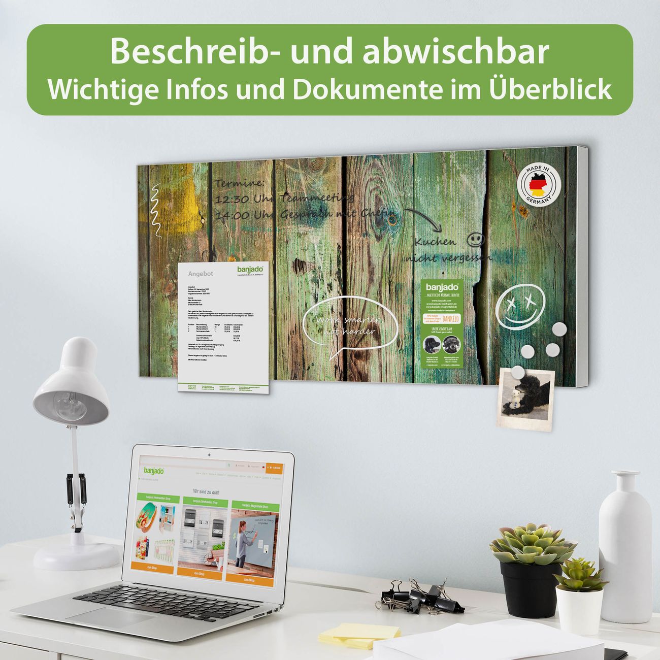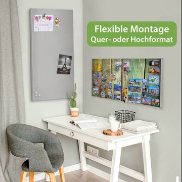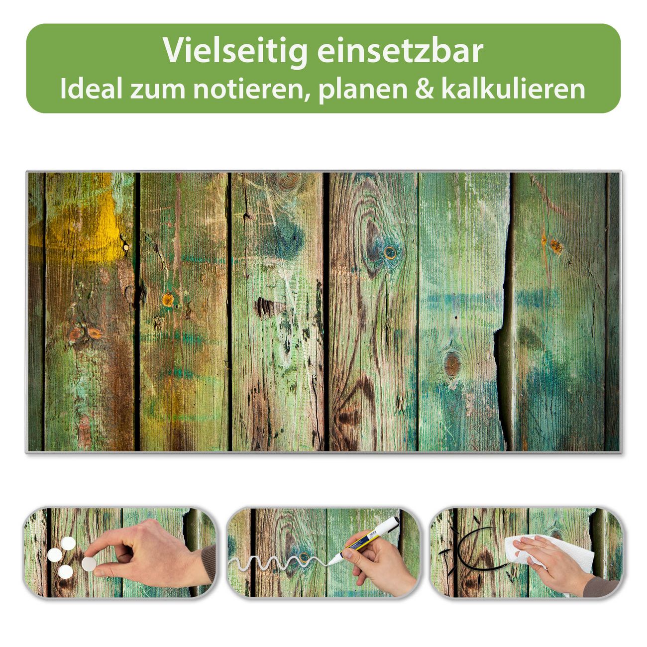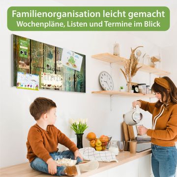 FUNKTION: Die banjado Magnettafel 78x37 cm im Design Motiv Grünes Holz vereint Funktionalität und modernes Wohndesign auf stilvolle Weise. Diese hochwertige Magnetwand aus Metall hilft Ihnen dabei, Notizen, Fotos, Termine, Einkaufslisten oder Rezepte übersichtlich zu organisieren. Als praktisches Memoboard sorgt sie für Struktur im Alltag und setzt gleichzeitig einen dekorativen Akzent an Ihrer Wand. DESIGN: Die Metalltafel besteht aus robustem, lackiertem Stahl und ist mit allen handelsüblichen Magneten nutzbar. Besonders praktisch ist die beschreibbare Oberfläche. Sie können die Magnettafel ganz einfach mit Kreidestiften beschriften und die Inhalte bei Bedarf mit einem feuchten Tuch wieder entfernen. So eignet sich das Memoboard ideal für Wochenpläne, Menüpläne, To Do Listen oder kreative Botschaften. DETAILS: Mit ihrem großzügigen Querformat von 78x37 cm bietet die Magnettafel ausreichend Platz für Ihre Organisation. Das Motiv Motiv Grünes Holz bringt eine warme, natürliche Optik in Küche, Flur, Büro oder Homeoffice und wirkt auch ohne Magnete oder Beschriftung wie ein modernes Wandbild. NUTZEN: Auf der Rückseite befinden sich vorgefertigte Löcher für eine schnelle und unkomplizierte Wandmontage. Jede banjado Magnettafel wird in Deutschland gefertigt und steht für Qualität, Langlebigkeit und liebevolle Verarbeitung. Dieses beschreibbare Memoboard ist die perfekte Kombination aus Metalltafel, Designobjekt und praktischer Magnetwand für Ihren Alltag. BANJADO: Wir sind ein kleines Team aus dem Herzen von Sachsen. Wir fertigen alle Artikel von Hand für Sie an, Sie erhalten keine preiswerte Importware. Auf Wunsch können Sie auch Ihr eigenes Foto auf die Magnettafel aufbringen, schreiben Sie uns an. Herzlichst, Ihr banjado-Team
