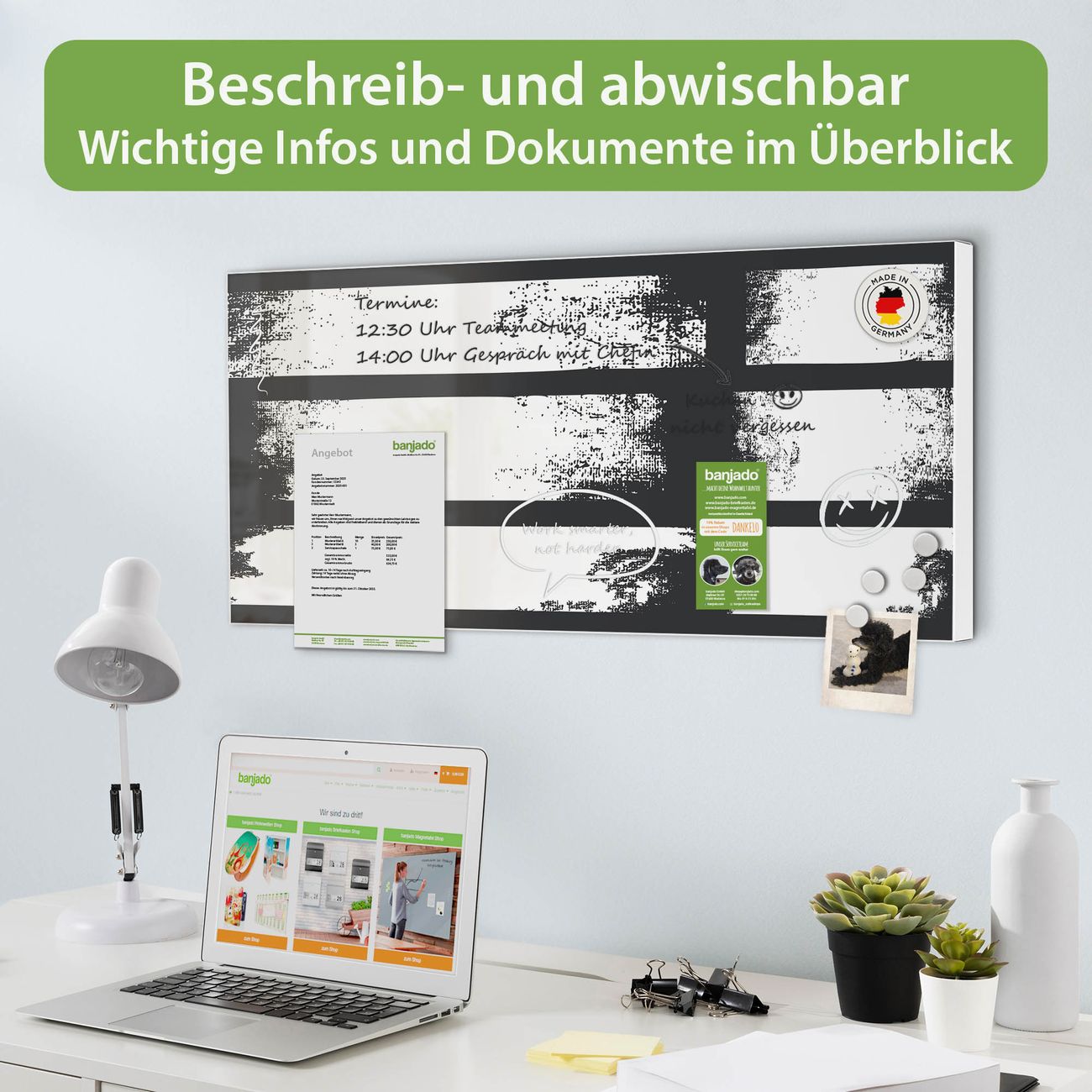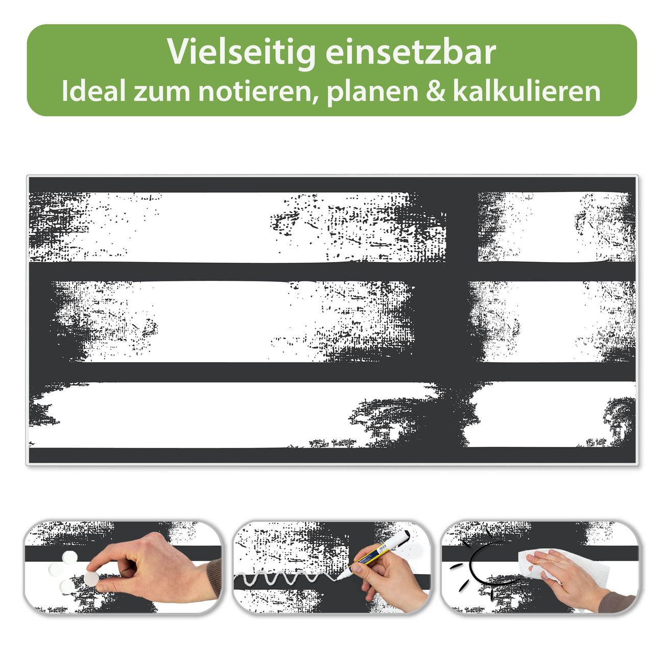 FUNKTION: Die banjado Magnettafel 78x37 cm im Design Motiv Grunge Streifen vereint Funktionalität und modernes Wohndesign auf stilvolle Weise. Diese hochwertige Magnetwand aus Metall hilft Ihnen dabei, Notizen, Fotos, Termine, Einkaufslisten oder Rezepte übersichtlich zu organisieren. Als praktisches Memoboard sorgt sie für Struktur im Alltag und setzt gleichzeitig einen dekorativen Akzent an Ihrer Wand. DESIGN: Die Metalltafel besteht aus robustem, lackiertem Stahl und ist mit allen handelsüblichen Magneten nutzbar. Besonders praktisch ist die beschreibbare Oberfläche. Sie können die Magnettafel ganz einfach mit Kreidestiften beschriften und die Inhalte bei Bedarf mit einem feuchten Tuch wieder entfernen. So eignet sich das Memoboard ideal für Wochenpläne, Menüpläne, To Do Listen oder kreative Botschaften. DETAILS: Mit ihrem großzügigen Querformat von 78x37 cm bietet die Magnettafel ausreichend Platz für Ihre Organisation. Das Motiv Motiv Grunge Streifen bringt eine warme, natürliche Optik in Küche, Flur, Büro oder Homeoffice und wirkt auch ohne Magnete oder Beschriftung wie ein modernes Wandbild. NUTZEN: Auf der Rückseite befinden sich vorgefertigte Löcher für eine schnelle und unkomplizierte Wandmontage. Jede banjado Magnettafel wird in Deutschland gefertigt und steht für Qualität, Langlebigkeit und liebevolle Verarbeitung. Dieses beschreibbare Memoboard ist die perfekte Kombination aus Metalltafel, Designobjekt und praktischer Magnetwand für Ihren Alltag. BANJADO: Wir sind ein kleines Team aus dem Herzen von Sachsen. Wir fertigen alle Artikel von Hand für Sie an, Sie erhalten keine preiswerte Importware. Auf Wunsch können Sie auch Ihr eigenes Foto auf die Magnettafel aufbringen, schreiben Sie uns an. Herzlichst, Ihr banjado-Team