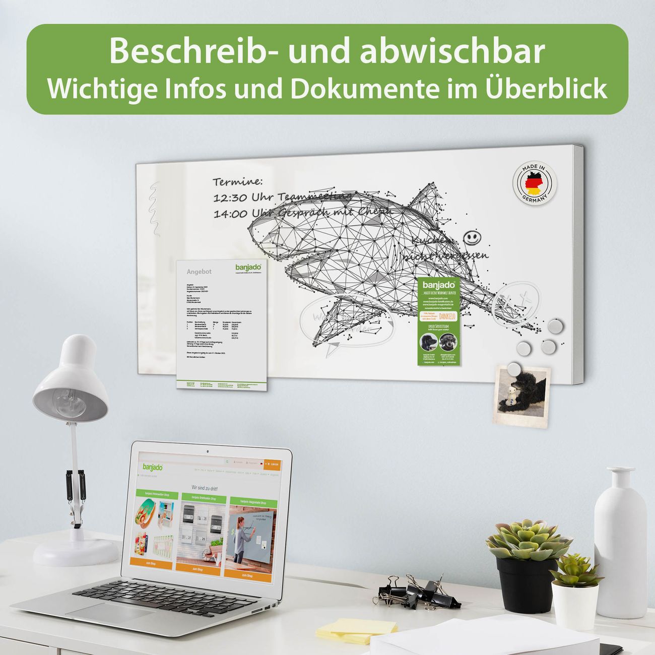 FUNKTION: Die banjado Magnettafel 78x37 cm im Design Motiv Hai abstrakt 2 vereint Funktionalität und modernes Wohndesign auf stilvolle Weise. Diese hochwertige Magnetwand aus Metall hilft Ihnen dabei, Notizen, Fotos, Termine, Einkaufslisten oder Rezepte übersichtlich zu organisieren. Als praktisches Memoboard sorgt sie für Struktur im Alltag und setzt gleichzeitig einen dekorativen Akzent an Ihrer Wand. DESIGN: Die Metalltafel besteht aus robustem, lackiertem Stahl und ist mit allen handelsüblichen Magneten nutzbar. Besonders praktisch ist die beschreibbare Oberfläche. Sie können die Magnettafel ganz einfach mit Kreidestiften beschriften und die Inhalte bei Bedarf mit einem feuchten Tuch wieder entfernen. So eignet sich das Memoboard ideal für Wochenpläne, Menüpläne, To Do Listen oder kreative Botschaften. DETAILS: Mit ihrem großzügigen Querformat von 78x37 cm bietet die Magnettafel ausreichend Platz für Ihre Organisation. Das Motiv Motiv Hai abstrakt 2 bringt eine warme, natürliche Optik in Küche, Flur, Büro oder Homeoffice und wirkt auch ohne Magnete oder Beschriftung wie ein modernes Wandbild. NUTZEN: Auf der Rückseite befinden sich vorgefertigte Löcher für eine schnelle und unkomplizierte Wandmontage. Jede banjado Magnettafel wird in Deutschland gefertigt und steht für Qualität, Langlebigkeit und liebevolle Verarbeitung. Dieses beschreibbare Memoboard ist die perfekte Kombination aus Metalltafel, Designobjekt und praktischer Magnetwand für Ihren Alltag. BANJADO: Wir sind ein kleines Team aus dem Herzen von Sachsen. Wir fertigen alle Artikel von Hand für Sie an, Sie erhalten keine preiswerte Importware. Auf Wunsch können Sie auch Ihr eigenes Foto auf die Magnettafel aufbringen, schreiben Sie uns an. Herzlichst, Ihr banjado-Team