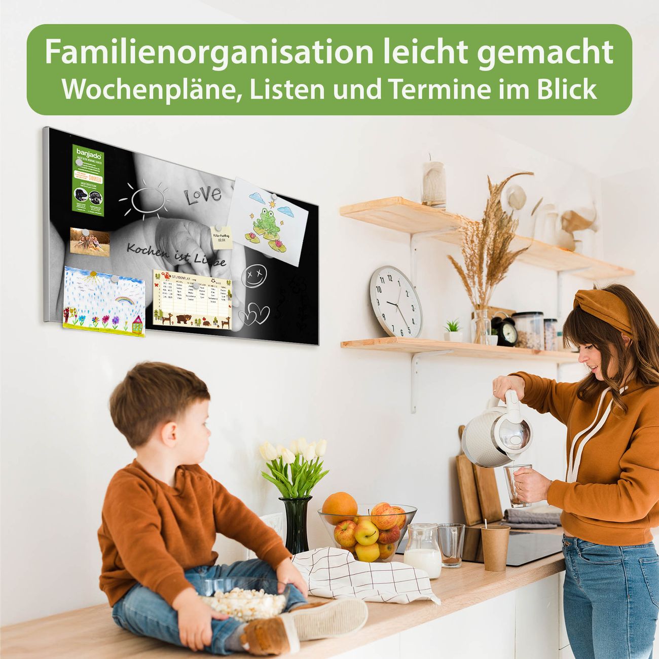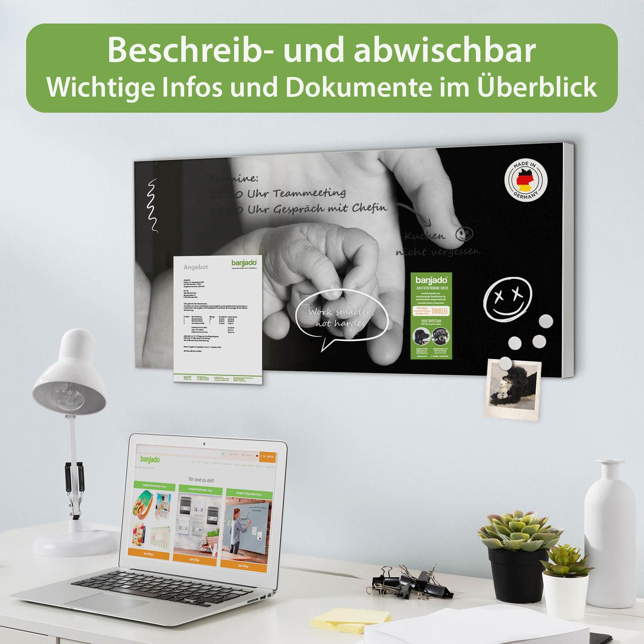 FUNKTION: Die banjado Magnettafel 78x37 cm im Design Motiv Hands vereint Funktionalität und modernes Wohndesign auf stilvolle Weise. Diese hochwertige Magnetwand aus Metall hilft Ihnen dabei, Notizen, Fotos, Termine, Einkaufslisten oder Rezepte übersichtlich zu organisieren. Als praktisches Memoboard sorgt sie für Struktur im Alltag und setzt gleichzeitig einen dekorativen Akzent an Ihrer Wand. DESIGN: Die Metalltafel besteht aus robustem, lackiertem Stahl und ist mit allen handelsüblichen Magneten nutzbar. Besonders praktisch ist die beschreibbare Oberfläche. Sie können die Magnettafel ganz einfach mit Kreidestiften beschriften und die Inhalte bei Bedarf mit einem feuchten Tuch wieder entfernen. So eignet sich das Memoboard ideal für Wochenpläne, Menüpläne, To Do Listen oder kreative Botschaften. DETAILS: Mit ihrem großzügigen Querformat von 78x37 cm bietet die Magnettafel ausreichend Platz für Ihre Organisation. Das Motiv Motiv Hands bringt eine warme, natürliche Optik in Küche, Flur, Büro oder Homeoffice und wirkt auch ohne Magnete oder Beschriftung wie ein modernes Wandbild. NUTZEN: Auf der Rückseite befinden sich vorgefertigte Löcher für eine schnelle und unkomplizierte Wandmontage. Jede banjado Magnettafel wird in Deutschland gefertigt und steht für Qualität, Langlebigkeit und liebevolle Verarbeitung. Dieses beschreibbare Memoboard ist die perfekte Kombination aus Metalltafel, Designobjekt und praktischer Magnetwand für Ihren Alltag. BANJADO: Wir sind ein kleines Team aus dem Herzen von Sachsen. Wir fertigen alle Artikel von Hand für Sie an, Sie erhalten keine preiswerte Importware. Auf Wunsch können Sie auch Ihr eigenes Foto auf die Magnettafel aufbringen, schreiben Sie uns an. Herzlichst, Ihr banjado-Team