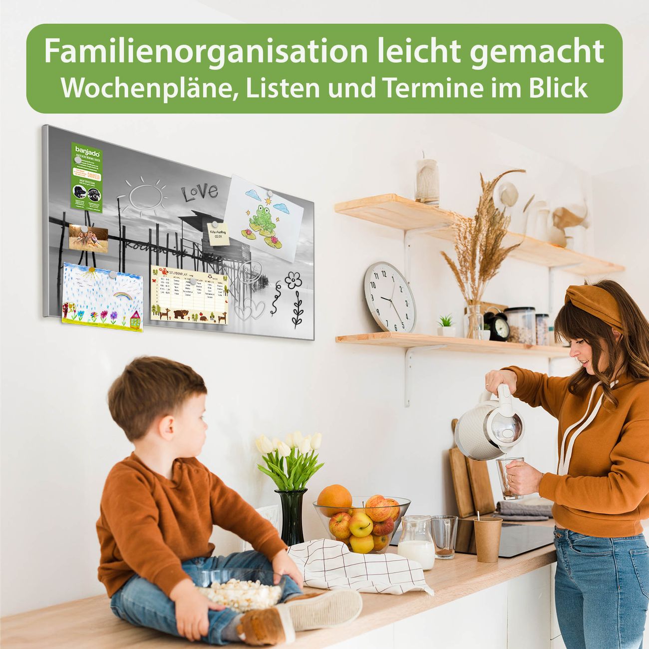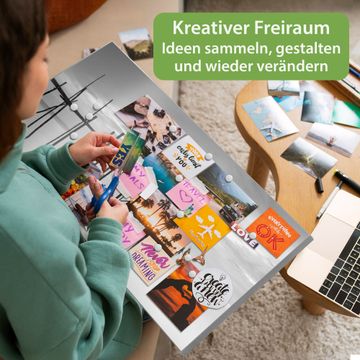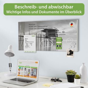 FUNKTION: Die banjado Magnettafel 78x37 cm im Design Motiv Haus am See vereint Funktionalität und modernes Wohndesign auf stilvolle Weise. Diese hochwertige Magnetwand aus Metall hilft Ihnen dabei, Notizen, Fotos, Termine, Einkaufslisten oder Rezepte übersichtlich zu organisieren. Als praktisches Memoboard sorgt sie für Struktur im Alltag und setzt gleichzeitig einen dekorativen Akzent an Ihrer Wand. DESIGN: Die Metalltafel besteht aus robustem, lackiertem Stahl und ist mit allen handelsüblichen Magneten nutzbar. Besonders praktisch ist die beschreibbare Oberfläche. Sie können die Magnettafel ganz einfach mit Kreidestiften beschriften und die Inhalte bei Bedarf mit einem feuchten Tuch wieder entfernen. So eignet sich das Memoboard ideal für Wochenpläne, Menüpläne, To Do Listen oder kreative Botschaften. DETAILS: Mit ihrem großzügigen Querformat von 78x37 cm bietet die Magnettafel ausreichend Platz für Ihre Organisation. Das Motiv Motiv Haus am See bringt eine warme, natürliche Optik in Küche, Flur, Büro oder Homeoffice und wirkt auch ohne Magnete oder Beschriftung wie ein modernes Wandbild. NUTZEN: Auf der Rückseite befinden sich vorgefertigte Löcher für eine schnelle und unkomplizierte Wandmontage. Jede banjado Magnettafel wird in Deutschland gefertigt und steht für Qualität, Langlebigkeit und liebevolle Verarbeitung. Dieses beschreibbare Memoboard ist die perfekte Kombination aus Metalltafel, Designobjekt und praktischer Magnetwand für Ihren Alltag. BANJADO: Wir sind ein kleines Team aus dem Herzen von Sachsen. Wir fertigen alle Artikel von Hand für Sie an, Sie erhalten keine preiswerte Importware. Auf Wunsch können Sie auch Ihr eigenes Foto auf die Magnettafel aufbringen, schreiben Sie uns an. Herzlichst, Ihr banjado-Team