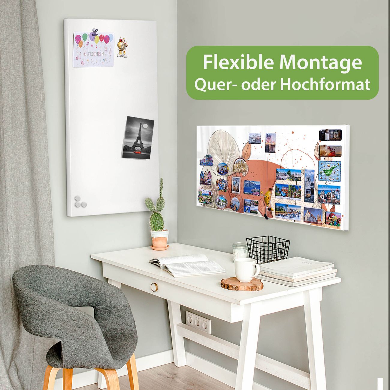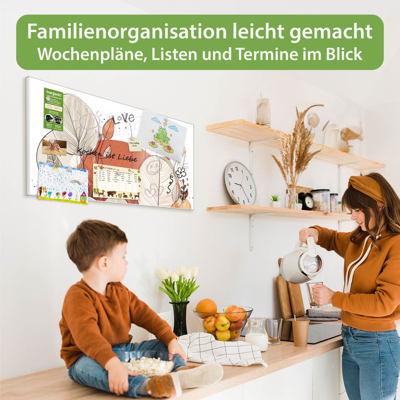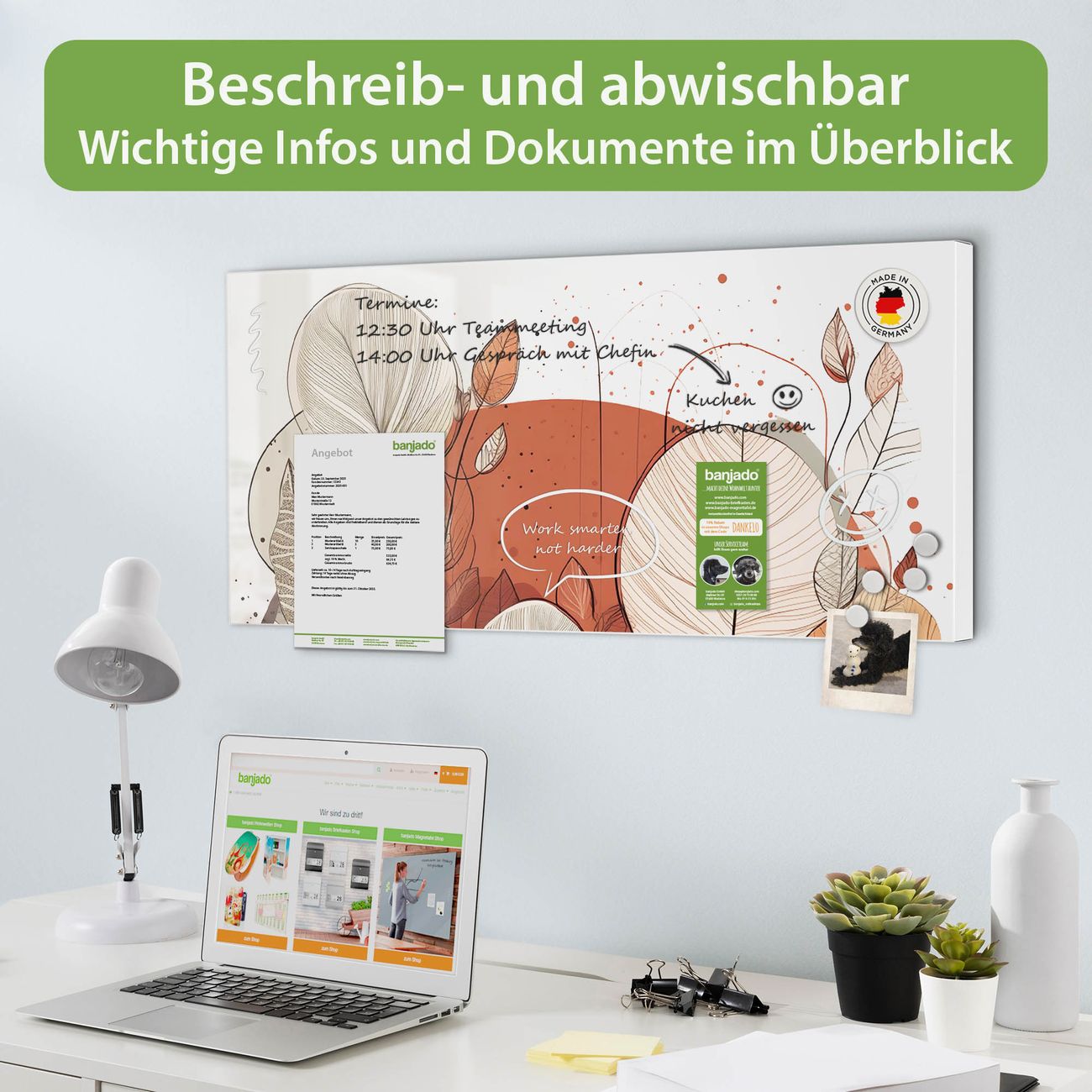 FUNKTION: Die banjado Magnettafel 78x37 cm im Design Motiv Herbstliche Blätterpracht vereint Funktionalität und modernes Wohndesign auf stilvolle Weise. Diese hochwertige Magnetwand aus Metall hilft Ihnen dabei, Notizen, Fotos, Termine, Einkaufslisten oder Rezepte übersichtlich zu organisieren. Als praktisches Memoboard sorgt sie für Struktur im Alltag und setzt gleichzeitig einen dekorativen Akzent an Ihrer Wand. DESIGN: Die Metalltafel besteht aus robustem, lackiertem Stahl und ist mit allen handelsüblichen Magneten nutzbar. Besonders praktisch ist die beschreibbare Oberfläche. Sie können die Magnettafel ganz einfach mit Kreidestiften beschriften und die Inhalte bei Bedarf mit einem feuchten Tuch wieder entfernen. So eignet sich das Memoboard ideal für Wochenpläne, Menüpläne, To Do Listen oder kreative Botschaften. DETAILS: Mit ihrem großzügigen Querformat von 78x37 cm bietet die Magnettafel ausreichend Platz für Ihre Organisation. Das Motiv Motiv Herbstliche Blätterpracht bringt eine warme, natürliche Optik in Küche, Flur, Büro oder Homeoffice und wirkt auch ohne Magnete oder Beschriftung wie ein modernes Wandbild. NUTZEN: Auf der Rückseite befinden sich vorgefertigte Löcher für eine schnelle und unkomplizierte Wandmontage. Jede banjado Magnettafel wird in Deutschland gefertigt und steht für Qualität, Langlebigkeit und liebevolle Verarbeitung. Dieses beschreibbare Memoboard ist die perfekte Kombination aus Metalltafel, Designobjekt und praktischer Magnetwand für Ihren Alltag. BANJADO: Wir sind ein kleines Team aus dem Herzen von Sachsen. Wir fertigen alle Artikel von Hand für Sie an, Sie erhalten keine preiswerte Importware. Auf Wunsch können Sie auch Ihr eigenes Foto auf die Magnettafel aufbringen, schreiben Sie uns an. Herzlichst, Ihr banjado-Team