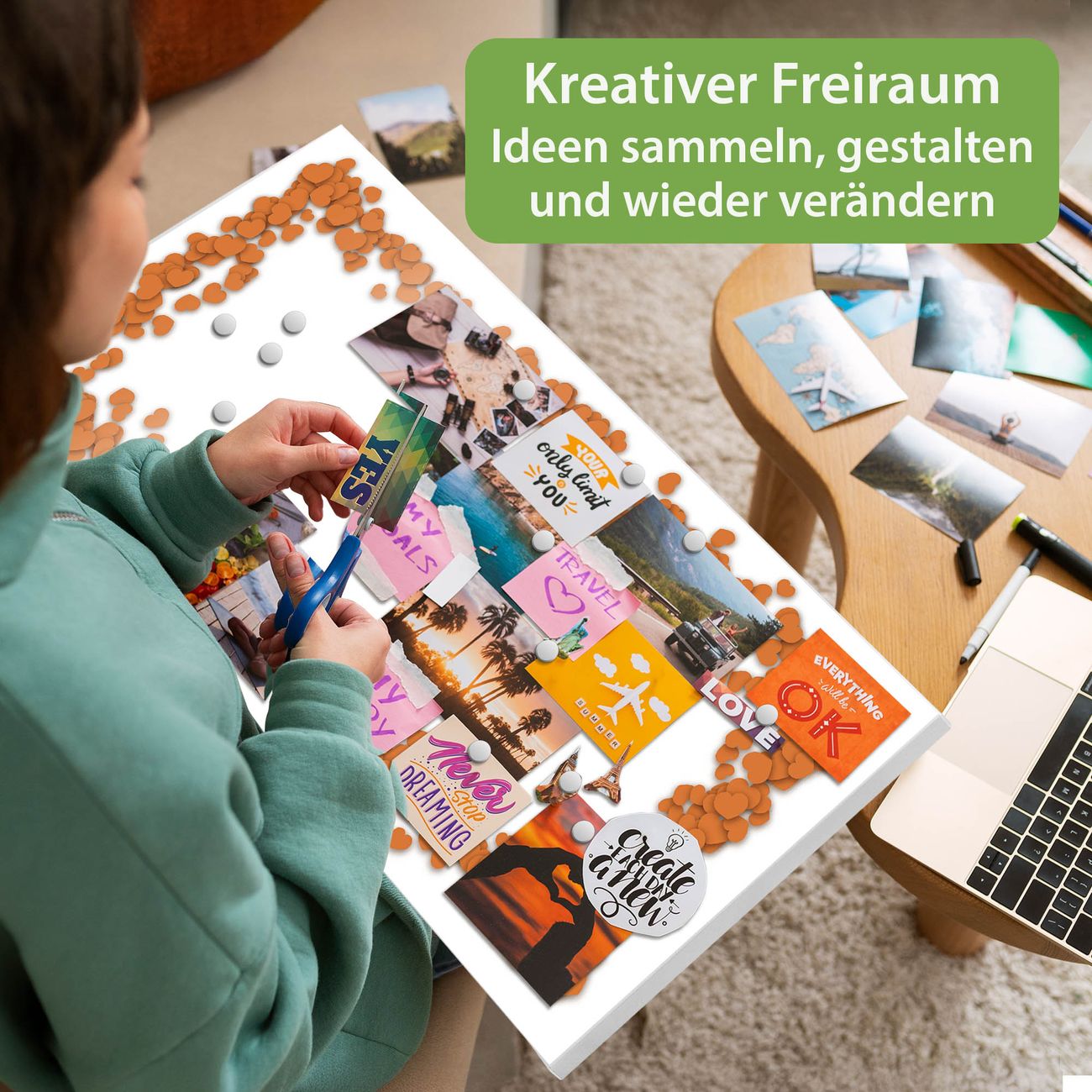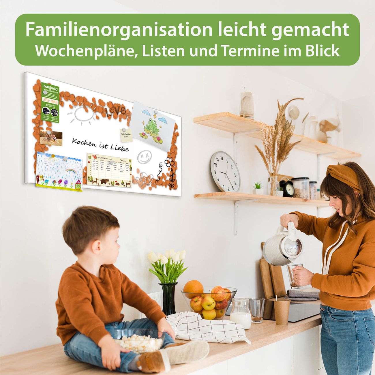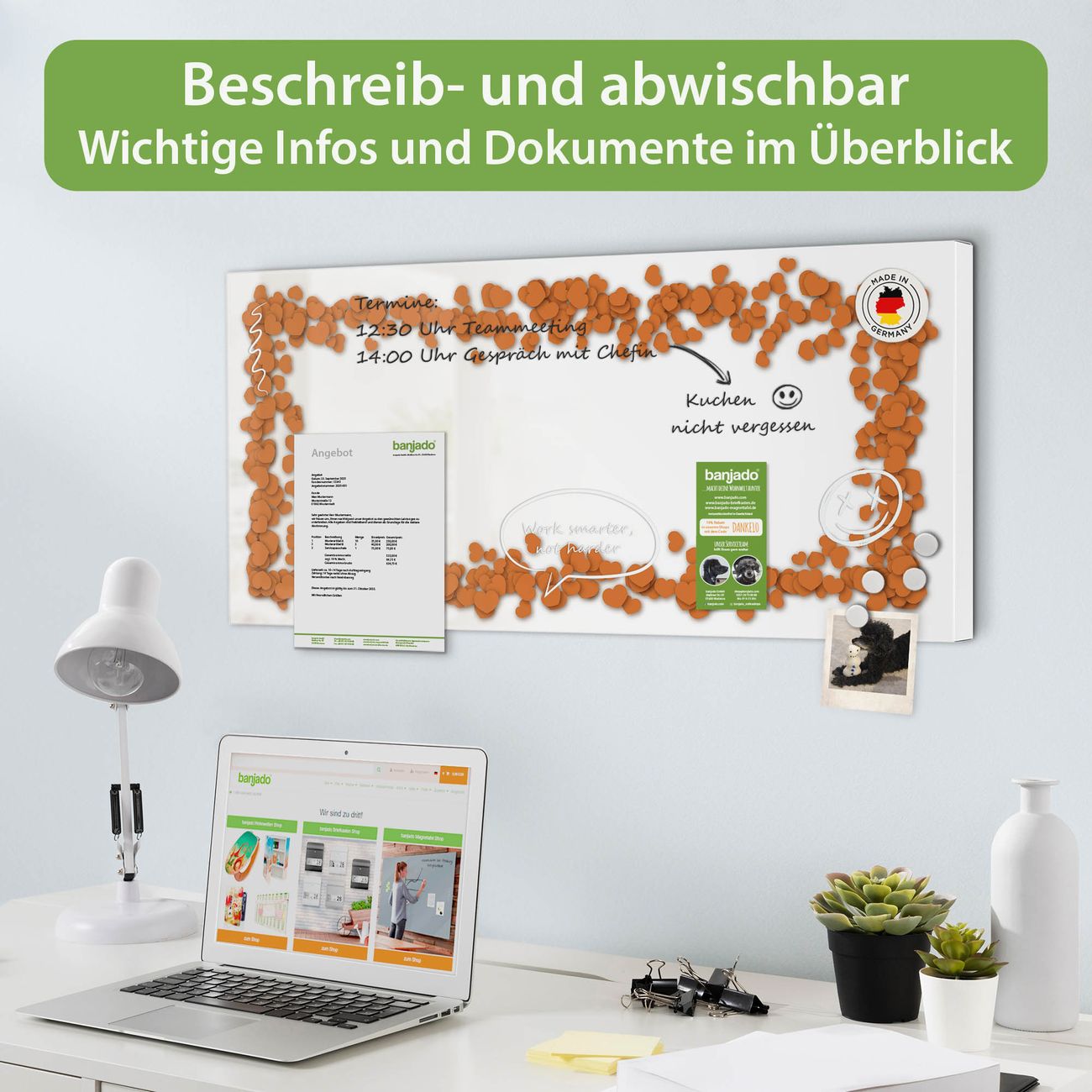FUNKTION: Die banjado Magnettafel 78x37 cm im Design Motiv Herzrahmen in Orange vereint Funktionalität und modernes Wohndesign auf stilvolle Weise. Diese hochwertige Magnetwand aus Metall hilft Ihnen dabei, Notizen, Fotos, Termine, Einkaufslisten oder Rezepte übersichtlich zu organisieren. Als praktisches Memoboard sorgt sie für Struktur im Alltag und setzt gleichzeitig einen dekorativen Akzent an Ihrer Wand. DESIGN: Die Metalltafel besteht aus robustem, lackiertem Stahl und ist mit allen handelsüblichen Magneten nutzbar. Besonders praktisch ist die beschreibbare Oberfläche. Sie können die Magnettafel ganz einfach mit Kreidestiften beschriften und die Inhalte bei Bedarf mit einem feuchten Tuch wieder entfernen. So eignet sich das Memoboard ideal für Wochenpläne, Menüpläne, To Do Listen oder kreative Botschaften. DETAILS: Mit ihrem großzügigen Querformat von 78x37 cm bietet die Magnettafel ausreichend Platz für Ihre Organisation. Das Motiv Motiv Herzrahmen in Orange bringt eine warme, natürliche Optik in Küche, Flur, Büro oder Homeoffice und wirkt auch ohne Magnete oder Beschriftung wie ein modernes Wandbild. NUTZEN: Auf der Rückseite befinden sich vorgefertigte Löcher für eine schnelle und unkomplizierte Wandmontage. Jede banjado Magnettafel wird in Deutschland gefertigt und steht für Qualität, Langlebigkeit und liebevolle Verarbeitung. Dieses beschreibbare Memoboard ist die perfekte Kombination aus Metalltafel, Designobjekt und praktischer Magnetwand für Ihren Alltag. BANJADO: Wir sind ein kleines Team aus dem Herzen von Sachsen. Wir fertigen alle Artikel von Hand für Sie an, Sie erhalten keine preiswerte Importware. Auf Wunsch können Sie auch Ihr eigenes Foto auf die Magnettafel aufbringen, schreiben Sie uns an. Herzlichst, Ihr banjado-Team