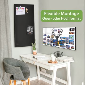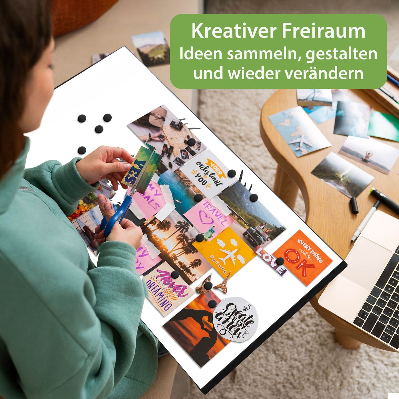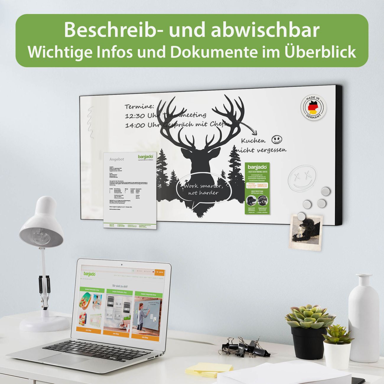 FUNKTION: Die banjado Magnettafel 78x37 cm im Design Motiv Hirsch im Wald Silhouette vereint Funktionalität und modernes Wohndesign auf stilvolle Weise. Diese hochwertige Magnetwand aus Metall hilft Ihnen dabei, Notizen, Fotos, Termine, Einkaufslisten oder Rezepte übersichtlich zu organisieren. Als praktisches Memoboard sorgt sie für Struktur im Alltag und setzt gleichzeitig einen dekorativen Akzent an Ihrer Wand. DESIGN: Die Metalltafel besteht aus robustem, lackiertem Stahl und ist mit allen handelsüblichen Magneten nutzbar. Besonders praktisch ist die beschreibbare Oberfläche. Sie können die Magnettafel ganz einfach mit Kreidestiften beschriften und die Inhalte bei Bedarf mit einem feuchten Tuch wieder entfernen. So eignet sich das Memoboard ideal für Wochenpläne, Menüpläne, To Do Listen oder kreative Botschaften. DETAILS: Mit ihrem großzügigen Querformat von 78x37 cm bietet die Magnettafel ausreichend Platz für Ihre Organisation. Das Motiv Motiv Hirsch im Wald Silhouette bringt eine warme, natürliche Optik in Küche, Flur, Büro oder Homeoffice und wirkt auch ohne Magnete oder Beschriftung wie ein modernes Wandbild. NUTZEN: Auf der Rückseite befinden sich vorgefertigte Löcher für eine schnelle und unkomplizierte Wandmontage. Jede banjado Magnettafel wird in Deutschland gefertigt und steht für Qualität, Langlebigkeit und liebevolle Verarbeitung. Dieses beschreibbare Memoboard ist die perfekte Kombination aus Metalltafel, Designobjekt und praktischer Magnetwand für Ihren Alltag. BANJADO: Wir sind ein kleines Team aus dem Herzen von Sachsen. Wir fertigen alle Artikel von Hand für Sie an, Sie erhalten keine preiswerte Importware. Auf Wunsch können Sie auch Ihr eigenes Foto auf die Magnettafel aufbringen, schreiben Sie uns an. Herzlichst, Ihr banjado-Team