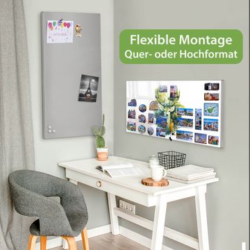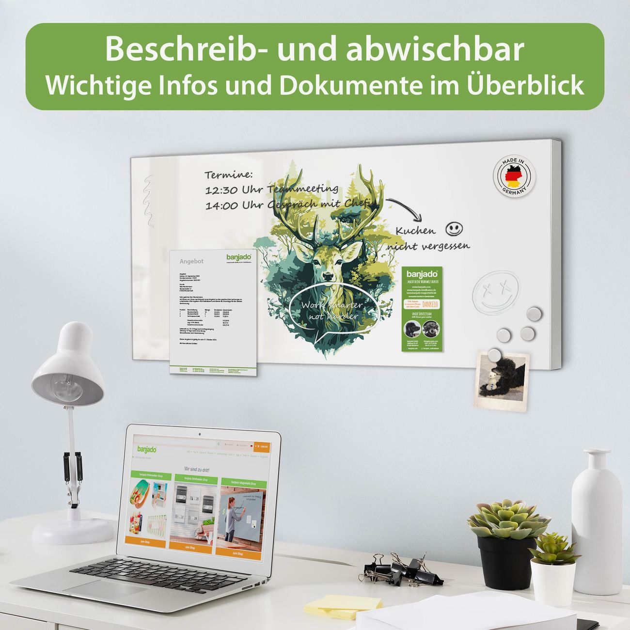 FUNKTION: Die banjado Magnettafel 78x37 cm im Design Motiv Hirsch Wald Aquarell vereint Funktionalität und modernes Wohndesign auf stilvolle Weise. Diese hochwertige Magnetwand aus Metall hilft Ihnen dabei, Notizen, Fotos, Termine, Einkaufslisten oder Rezepte übersichtlich zu organisieren. Als praktisches Memoboard sorgt sie für Struktur im Alltag und setzt gleichzeitig einen dekorativen Akzent an Ihrer Wand. DESIGN: Die Metalltafel besteht aus robustem, lackiertem Stahl und ist mit allen handelsüblichen Magneten nutzbar. Besonders praktisch ist die beschreibbare Oberfläche. Sie können die Magnettafel ganz einfach mit Kreidestiften beschriften und die Inhalte bei Bedarf mit einem feuchten Tuch wieder entfernen. So eignet sich das Memoboard ideal für Wochenpläne, Menüpläne, To Do Listen oder kreative Botschaften. DETAILS: Mit ihrem großzügigen Querformat von 78x37 cm bietet die Magnettafel ausreichend Platz für Ihre Organisation. Das Motiv Motiv Hirsch Wald Aquarell bringt eine warme, natürliche Optik in Küche, Flur, Büro oder Homeoffice und wirkt auch ohne Magnete oder Beschriftung wie ein modernes Wandbild. NUTZEN: Auf der Rückseite befinden sich vorgefertigte Löcher für eine schnelle und unkomplizierte Wandmontage. Jede banjado Magnettafel wird in Deutschland gefertigt und steht für Qualität, Langlebigkeit und liebevolle Verarbeitung. Dieses beschreibbare Memoboard ist die perfekte Kombination aus Metalltafel, Designobjekt und praktischer Magnetwand für Ihren Alltag. BANJADO: Wir sind ein kleines Team aus dem Herzen von Sachsen. Wir fertigen alle Artikel von Hand für Sie an, Sie erhalten keine preiswerte Importware. Auf Wunsch können Sie auch Ihr eigenes Foto auf die Magnettafel aufbringen, schreiben Sie uns an. Herzlichst, Ihr banjado-Team