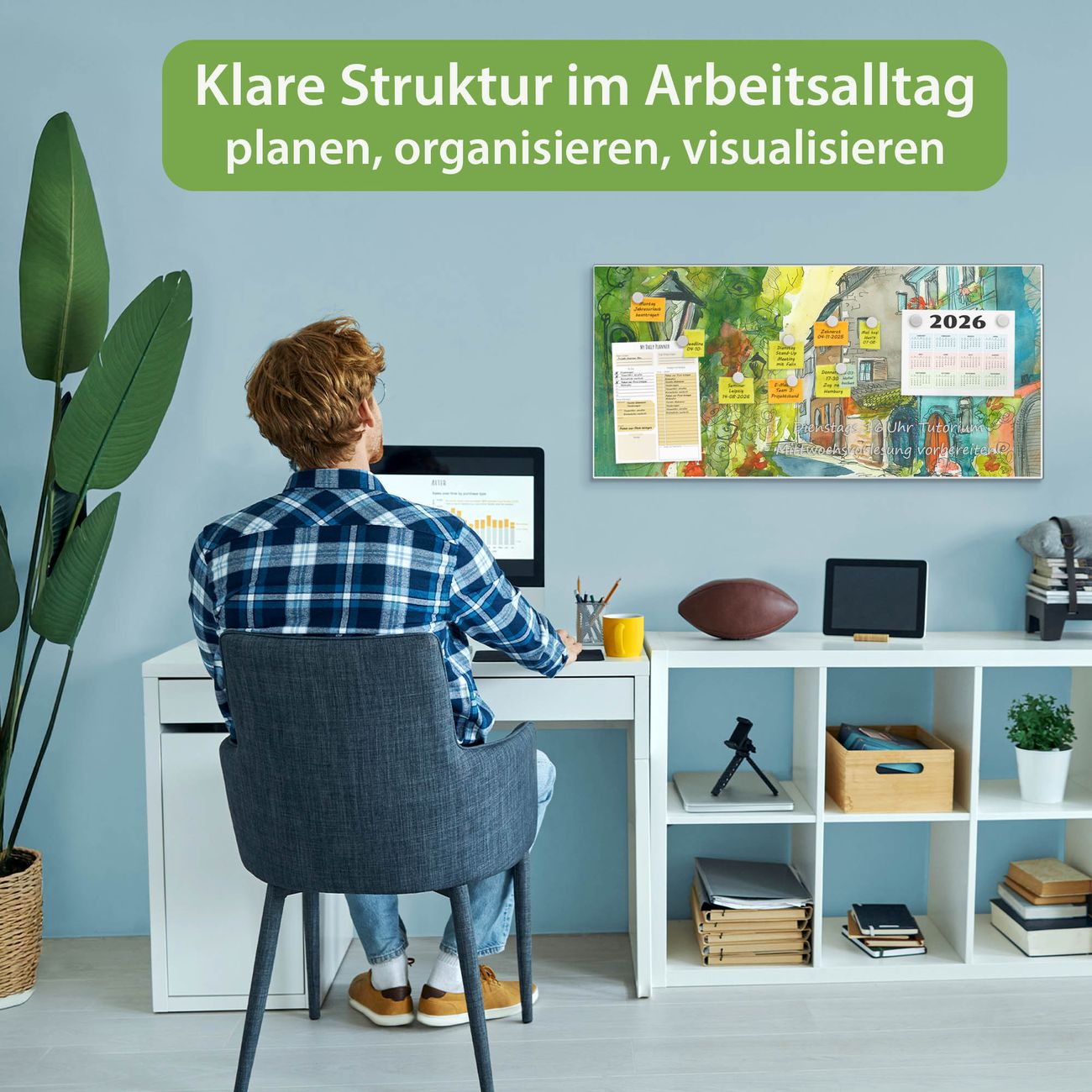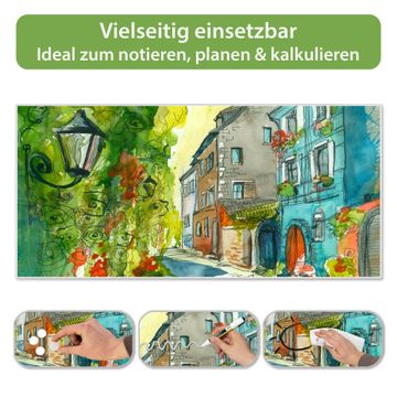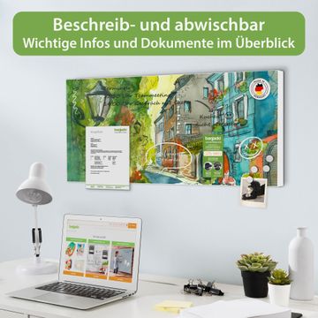 FUNKTION: Die banjado Magnettafel 78x37 cm im Design Motiv Historischer Stadtkern vereint Funktionalität und modernes Wohndesign auf stilvolle Weise. Diese hochwertige Magnetwand aus Metall hilft Ihnen dabei, Notizen, Fotos, Termine, Einkaufslisten oder Rezepte übersichtlich zu organisieren. Als praktisches Memoboard sorgt sie für Struktur im Alltag und setzt gleichzeitig einen dekorativen Akzent an Ihrer Wand. DESIGN: Die Metalltafel besteht aus robustem, lackiertem Stahl und ist mit allen handelsüblichen Magneten nutzbar. Besonders praktisch ist die beschreibbare Oberfläche. Sie können die Magnettafel ganz einfach mit Kreidestiften beschriften und die Inhalte bei Bedarf mit einem feuchten Tuch wieder entfernen. So eignet sich das Memoboard ideal für Wochenpläne, Menüpläne, To Do Listen oder kreative Botschaften. DETAILS: Mit ihrem großzügigen Querformat von 78x37 cm bietet die Magnettafel ausreichend Platz für Ihre Organisation. Das Motiv Motiv Historischer Stadtkern bringt eine warme, natürliche Optik in Küche, Flur, Büro oder Homeoffice und wirkt auch ohne Magnete oder Beschriftung wie ein modernes Wandbild. NUTZEN: Auf der Rückseite befinden sich vorgefertigte Löcher für eine schnelle und unkomplizierte Wandmontage. Jede banjado Magnettafel wird in Deutschland gefertigt und steht für Qualität, Langlebigkeit und liebevolle Verarbeitung. Dieses beschreibbare Memoboard ist die perfekte Kombination aus Metalltafel, Designobjekt und praktischer Magnetwand für Ihren Alltag. BANJADO: Wir sind ein kleines Team aus dem Herzen von Sachsen. Wir fertigen alle Artikel von Hand für Sie an, Sie erhalten keine preiswerte Importware. Auf Wunsch können Sie auch Ihr eigenes Foto auf die Magnettafel aufbringen, schreiben Sie uns an. Herzlichst, Ihr banjado-Team