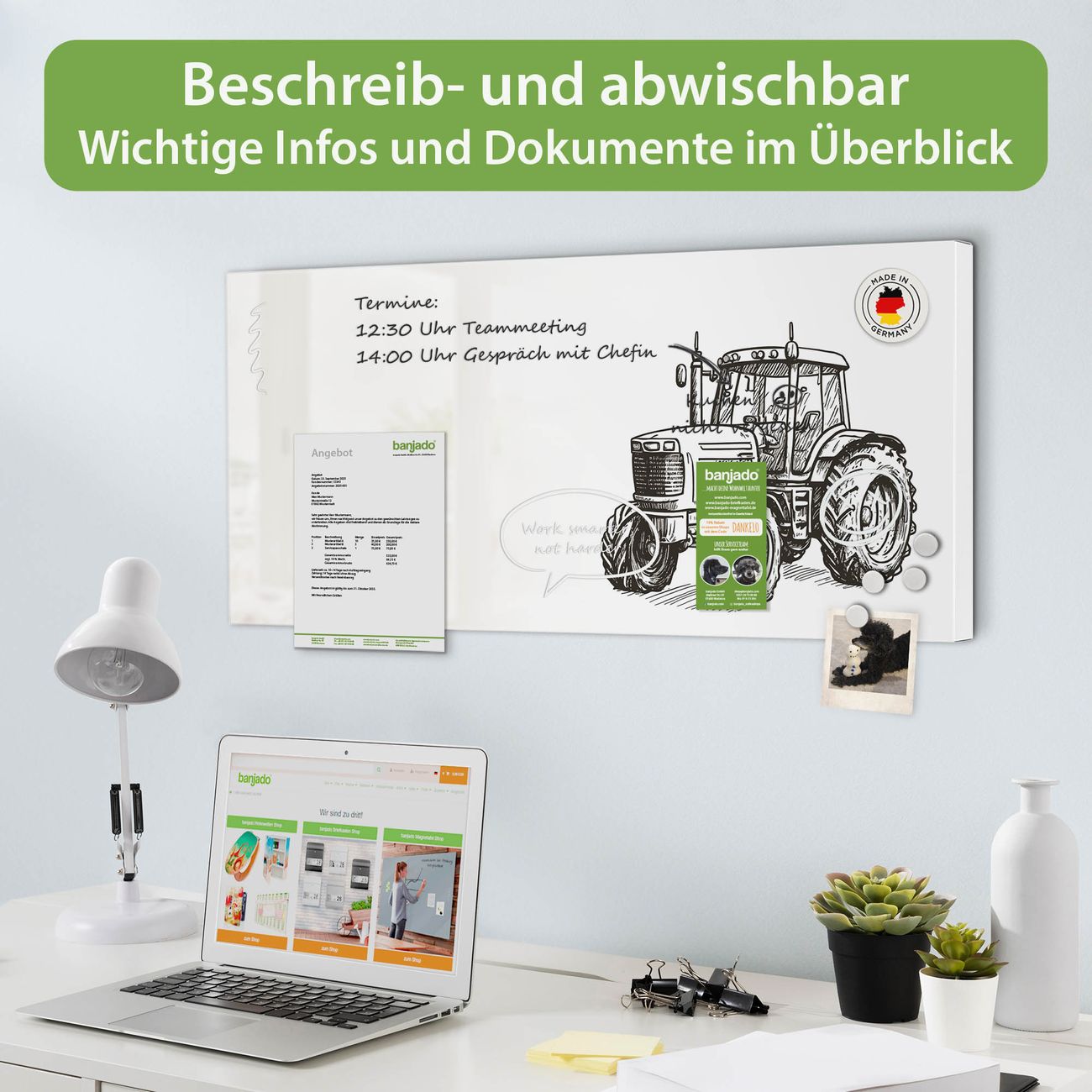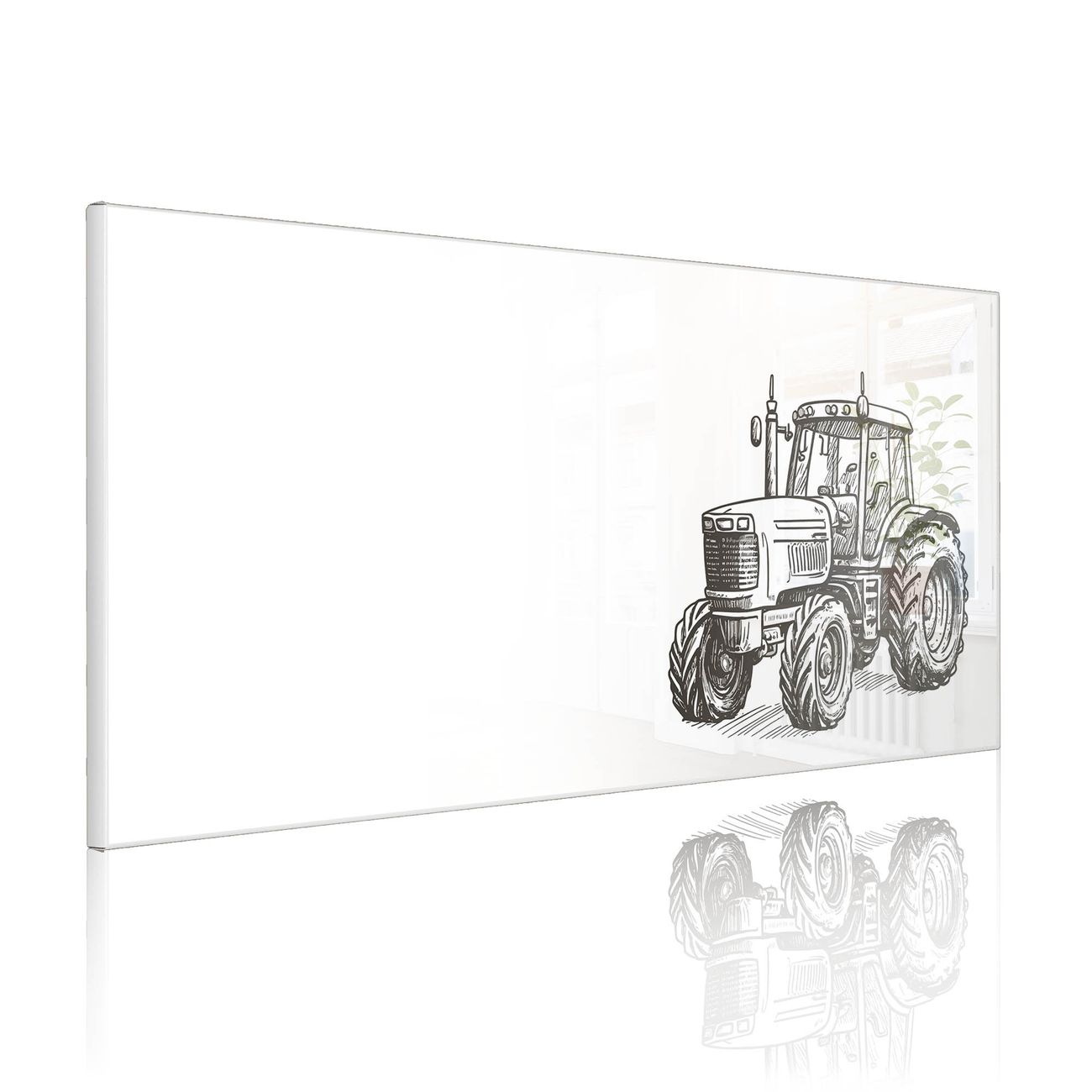 FUNKTION: Die banjado Magnettafel 78x37 cm im Design Motiv Historischer Traktor vereint Funktionalität und modernes Wohndesign auf stilvolle Weise. Diese hochwertige Magnetwand aus Metall hilft Ihnen dabei, Notizen, Fotos, Termine, Einkaufslisten oder Rezepte übersichtlich zu organisieren. Als praktisches Memoboard sorgt sie für Struktur im Alltag und setzt gleichzeitig einen dekorativen Akzent an Ihrer Wand. DESIGN: Die Metalltafel besteht aus robustem, lackiertem Stahl und ist mit allen handelsüblichen Magneten nutzbar. Besonders praktisch ist die beschreibbare Oberfläche. Sie können die Magnettafel ganz einfach mit Kreidestiften beschriften und die Inhalte bei Bedarf mit einem feuchten Tuch wieder entfernen. So eignet sich das Memoboard ideal für Wochenpläne, Menüpläne, To Do Listen oder kreative Botschaften. DETAILS: Mit ihrem großzügigen Querformat von 78x37 cm bietet die Magnettafel ausreichend Platz für Ihre Organisation. Das Motiv Motiv Historischer Traktor bringt eine warme, natürliche Optik in Küche, Flur, Büro oder Homeoffice und wirkt auch ohne Magnete oder Beschriftung wie ein modernes Wandbild. NUTZEN: Auf der Rückseite befinden sich vorgefertigte Löcher für eine schnelle und unkomplizierte Wandmontage. Jede banjado Magnettafel wird in Deutschland gefertigt und steht für Qualität, Langlebigkeit und liebevolle Verarbeitung. Dieses beschreibbare Memoboard ist die perfekte Kombination aus Metalltafel, Designobjekt und praktischer Magnetwand für Ihren Alltag. BANJADO: Wir sind ein kleines Team aus dem Herzen von Sachsen. Wir fertigen alle Artikel von Hand für Sie an, Sie erhalten keine preiswerte Importware. Auf Wunsch können Sie auch Ihr eigenes Foto auf die Magnettafel aufbringen, schreiben Sie uns an. Herzlichst, Ihr banjado-Team