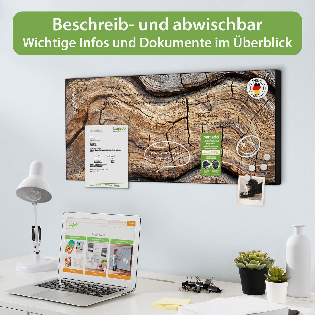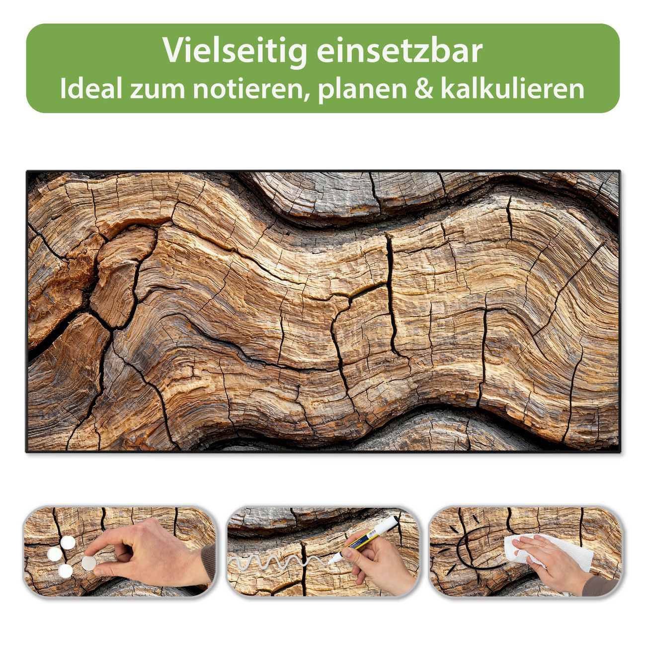 FUNKTION: Die banjado Magnettafel 78x37 cm im Design Motiv Holz Gemasert Fluss Grau vereint Funktionalität und modernes Wohndesign auf stilvolle Weise. Diese hochwertige Magnetwand aus Metall hilft Ihnen dabei, Notizen, Fotos, Termine, Einkaufslisten oder Rezepte übersichtlich zu organisieren. Als praktisches Memoboard sorgt sie für Struktur im Alltag und setzt gleichzeitig einen dekorativen Akzent an Ihrer Wand. DESIGN: Die Metalltafel besteht aus robustem, lackiertem Stahl und ist mit allen handelsüblichen Magneten nutzbar. Besonders praktisch ist die beschreibbare Oberfläche. Sie können die Magnettafel ganz einfach mit Kreidestiften beschriften und die Inhalte bei Bedarf mit einem feuchten Tuch wieder entfernen. So eignet sich das Memoboard ideal für Wochenpläne, Menüpläne, To Do Listen oder kreative Botschaften. DETAILS: Mit ihrem großzügigen Querformat von 78x37 cm bietet die Magnettafel ausreichend Platz für Ihre Organisation. Das Motiv Motiv Holz Gemasert Fluss Grau bringt eine warme, natürliche Optik in Küche, Flur, Büro oder Homeoffice und wirkt auch ohne Magnete oder Beschriftung wie ein modernes Wandbild. NUTZEN: Auf der Rückseite befinden sich vorgefertigte Löcher für eine schnelle und unkomplizierte Wandmontage. Jede banjado Magnettafel wird in Deutschland gefertigt und steht für Qualität, Langlebigkeit und liebevolle Verarbeitung. Dieses beschreibbare Memoboard ist die perfekte Kombination aus Metalltafel, Designobjekt und praktischer Magnetwand für Ihren Alltag. BANJADO: Wir sind ein kleines Team aus dem Herzen von Sachsen. Wir fertigen alle Artikel von Hand für Sie an, Sie erhalten keine preiswerte Importware. Auf Wunsch können Sie auch Ihr eigenes Foto auf die Magnettafel aufbringen, schreiben Sie uns an. Herzlichst, Ihr banjado-Team