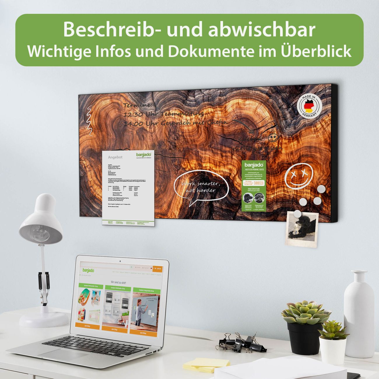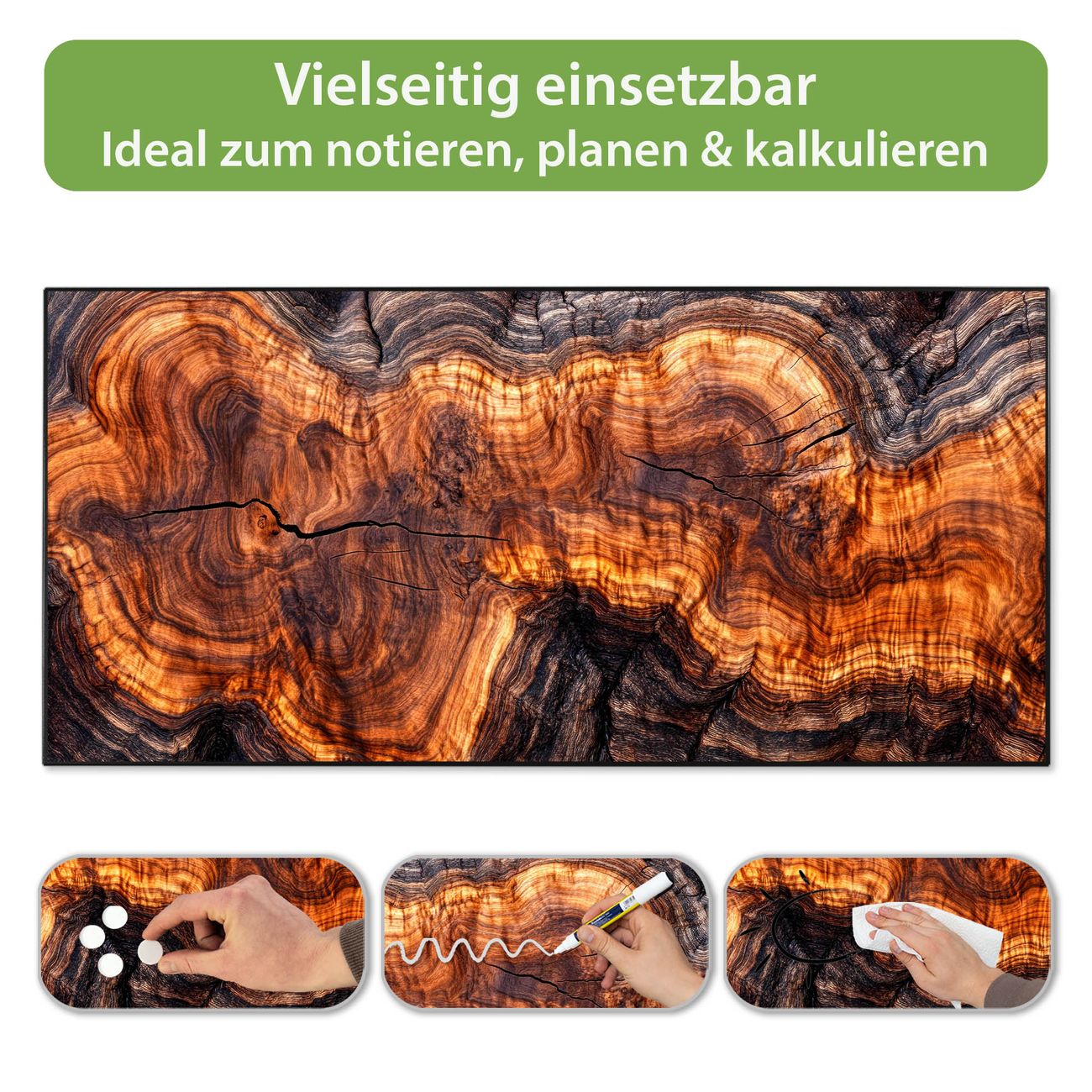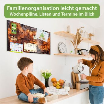 FUNKTION: Die banjado Magnettafel 78x37 cm im Design Motiv Holz Gemasert Fluss Warm vereint Funktionalität und modernes Wohndesign auf stilvolle Weise. Diese hochwertige Magnetwand aus Metall hilft Ihnen dabei, Notizen, Fotos, Termine, Einkaufslisten oder Rezepte übersichtlich zu organisieren. Als praktisches Memoboard sorgt sie für Struktur im Alltag und setzt gleichzeitig einen dekorativen Akzent an Ihrer Wand. DESIGN: Die Metalltafel besteht aus robustem, lackiertem Stahl und ist mit allen handelsüblichen Magneten nutzbar. Besonders praktisch ist die beschreibbare Oberfläche. Sie können die Magnettafel ganz einfach mit Kreidestiften beschriften und die Inhalte bei Bedarf mit einem feuchten Tuch wieder entfernen. So eignet sich das Memoboard ideal für Wochenpläne, Menüpläne, To Do Listen oder kreative Botschaften. DETAILS: Mit ihrem großzügigen Querformat von 78x37 cm bietet die Magnettafel ausreichend Platz für Ihre Organisation. Das Motiv Motiv Holz Gemasert Fluss Warm bringt eine warme, natürliche Optik in Küche, Flur, Büro oder Homeoffice und wirkt auch ohne Magnete oder Beschriftung wie ein modernes Wandbild. NUTZEN: Auf der Rückseite befinden sich vorgefertigte Löcher für eine schnelle und unkomplizierte Wandmontage. Jede banjado Magnettafel wird in Deutschland gefertigt und steht für Qualität, Langlebigkeit und liebevolle Verarbeitung. Dieses beschreibbare Memoboard ist die perfekte Kombination aus Metalltafel, Designobjekt und praktischer Magnetwand für Ihren Alltag. BANJADO: Wir sind ein kleines Team aus dem Herzen von Sachsen. Wir fertigen alle Artikel von Hand für Sie an, Sie erhalten keine preiswerte Importware. Auf Wunsch können Sie auch Ihr eigenes Foto auf die Magnettafel aufbringen, schreiben Sie uns an. Herzlichst, Ihr banjado-Team